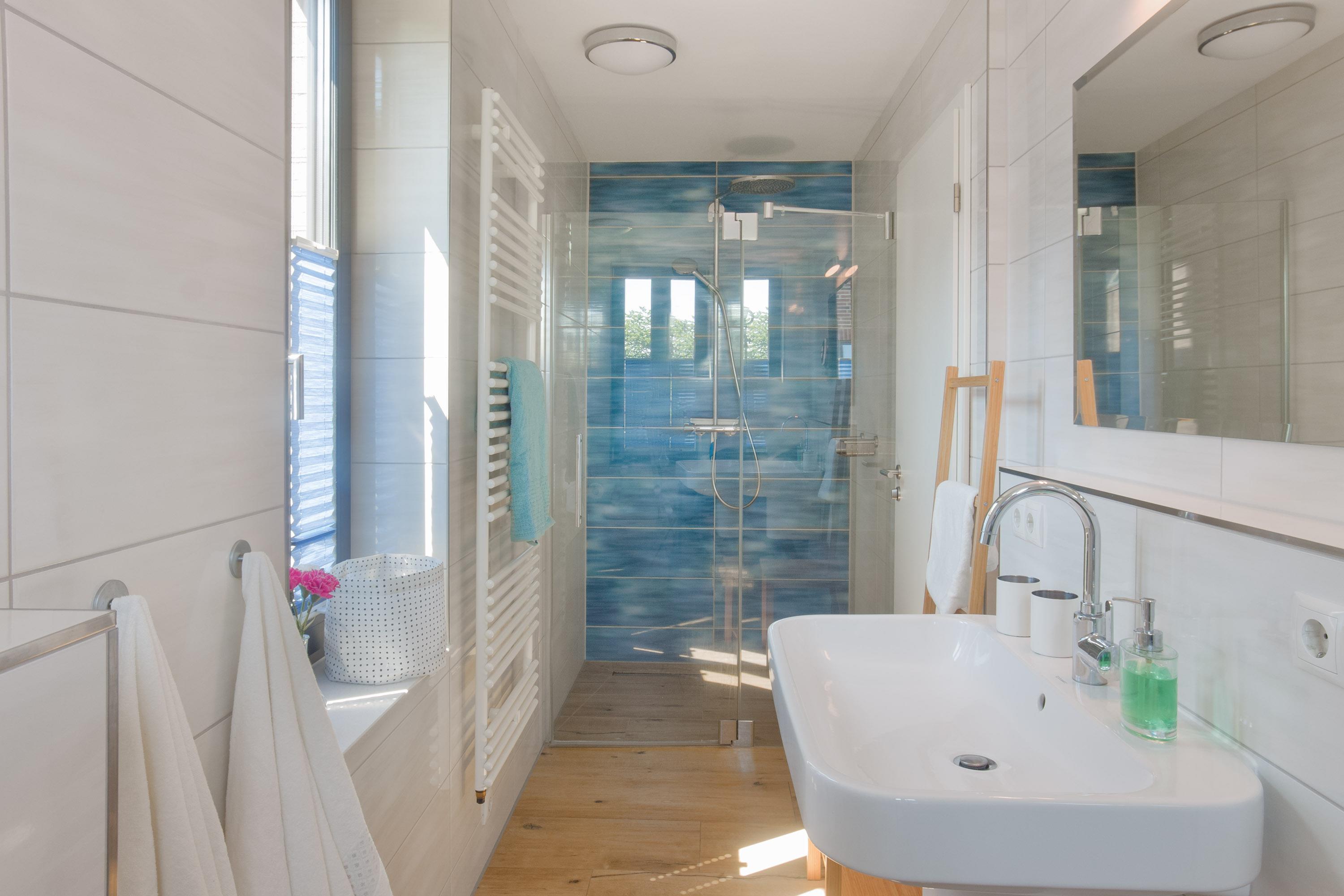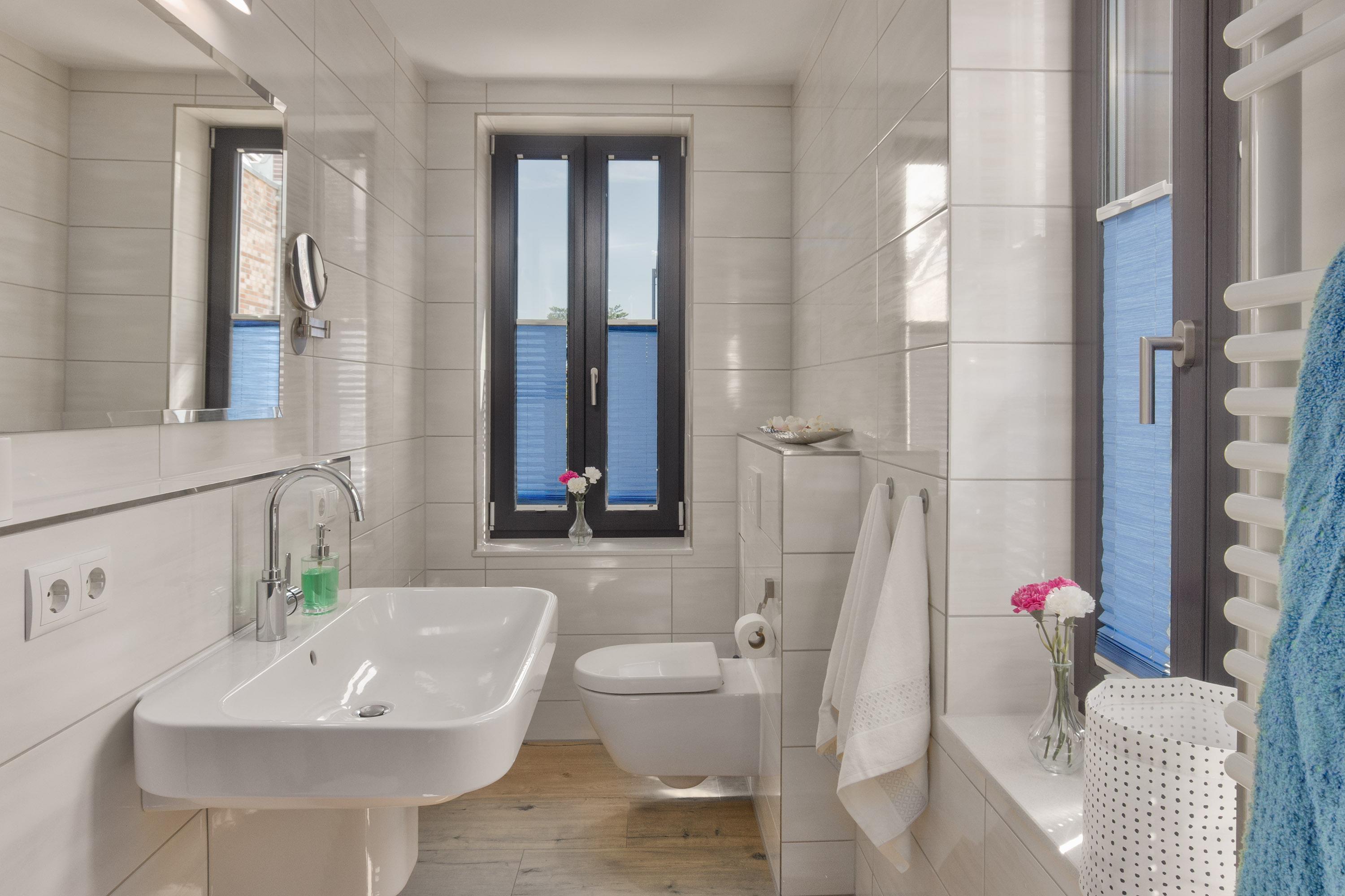 Zwei moderne Badezimmer mit bodengleicher Dusche bieten ausreichend Platz für die ganze Familie. Hier können Sie nach einem erlebnisreichen Tag wunderbar entspannen. Beide Bäder sind mit einem Handtuchwärmer, Föhn, Kosmetikspiegel und WC ausgestattet. Zusätzlich steht im Erdgeschoss ein Gäste-WC zur Verfügung.