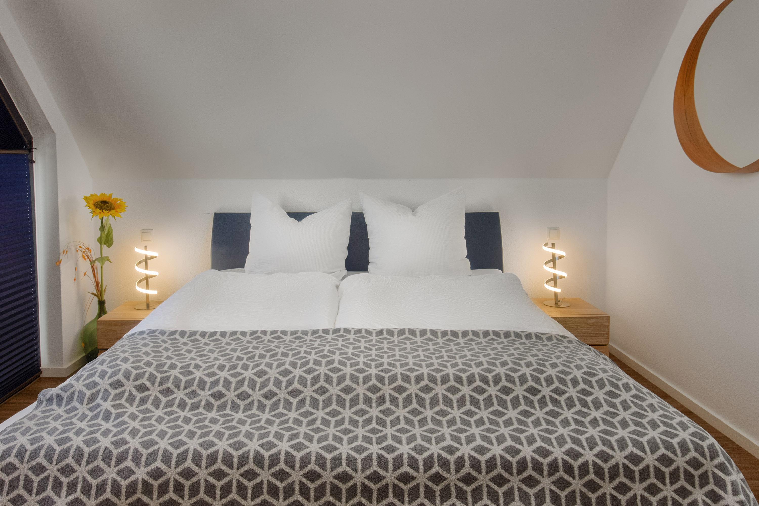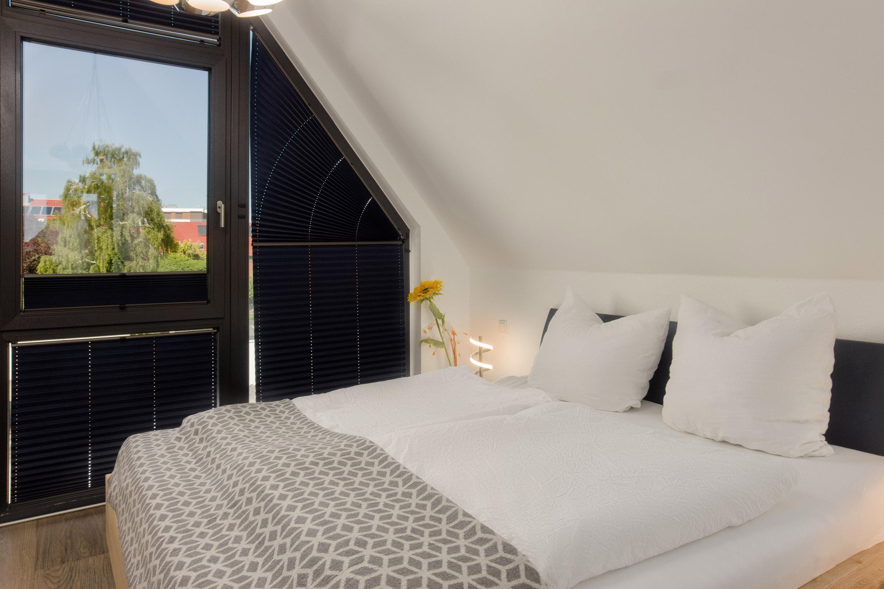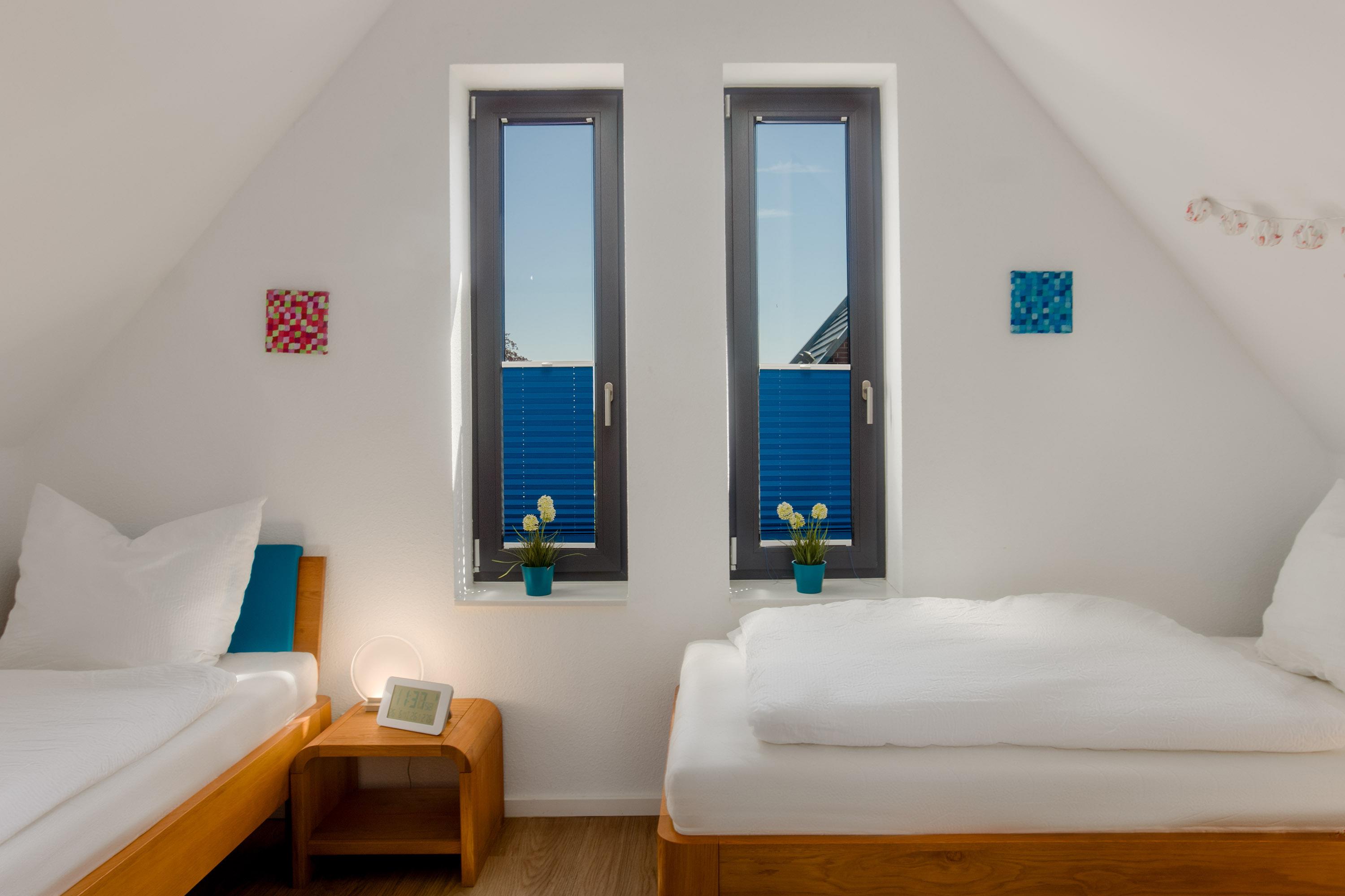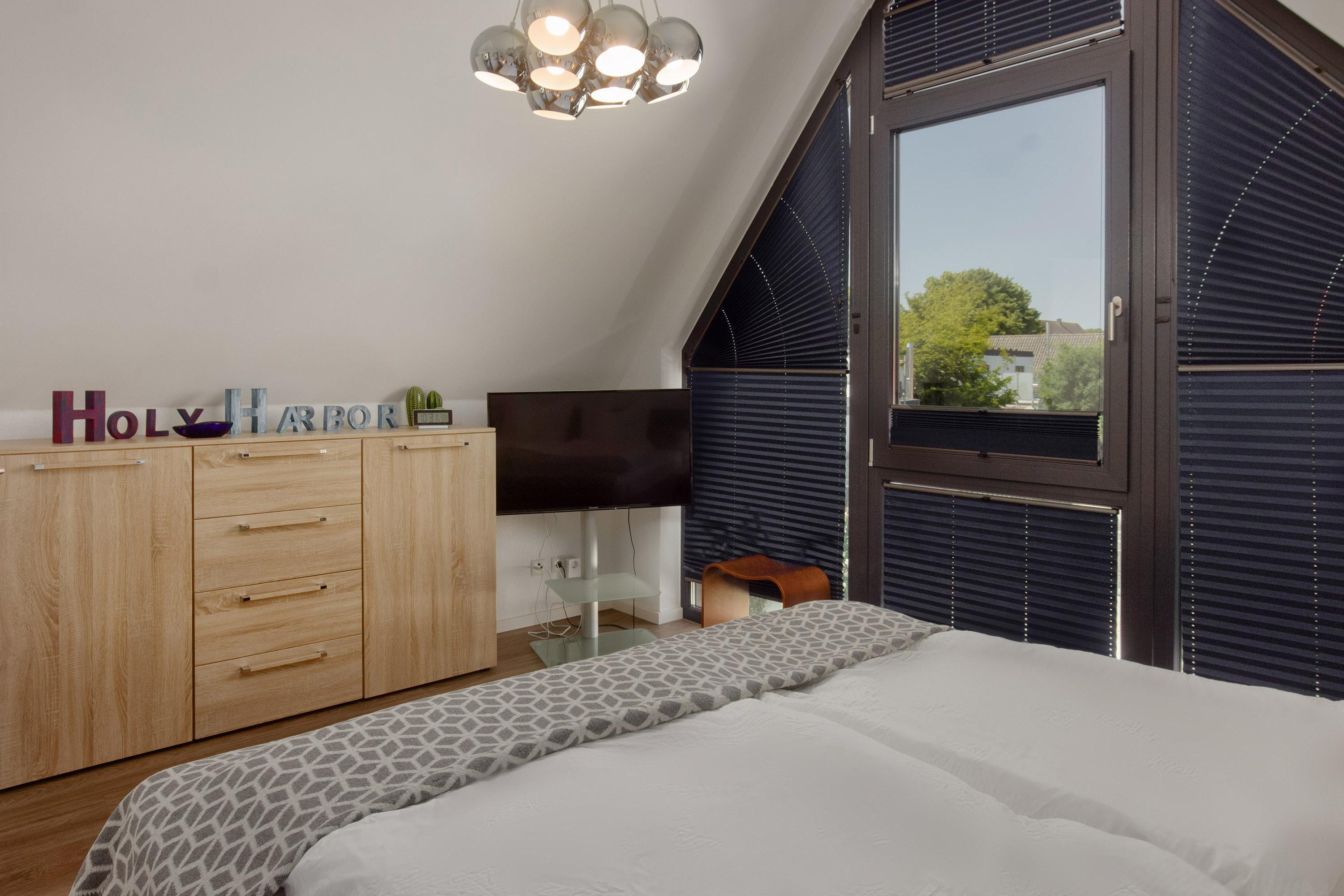 Für Unterhaltung ist ebenfalls gesorgt: Ein HD-TV und ein DVD-Recorder sind selbstverständlich vorhanden. Das Ferienhaus eignet sich besonders für Familien und Kleingruppen, da es über drei gemütliche Schlafzimmer verfügt. Im ersten Obergeschoss befindet sich ein Schlafzimmer mit Doppelbett, während das Dachgeschoss ein weiteres Schlafzimmer mit Doppelbett sowie ein Zimmer mit zwei Einzelbetten bietet. Ein Baby-Reisebett und ein Hochstuhl stehen kostenfrei zur Verfügung. Die großzügigen Fensterfronten in den Schlafräumen eröffnen wunderbare Blickwinkel und lassen viel natürliches Licht hinein. Für erholsame Nächte sorgen Verdunklungsvorhänge und Plissees.