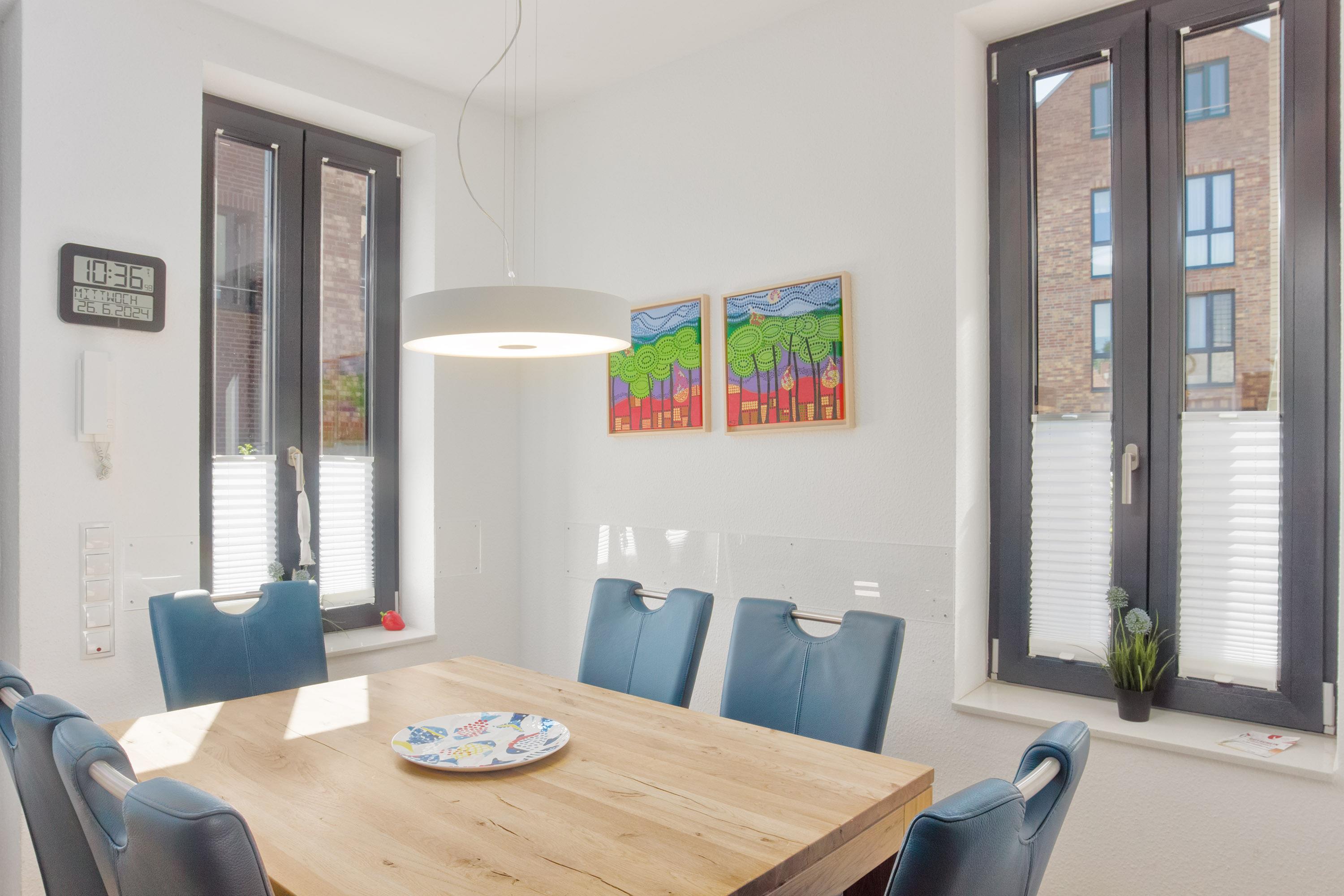 Die große, voll ausgestattete Küche in U-Form lässt keine Wünsche offen. Hier finden Sie hochwertige, leise Elektrogeräte – einschließlich einer Waschmaschine – sowie ausreichend Platz für kulinarische Kreativität. Der angrenzende Essbereich bietet bequem Platz für bis zu sechs Personen. Im Eingangsbereich befindet sich eine praktische Garderobe, und neben der Küche bietet ein kleiner Abstellraum zusätzlichen Stauraum für Haushaltsutensilien.