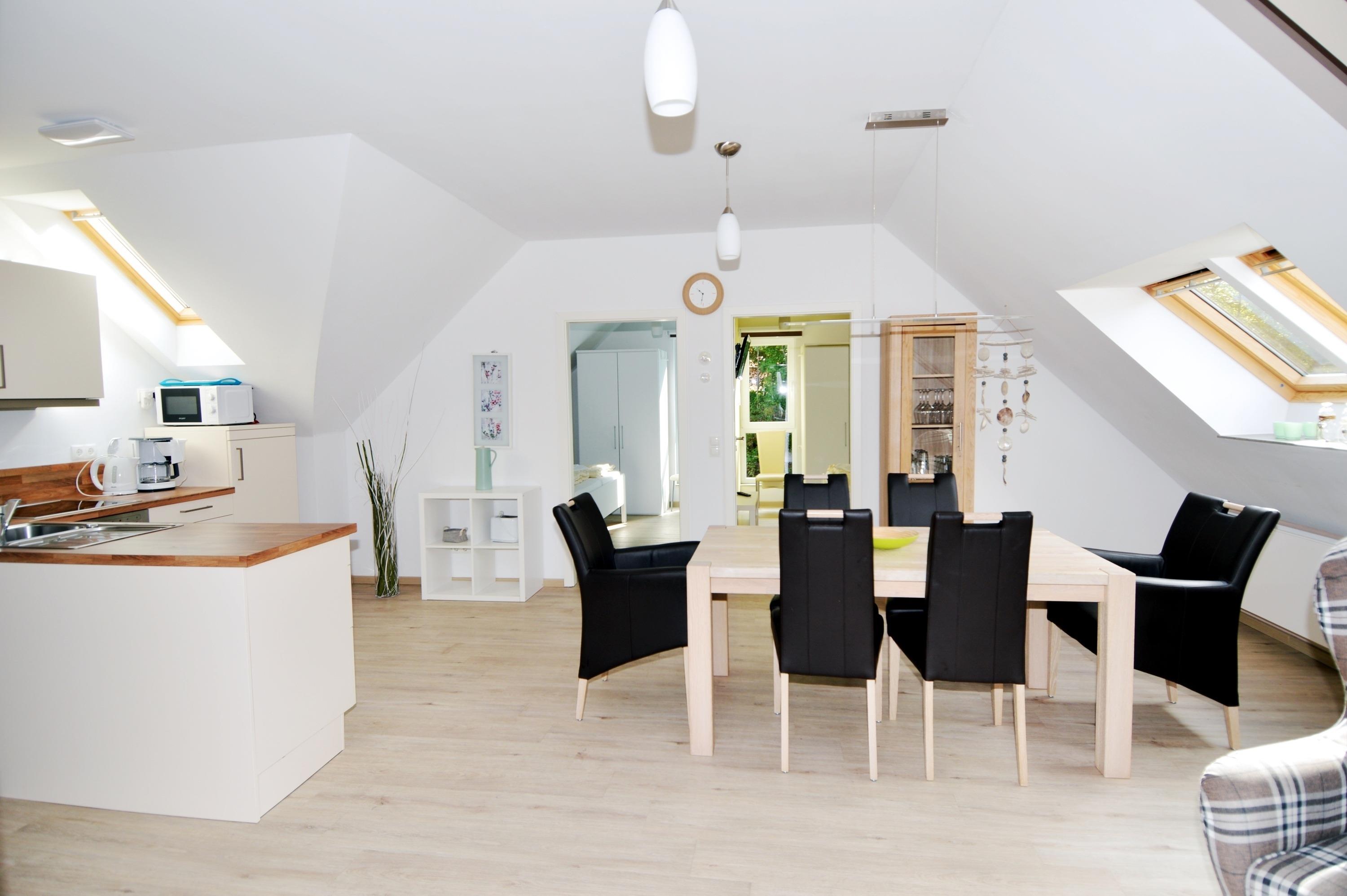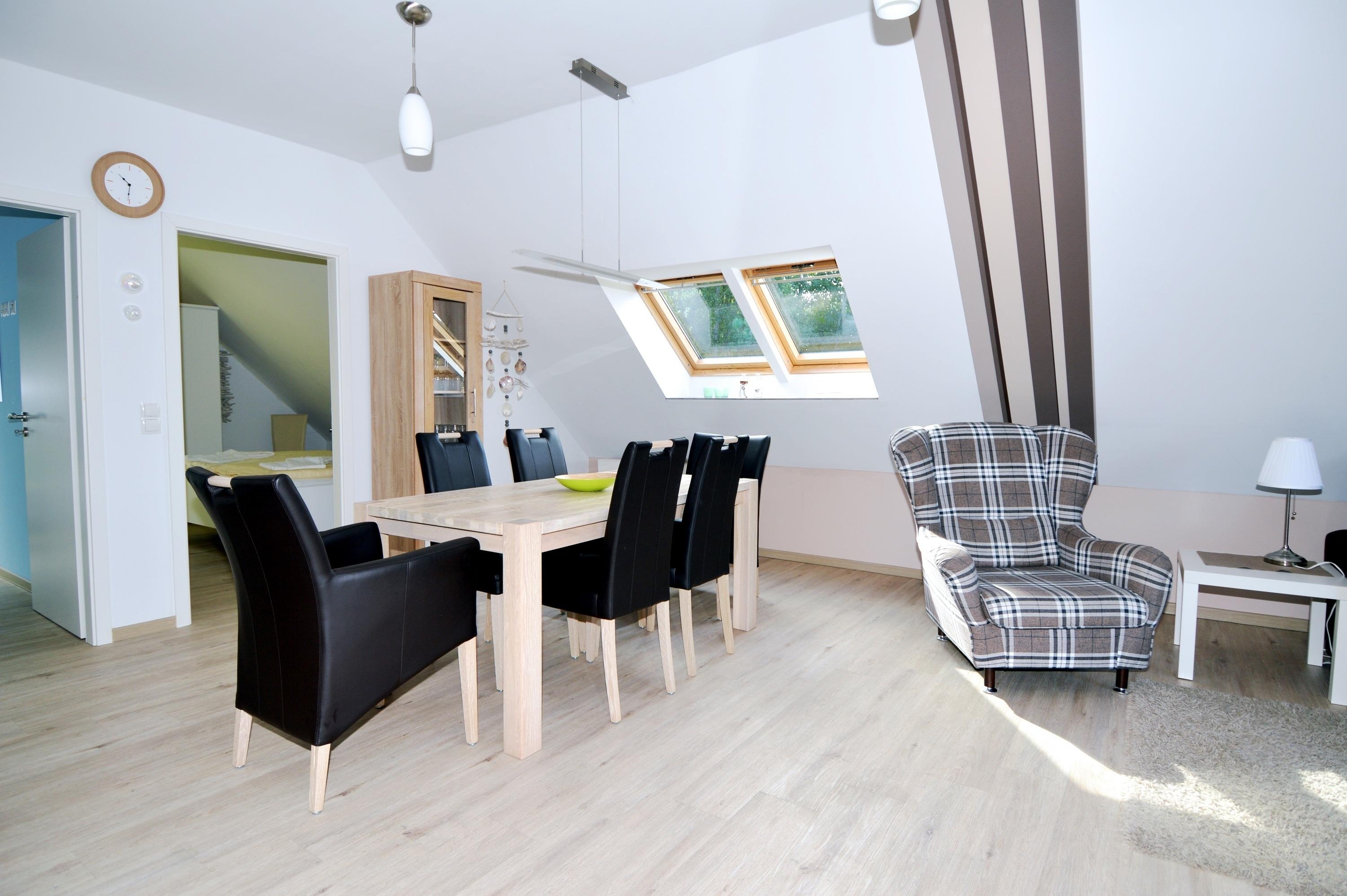 Herzstück der Wohnung ist der großzügige Wohn- und Essbereich, der freundlich und einladend gestaltet ist. Hier können Sie gemeinsam entspannen, Mahlzeiten einnehmen oder gemütliche Abende verbringen. Ein Fernseher sowie WLAN / WiFi stehen für Unterhaltung und digitale Annehmlichkeiten zur Verfügung.