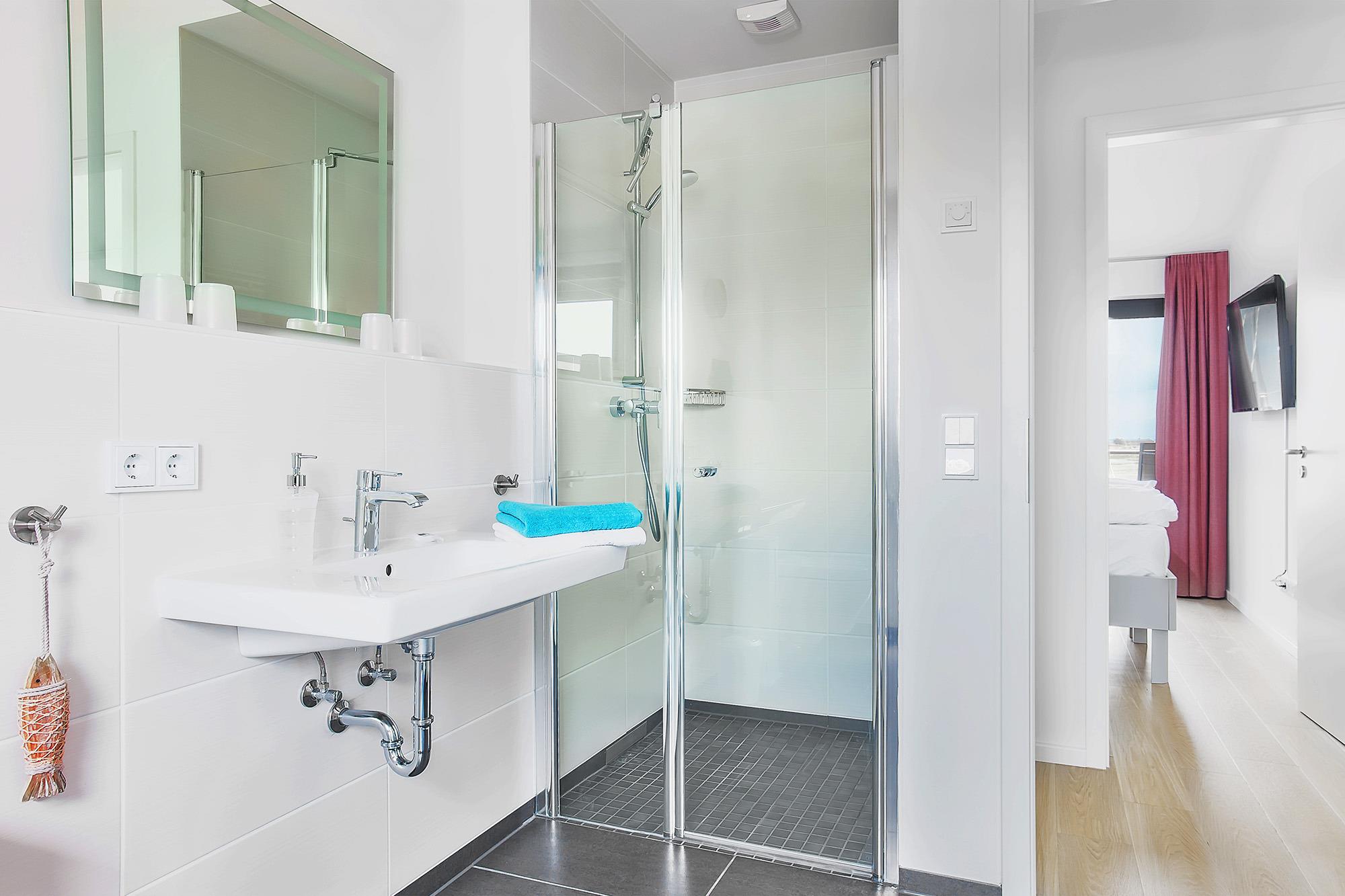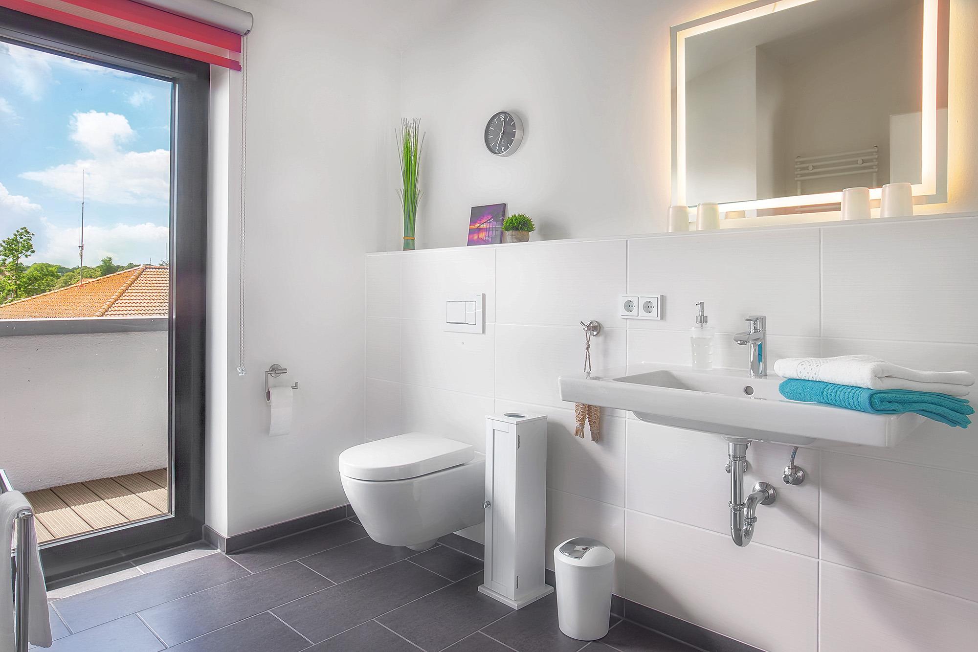 Das moderne Badezimmer überzeugt mit einer ebenerdigen Dusche, einem Handtuchwärmer und direktem Zugang zur Südterrasse, wo Sie sich nach einem erfrischenden Bad sonnen oder einfach die Seele baumeln lassen können. Ein separates Gäste-WC sorgt für zusätzlichen Komfort. Zudem steht Ihnen eine Waschmaschine zur Verfügung, sodass auch längere Aufenthalte problemlos möglich sind.