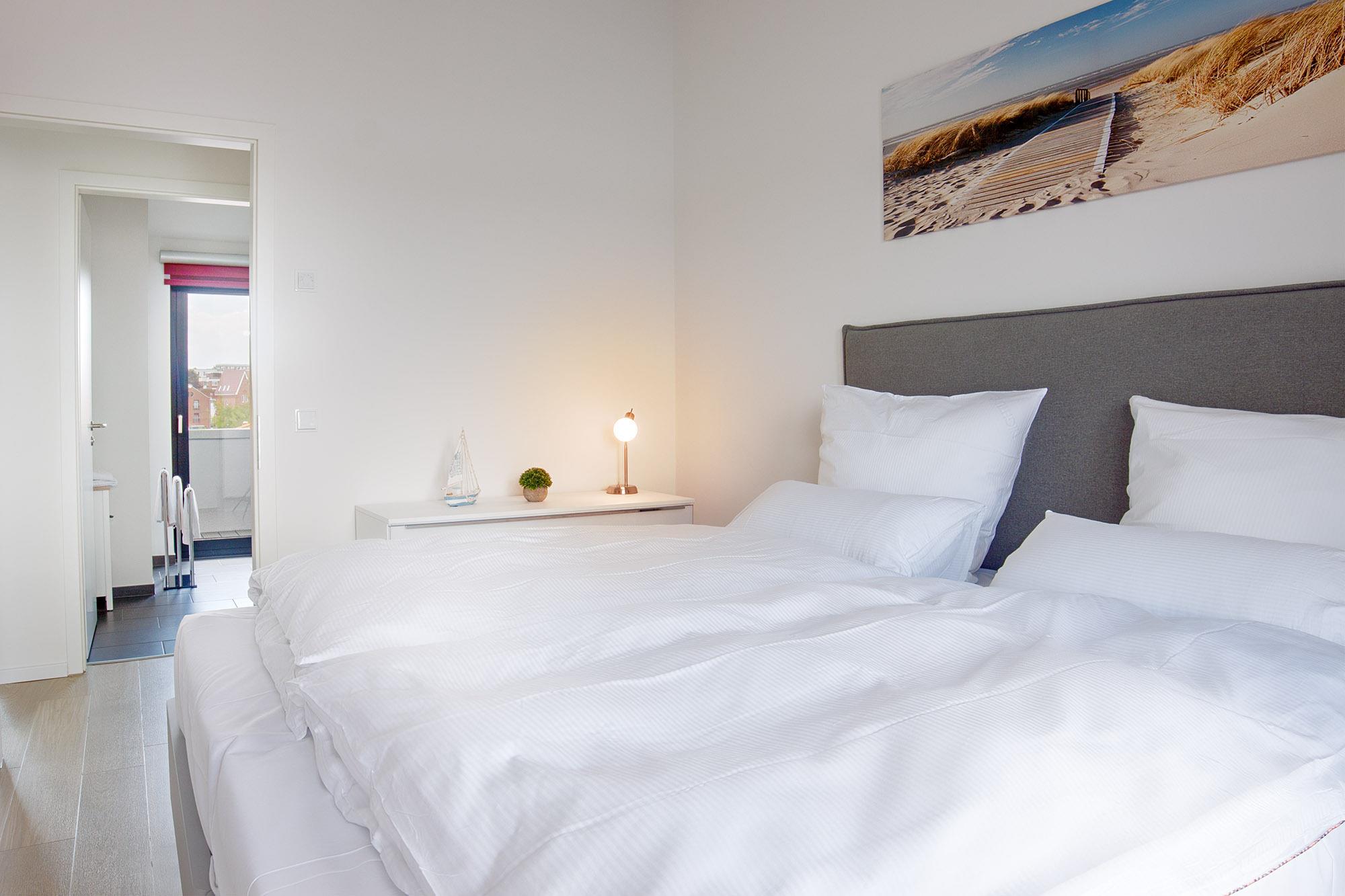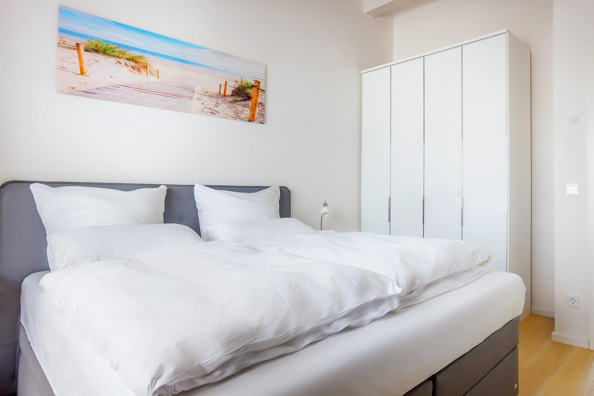 Die Ferienwohnung bietet ausreichend Platz für bis zu sechs Personen und ist damit ideal für Familien, Paare oder kleine Gruppen, die besonderen Wert auf Komfort und ein stilvolles Ambiente legen. Das Hauptschlafzimmer im zweiten Obergeschoss ist mit einem luxuriösen Doppelboxspringbett und eigenem TV ausgestattet und lädt zu erholsamen Nächten ein. Ein weiteres Schlafzimmer mit zwei nebeneinander stehenden Einzelboxspringbetten bietet eine angenehme Rückzugsmöglichkeit für Erwachsene oder Kinder. Zusätzlich steht im Wohnbereich eine komfortable Schlafcouch mit einer Liegefläche von 1,40 x 2,00 m für zwei weitere Gäste bereit.