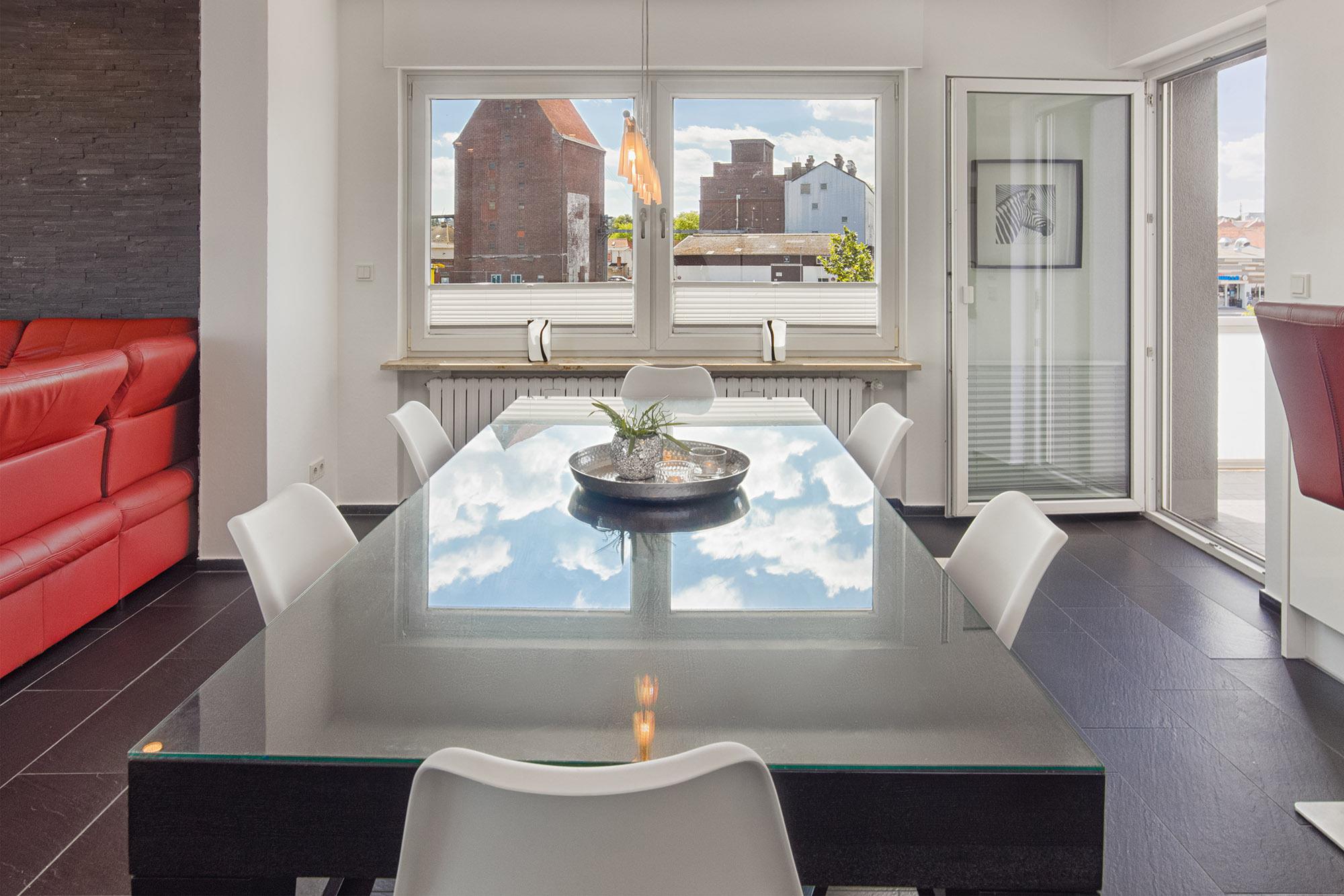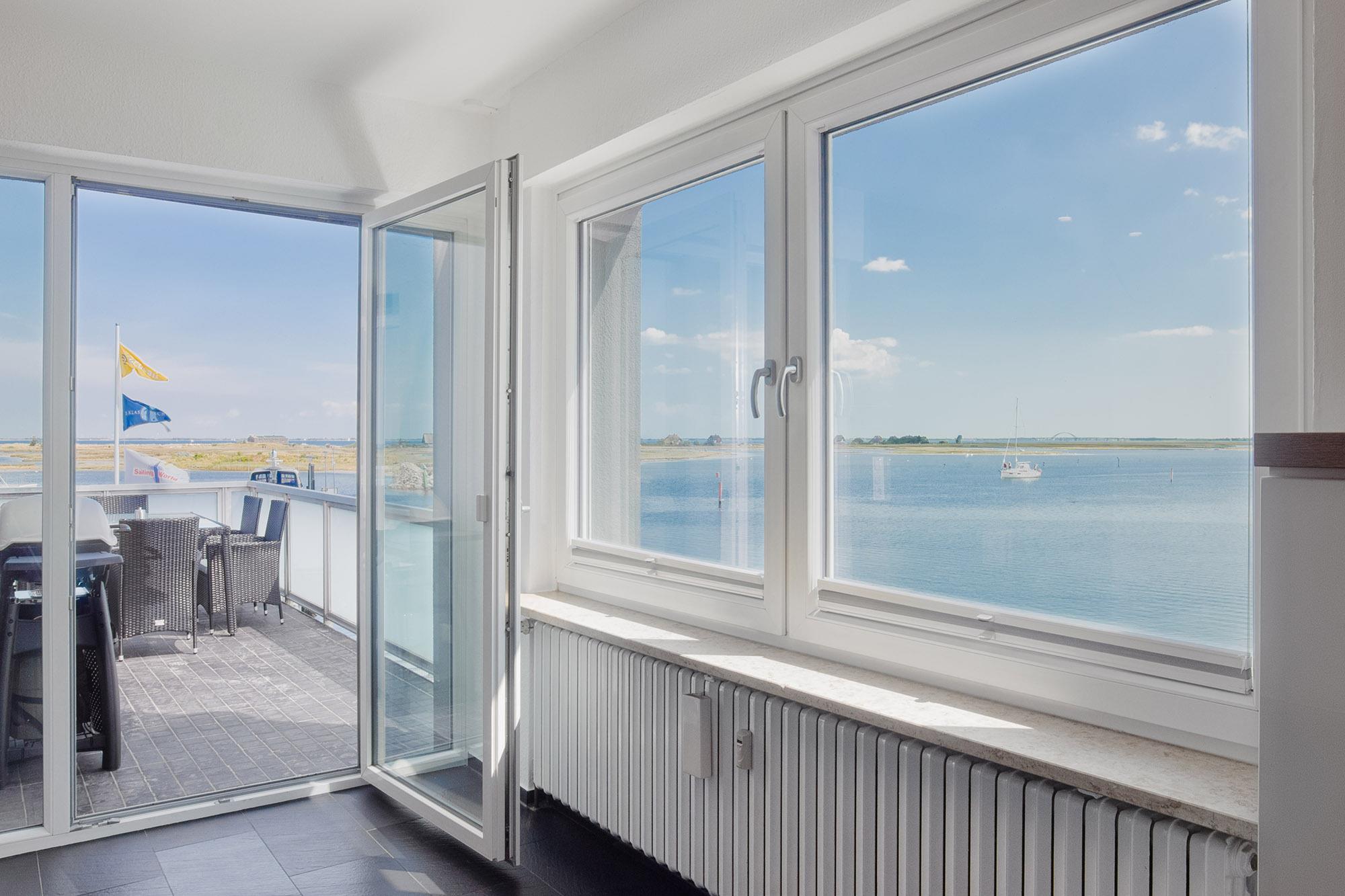 Die möblierten Terrassen der Wohnung schließen direkt an den Wohnbereich an. Einmal ostseitig mit Blick auf die Ostsee und die Fehmarnsundbrücke oder einmal südseitig mit Blick auf den Kommunalhafen. Diese laden dazu ein, den Tag mit einer Tasse Kaffee an der frischen Seeluft zu beginnen oder laue Sommerabende entspannt ausklingen zu lassen. Der Weber-Gasgrill darf gern genutzt werden.