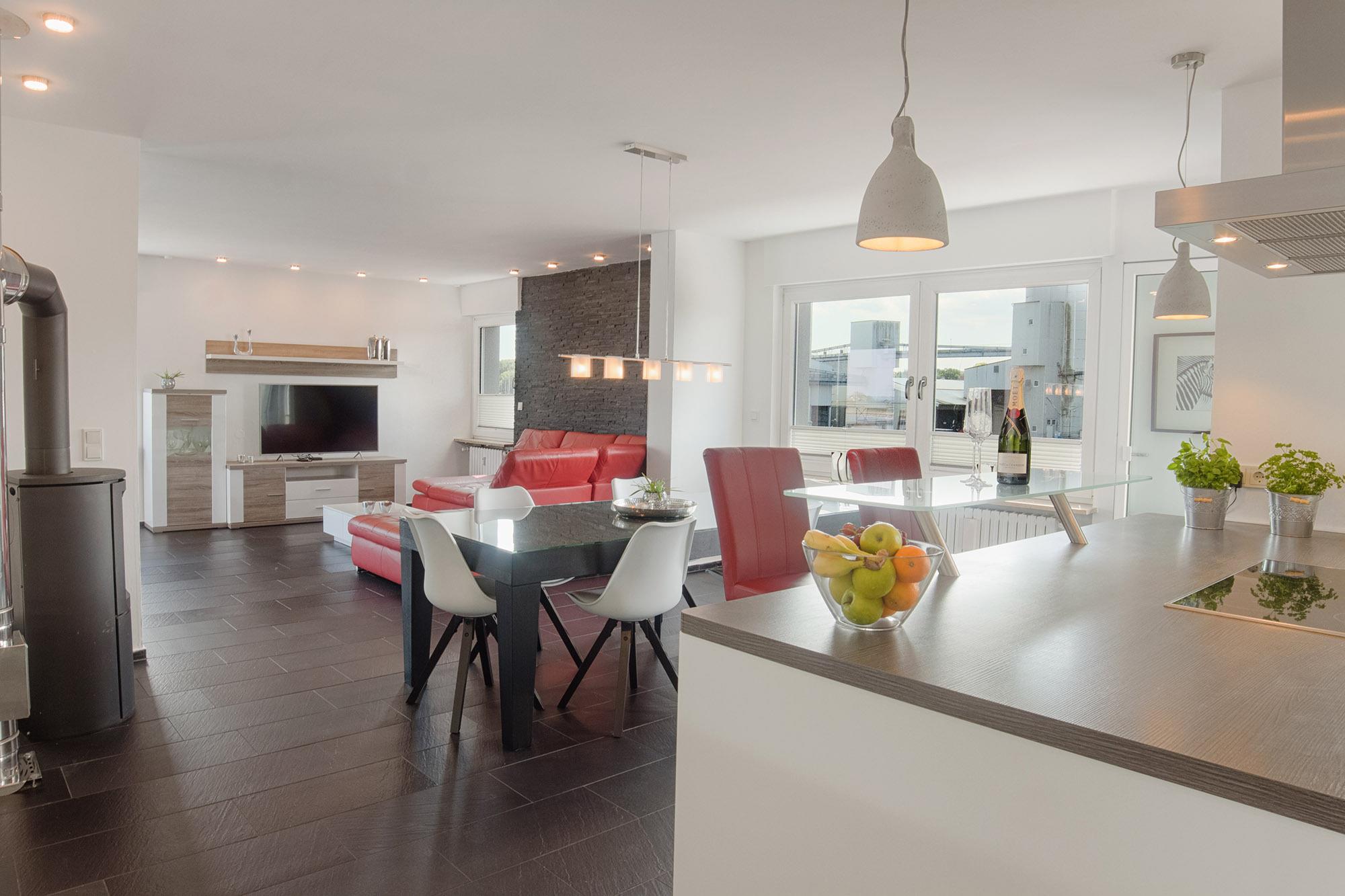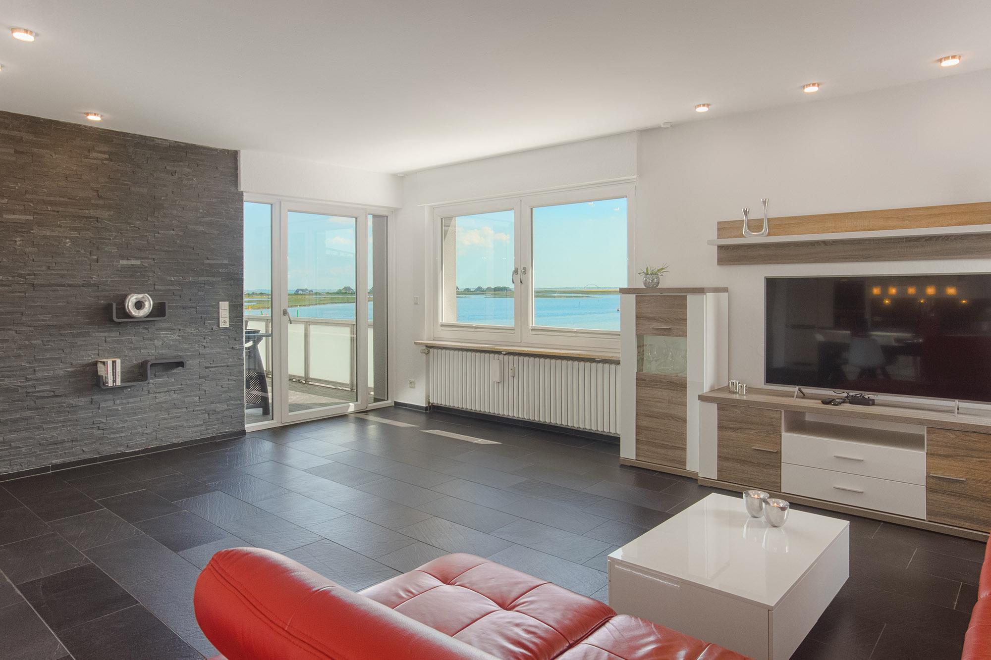 Herzstück ist der lichtdurchflutete und einladende Wohn- und Essbereich. Hier kann auf der gemütlichen Couch (mit Schlaffunktion für die 5.+6.Person) entspannt werden oder Sie genießen gesellige Stunden am Esstisch. TV und WLAN sind selbstverständlich. Ein Kaminofen (ohne Brennmaterial) trägt zur wohligen Gemütlichkeit bei. Die Farbgebung und ausgewählte Dekorationen sorgen für ein wunderbar wohnliches Gefühl. Durch die großen, z.T. bodentiefen Fenster haben Sie immer einen Blick aufs Wasser. Für Sichtschutz sorgen Plissees.