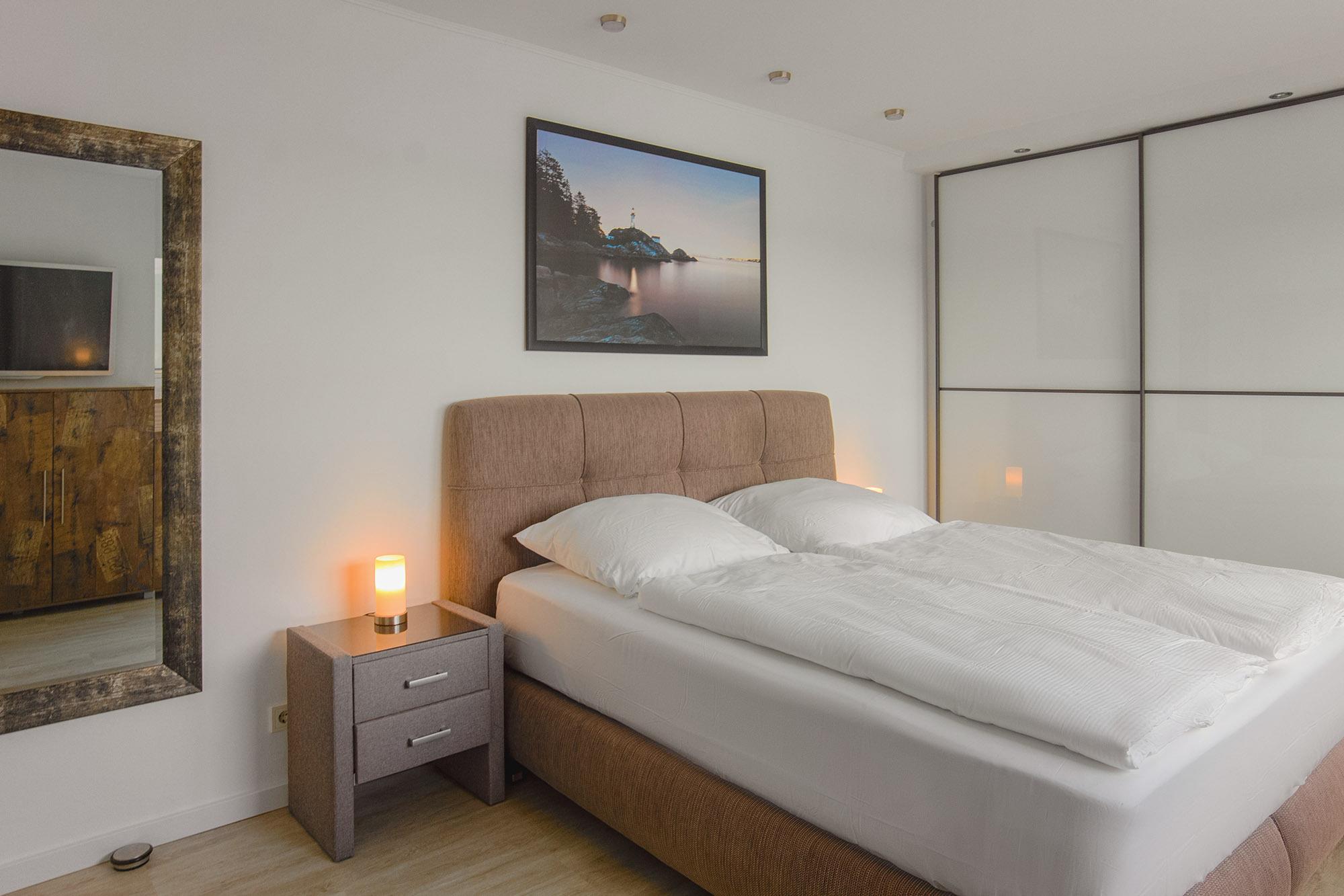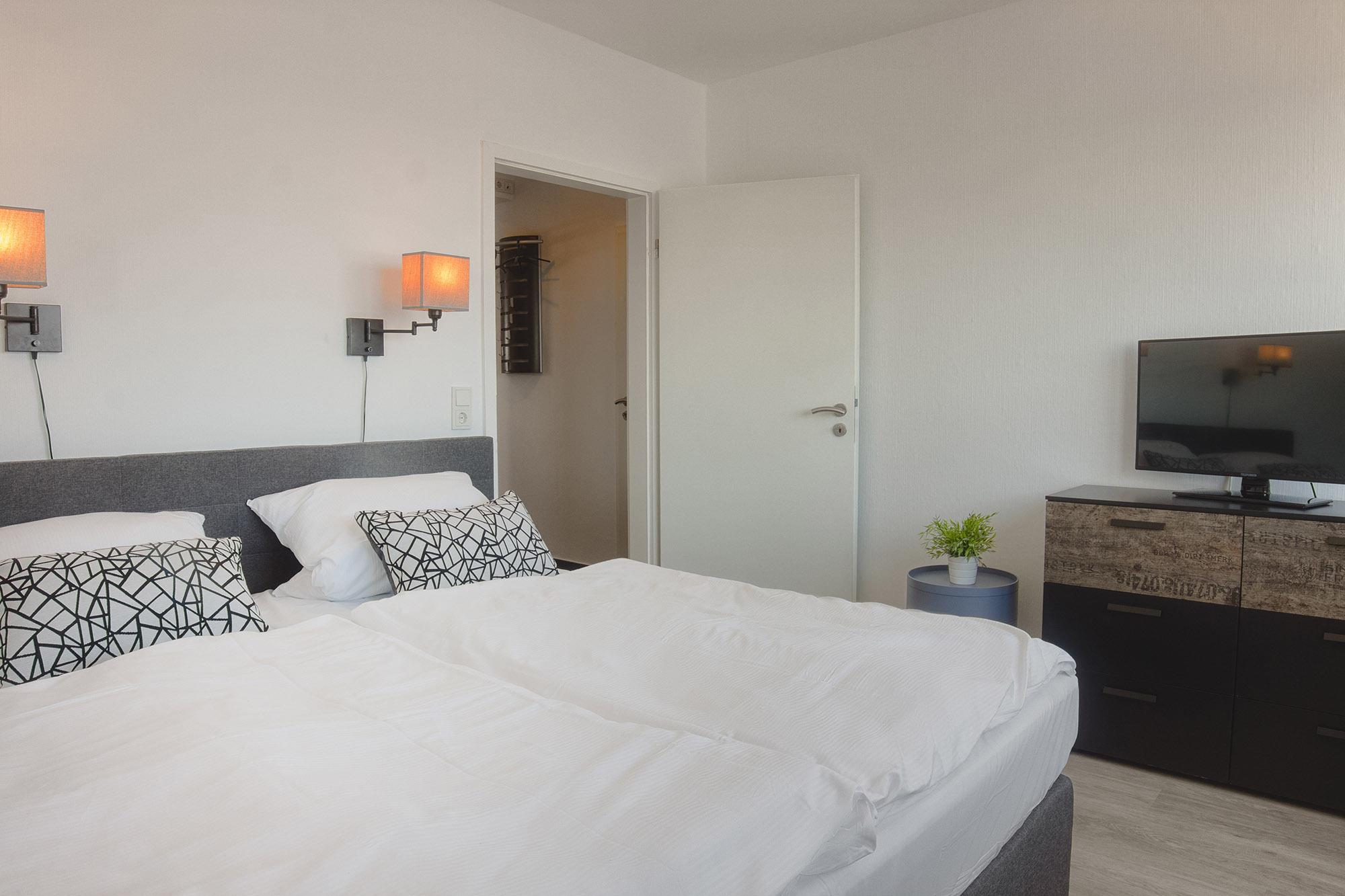 Ebenso komfortabel geht es in den zwei Schlafzimmern der Wohnung weiter. Hier warten einladende Doppelboxspringbetten (180x200 + 180x200), große Kleiderschränke und jeweils zusätzlich ein TV. Für Verdunklung sorgen elektrische Aussenjalousien. Bettwäsche und Handtuchsets sind inklusive.