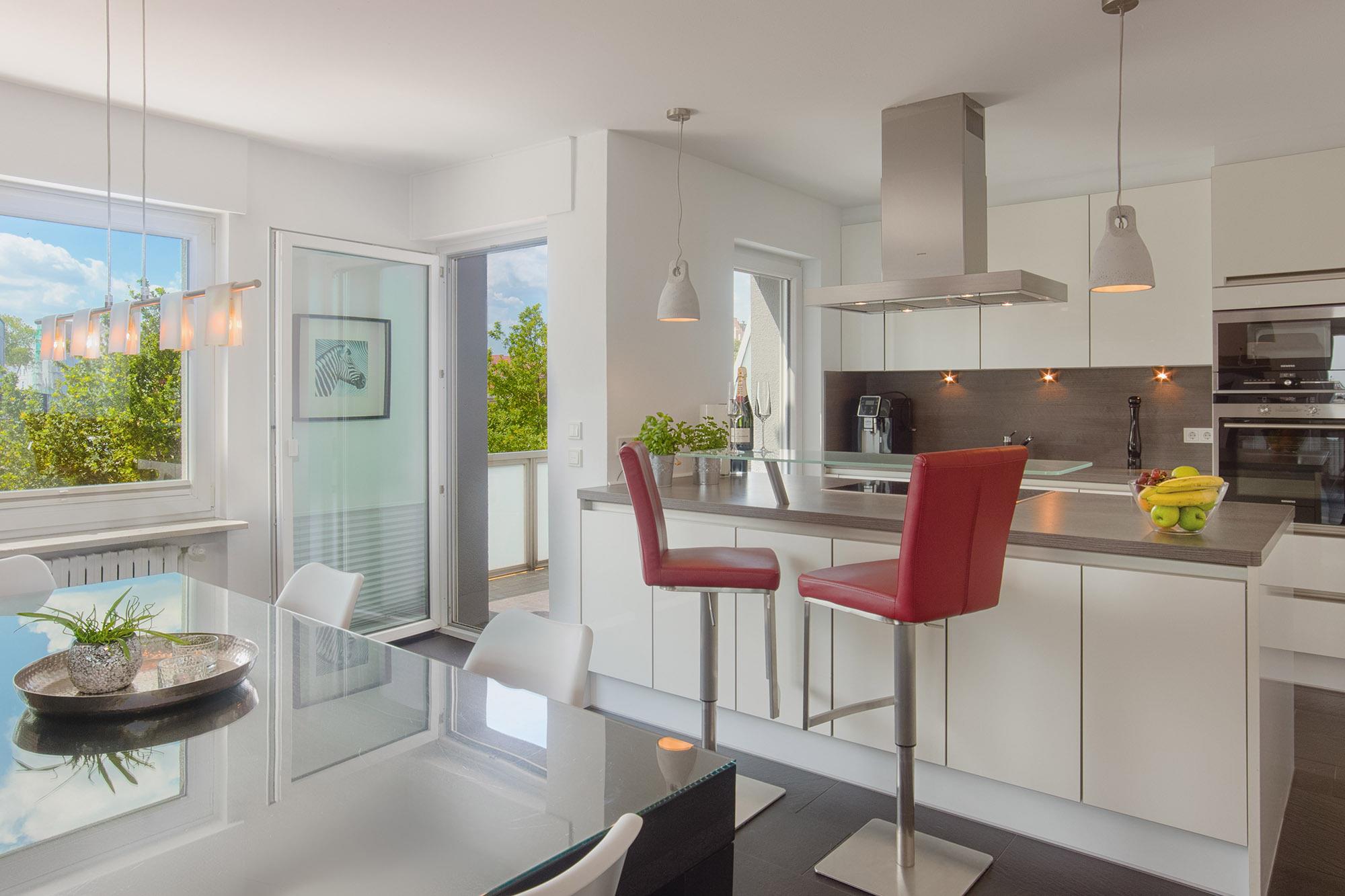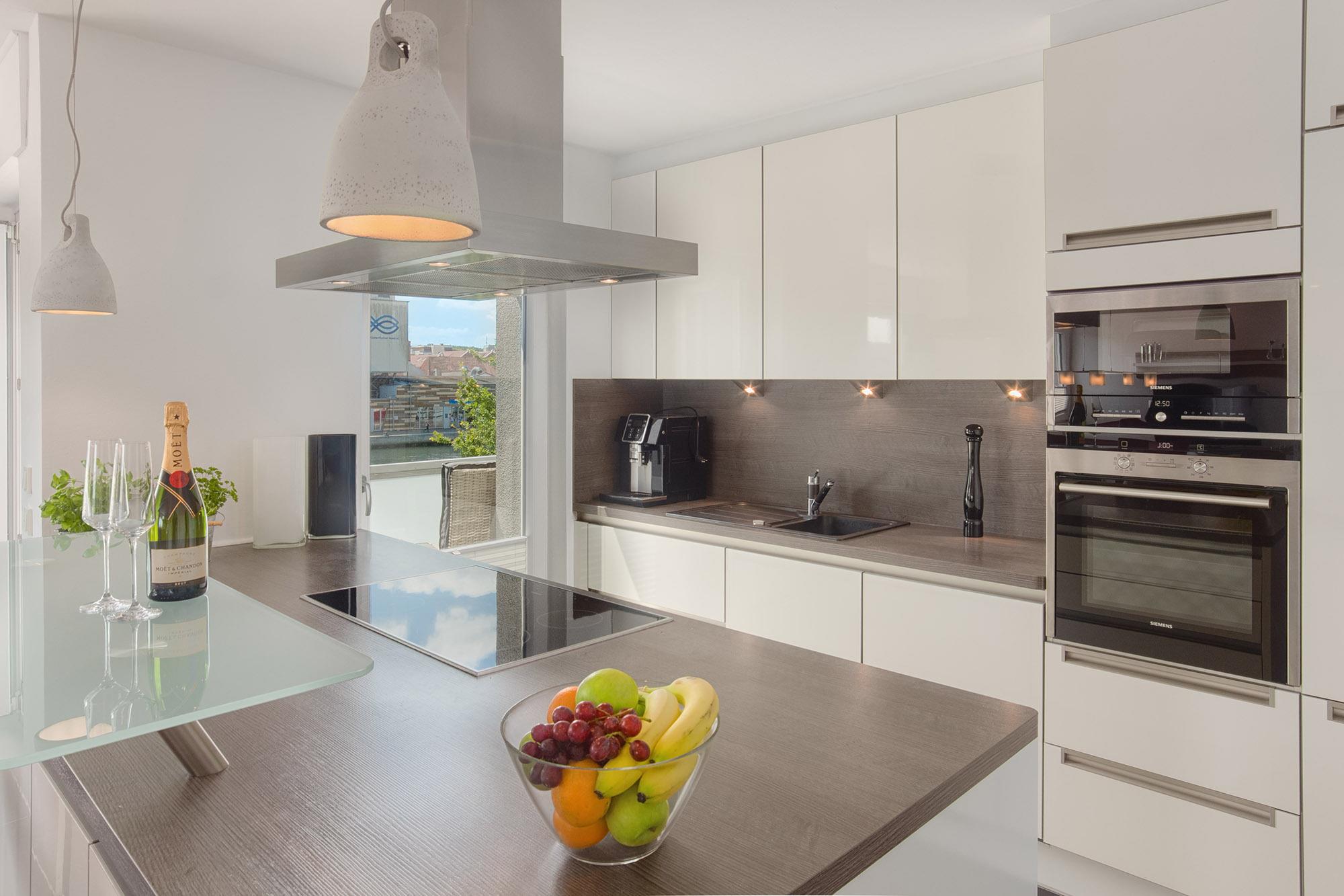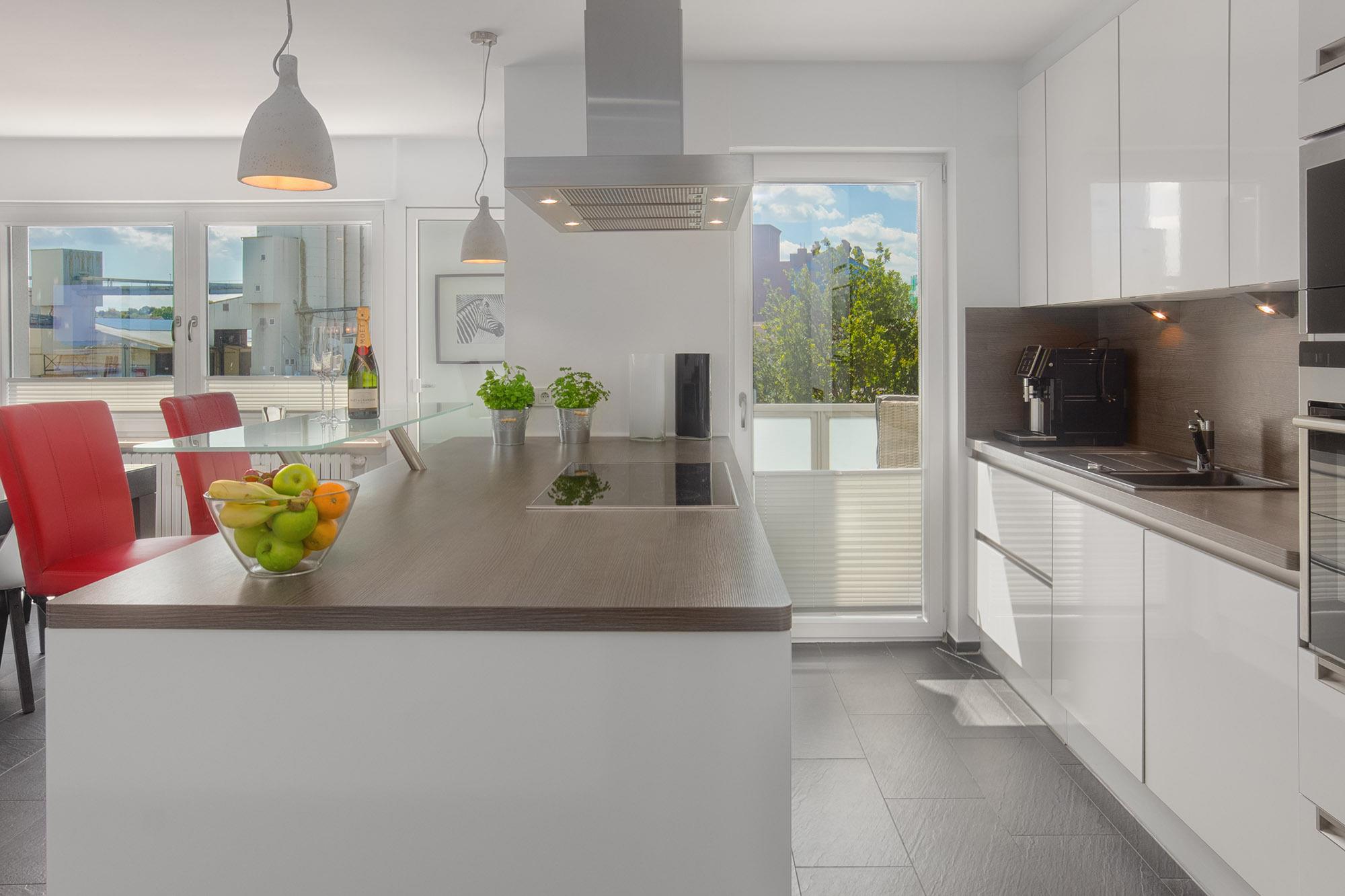 Auch die offene Küche mit Kochinsel wurde in den Wohnbereich angeschlossen. Modern und durchdacht gestaltet, bietet Ihnen die Einbauküche alle Annehmlichkeiten für eine sorgenfreie Selbstversorgung oder zur kulinarischen Entfaltung.
