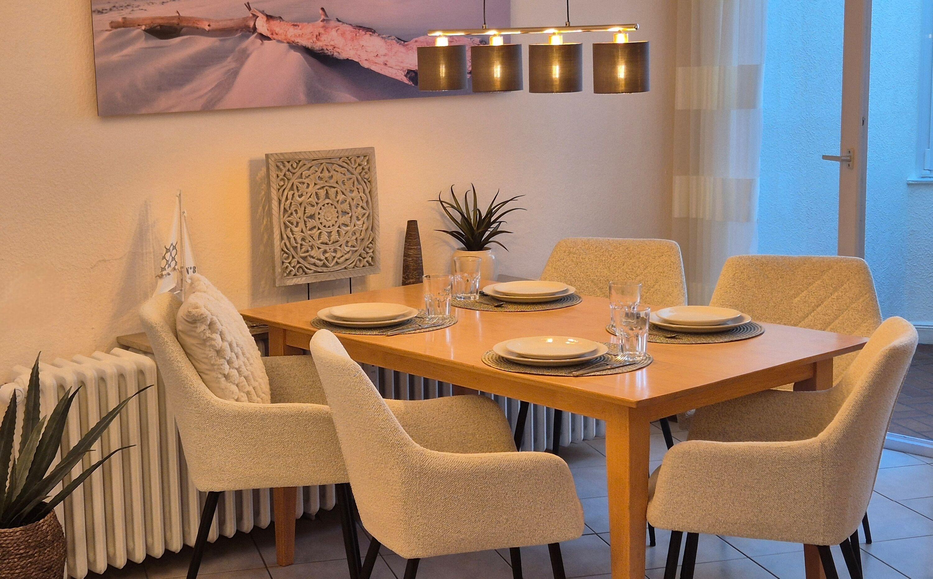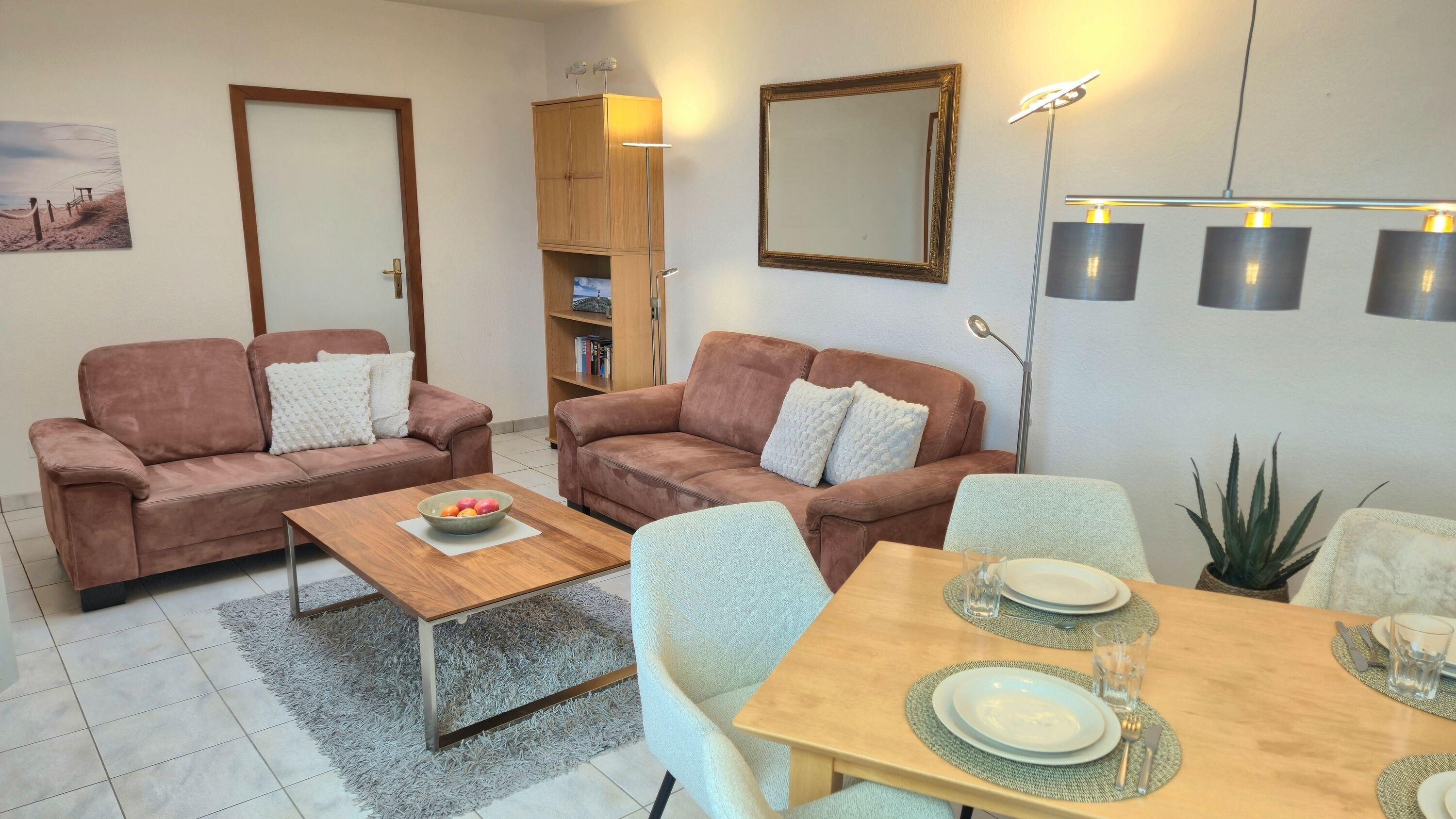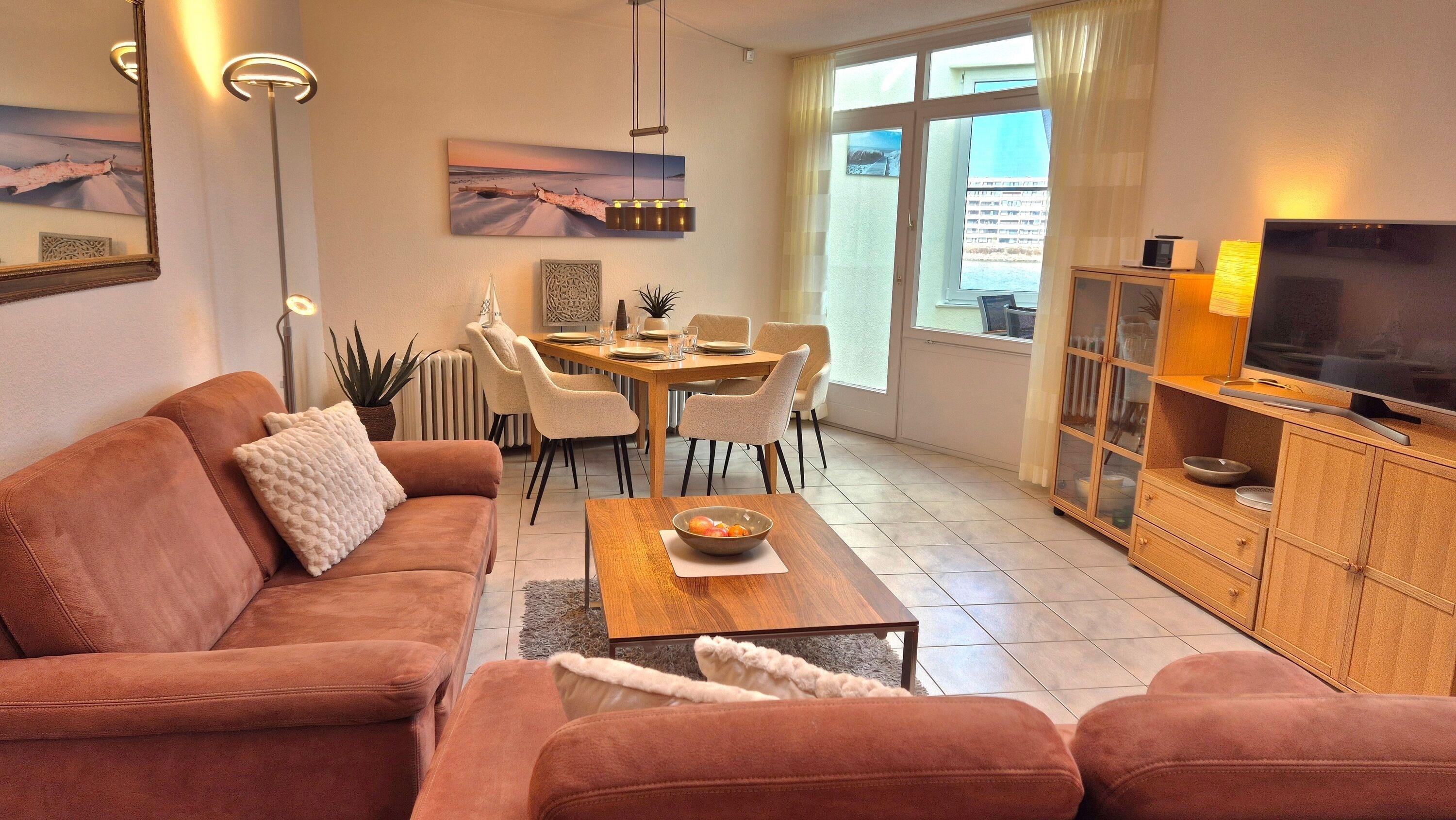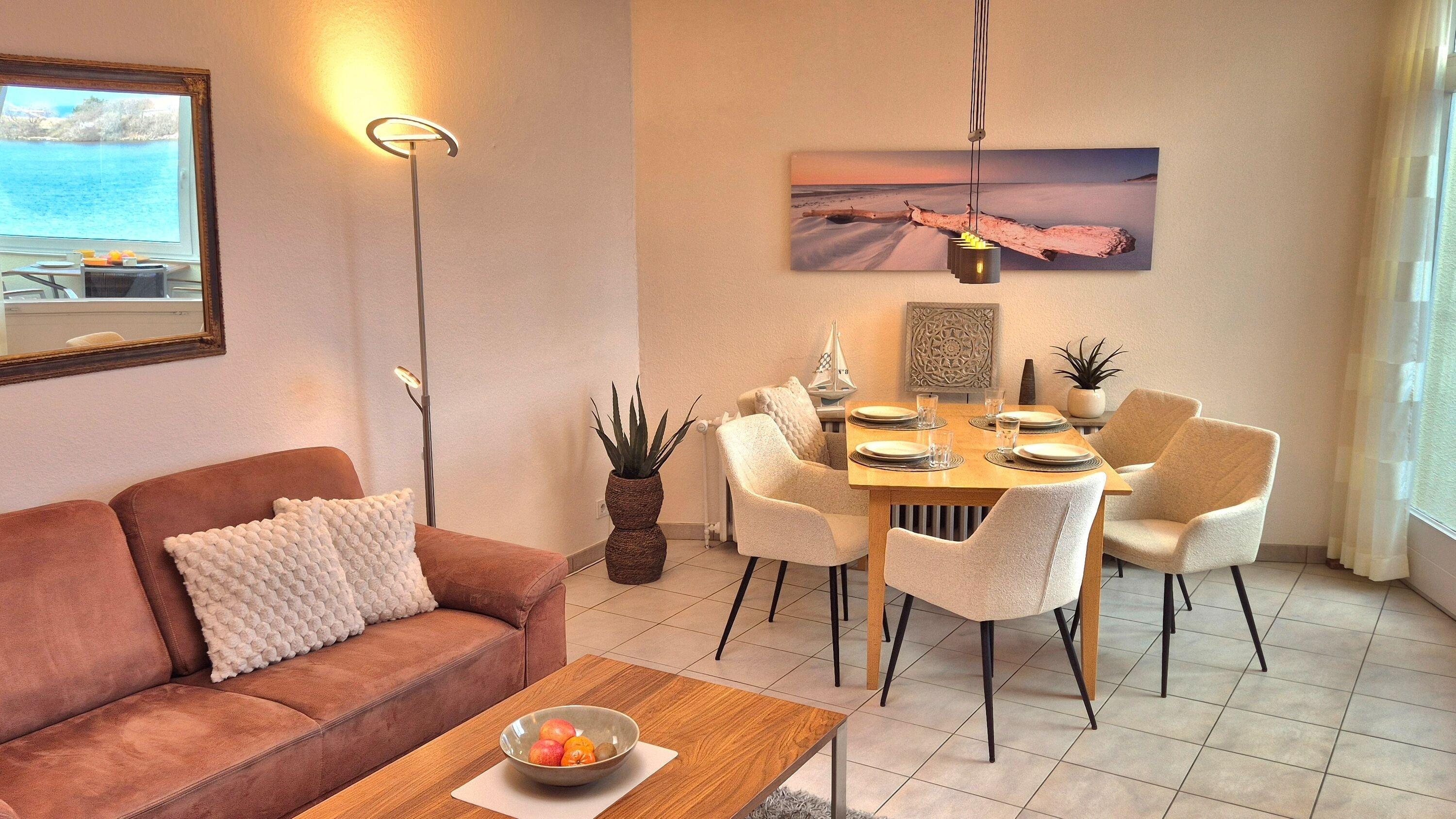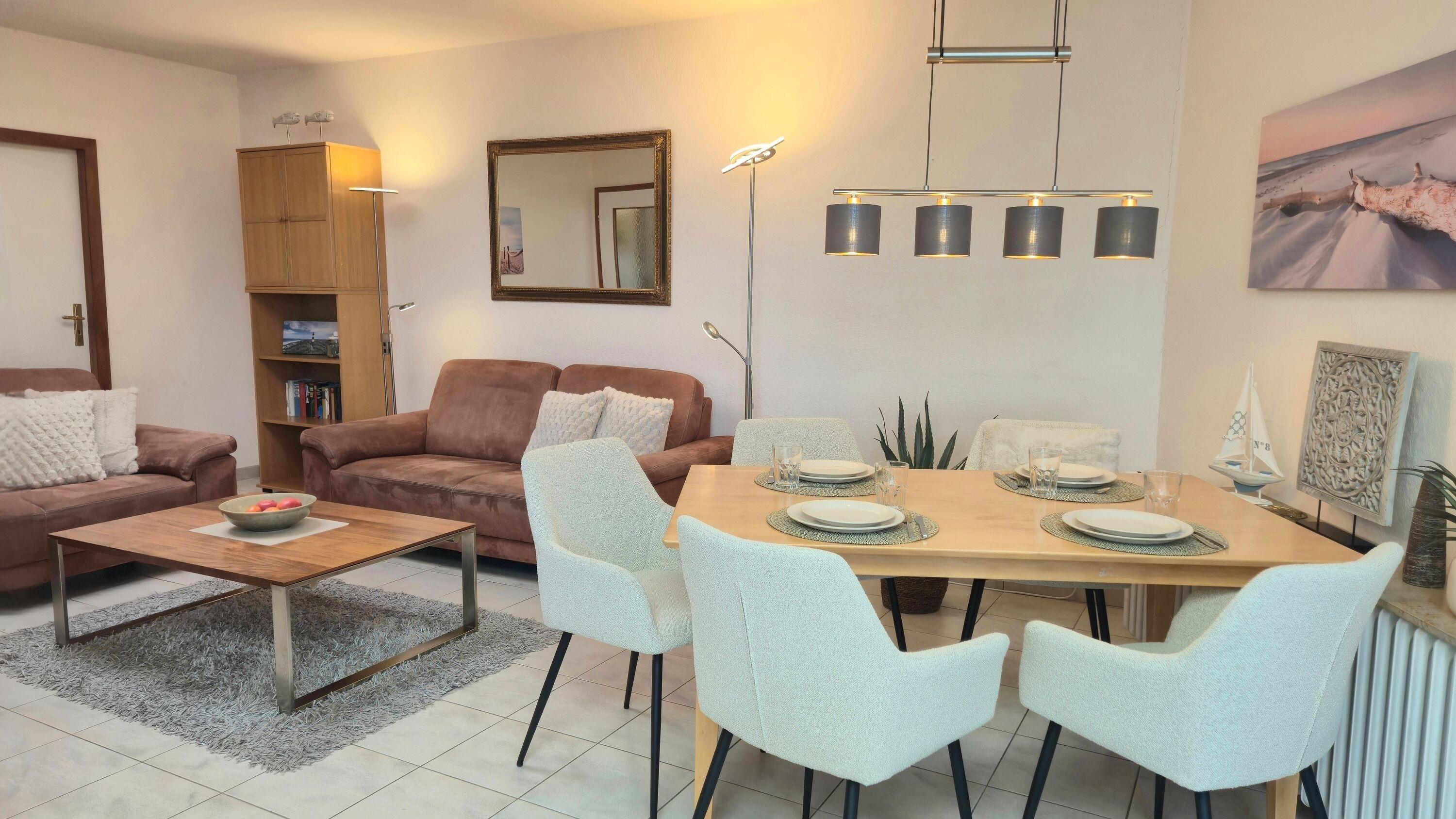 Herzstück der Wohnung ist das großzügige Wohn- und Esszimmer. Zwei gemütliche Sofas laden zum Entspannen ein – perfekt für gemeinsame Abende nach einem Strand- oder Ausflugstag. Am Esstisch mit vier Stühlen sowie einem Kinderstühlchen finden alle Gäste bequem Platz. Für Unterhaltung sorgen ein Smart-TV sowie ein WLAN-Radio, selbstverständlich steht Ihnen auch WLAN / WiFi zur Verfügung.