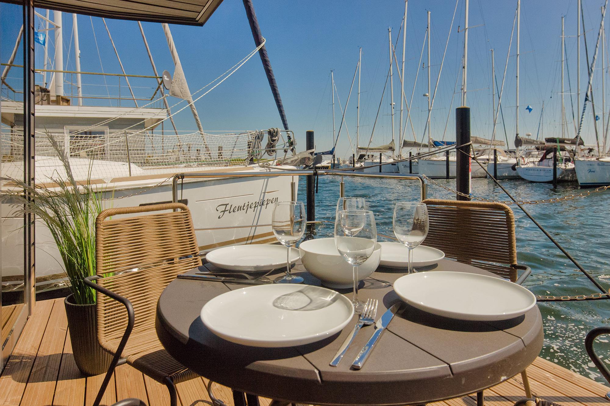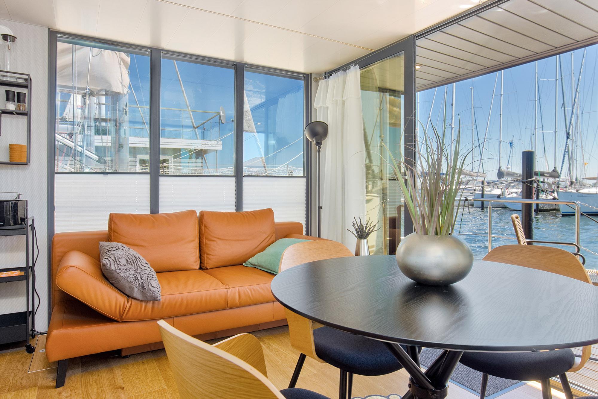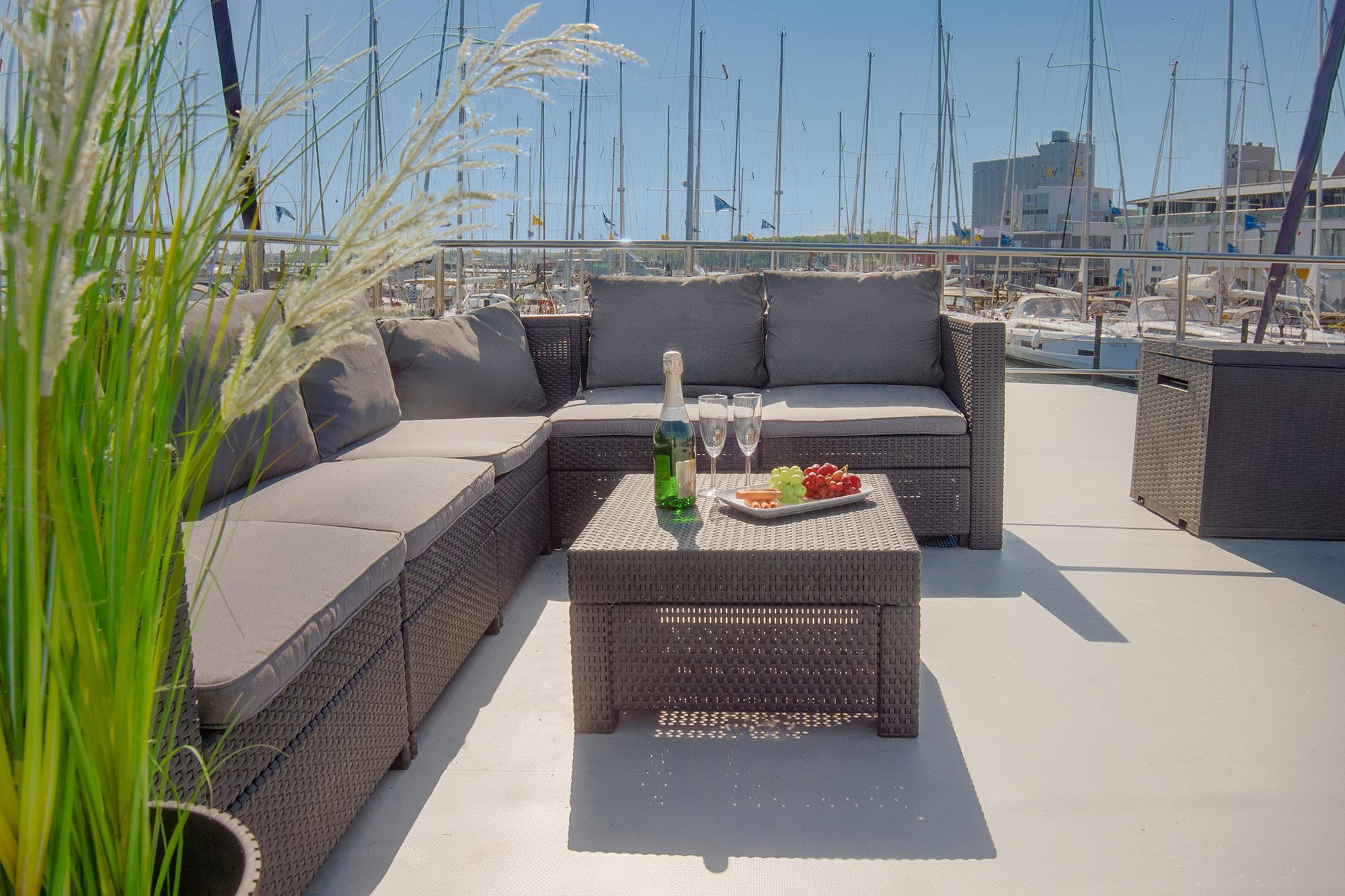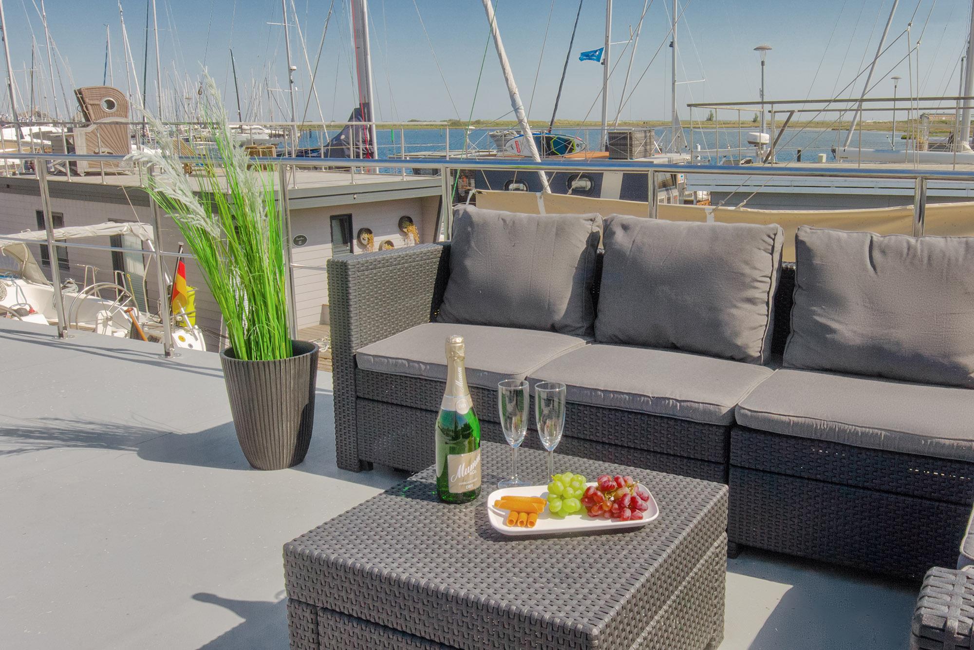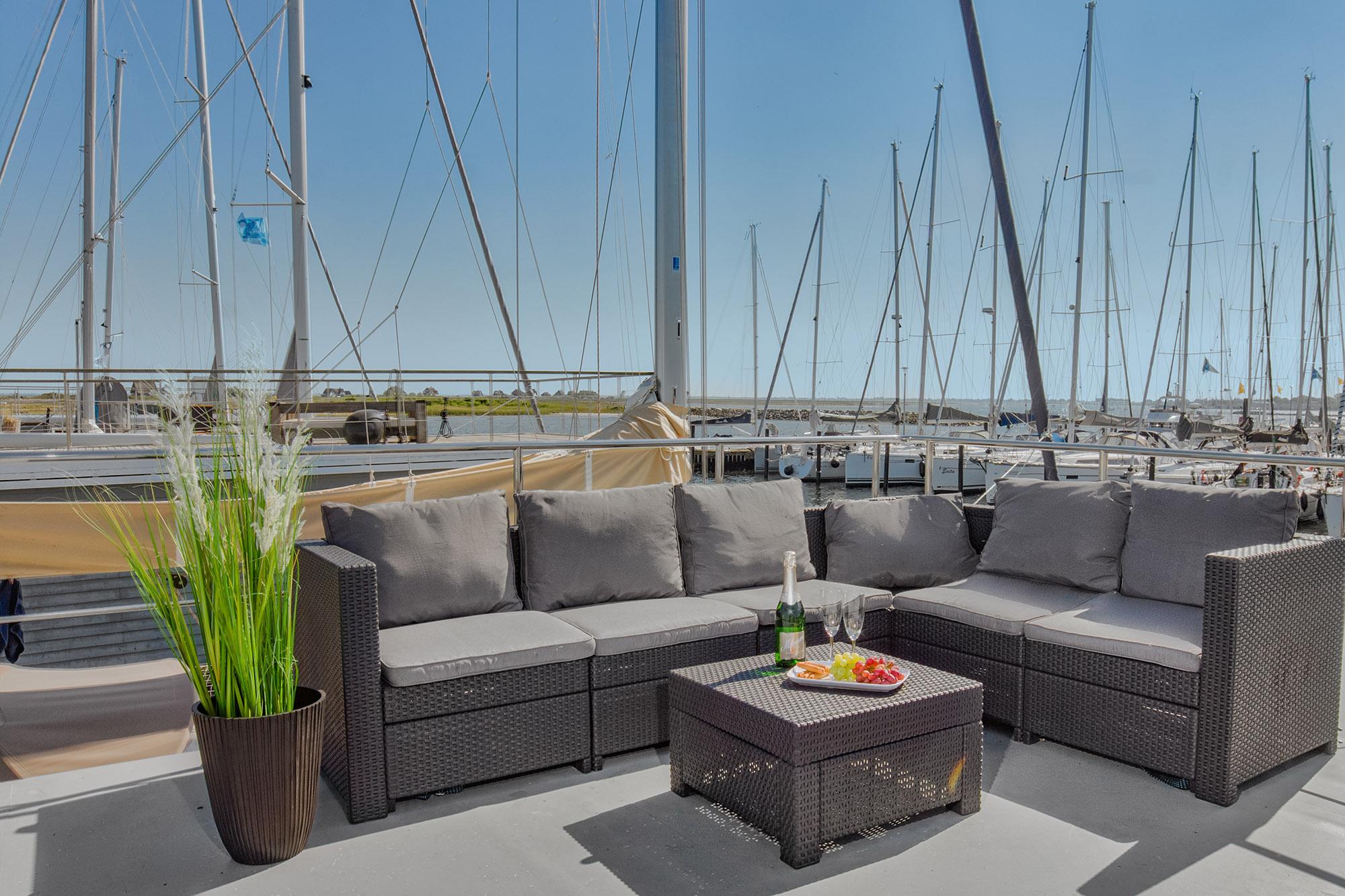 Erleben Sie exklusiven Urlaub auf dem Hausboot mit Sauna, Dachterrasse und Panoramablick in Heiligenhafen.