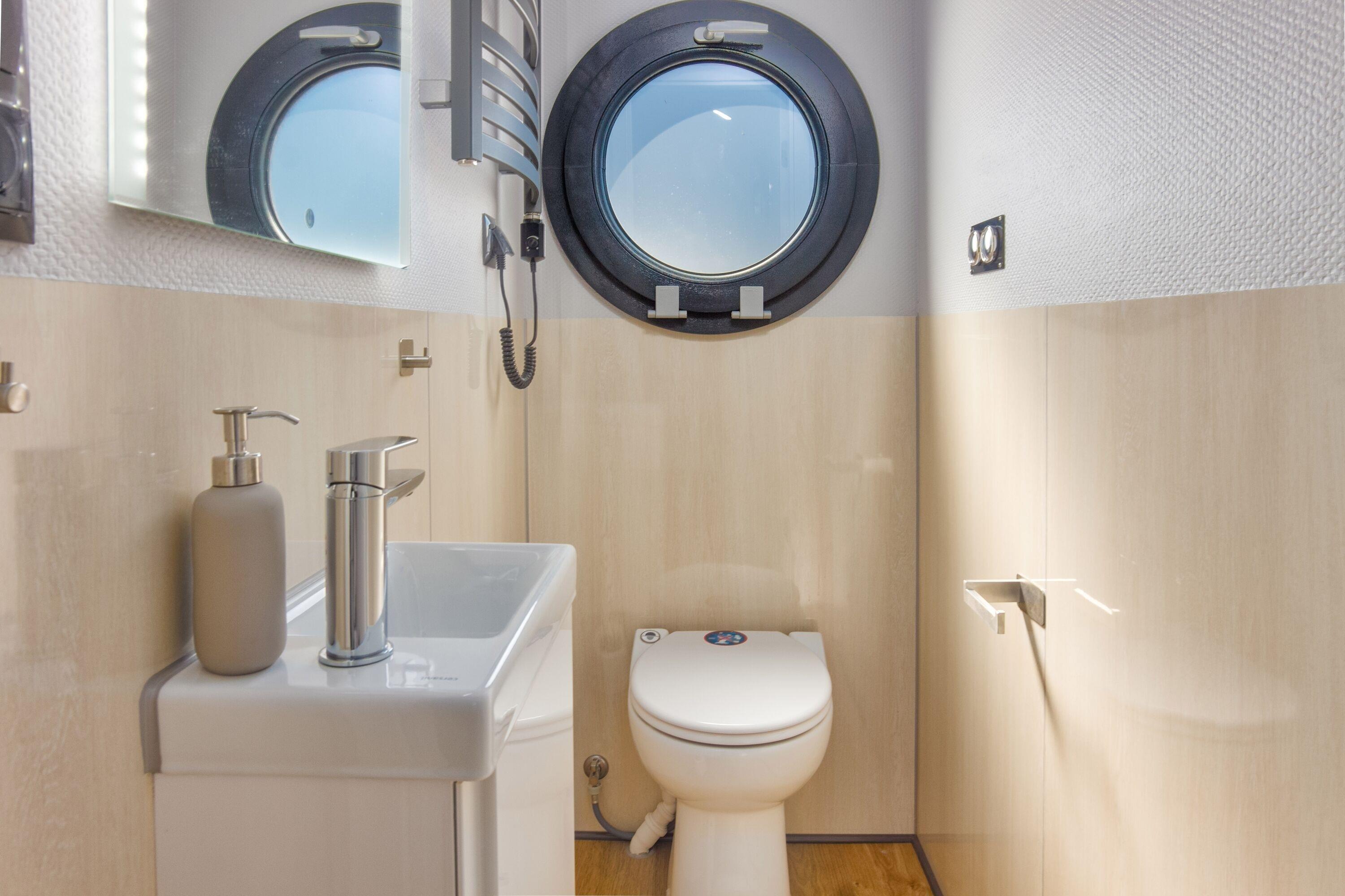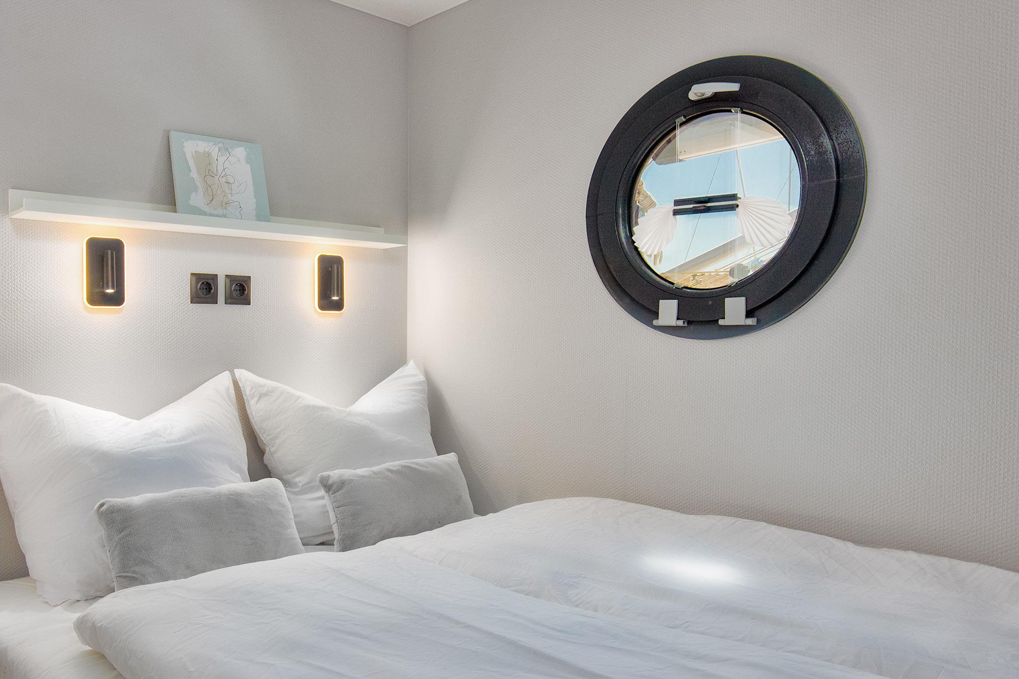 Zwei Schlafräume je mit Doppelbett (140x200) stehen zur Erholung zur Verfügung. Die separate Sauna an Board und das Duschbad sowie ein separates, elektrisches WC bieten entsprechende Annehmlichkeiten an Bord. Zudem sind die sanitären Einrichtungen am Jachthafen nur wenige Meter entfernt nutzbar.