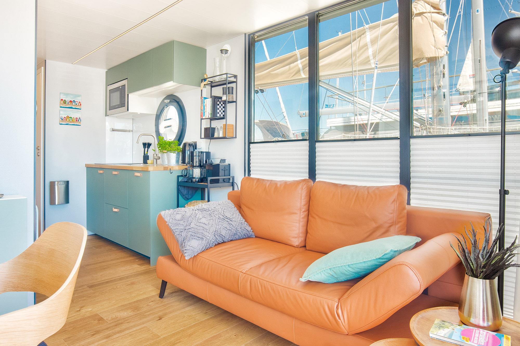 Das exklusive Hausboot Kleine Auszeit mit ca. 32 m² Wohnfläche, separater Bio-Sauna (bis 70°C) und zusätzlich eine möblierte Dachterrasse mit Strandkorb als Sonnendeck, verbunden über eine außenliegende Treppe. Der moderne und konzipierte Wohnbereich bietet Ihnen einen fantastischen Panoramablick über den Jachthafen und vom Sonnendeck über die Ostsee. Näher am Wasser kann man nicht Urlaub machen!