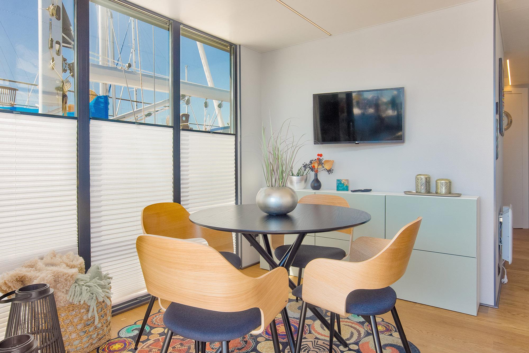 Zur weiteren Gemütlichkeit verfügt das Hausboot selbstverständlich über eine Heizung und teilweise auch Fussbodenheizung. Der vielseitige Essbereich und die offene Küchenzeile mit Induktions-Kochfeld (2 Platten) stehen zur kulinarischen Entfaltung bereit. Dabei müssen Sie auf Ausblick nicht verzichten.