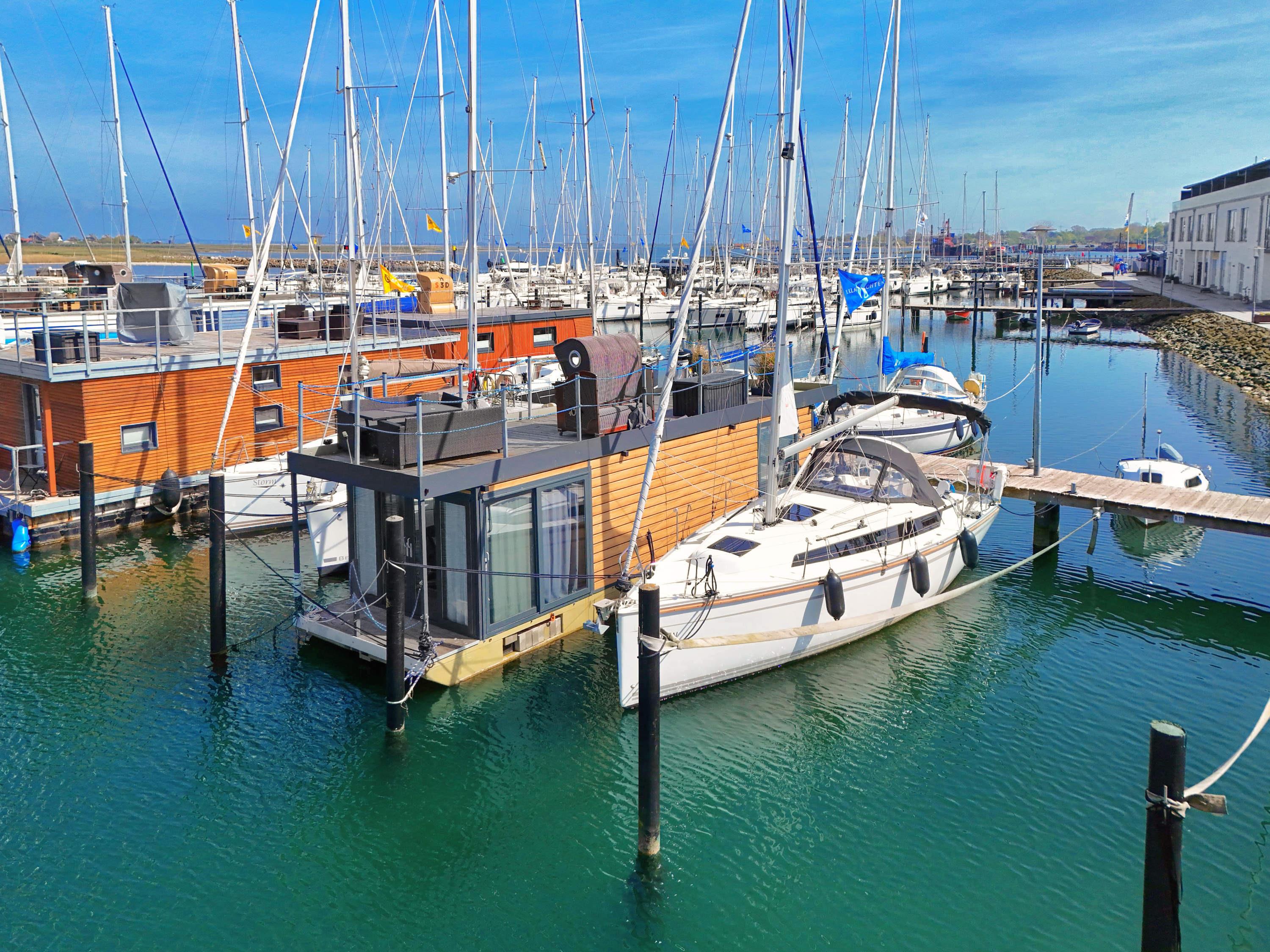 Exklusives Hausboot Meeresbrise in Heiligenhafen mit Panoramablick und möblierter Dachterrasse am Jachthafen.