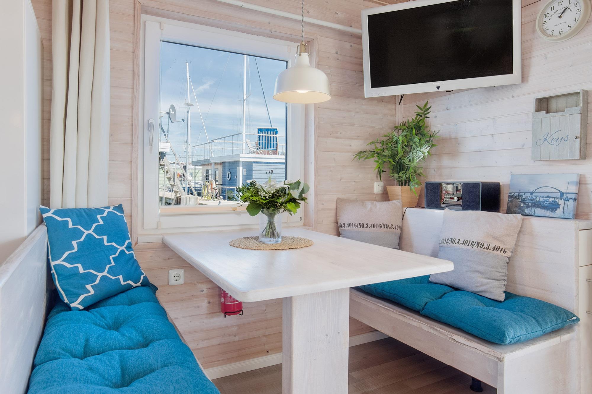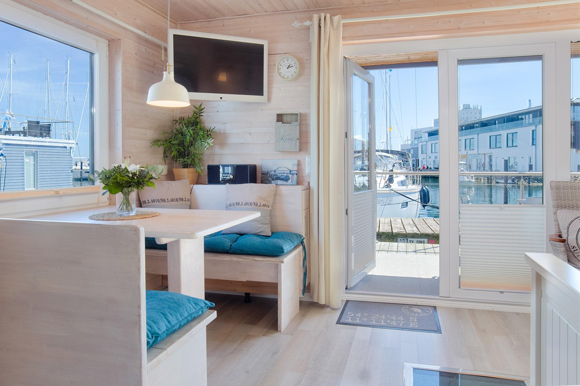 Auf zwei Ebenen erstreckt sich dieses exklusive Hausboot Stina auf ca. 25 m² Wohnfläche und zusätzlich die möblierte Dachterrasse als Sonnendeck, verbunden über eine außenliegende Treppe. Der moderne und konzipierte Wohnbereich bietet Ihnen einen fantastischen Panoramablick über den Jachthafen und vom Sonnendeck über die Ostsee. Näher am Wasser kann man nicht Urlaub machen!