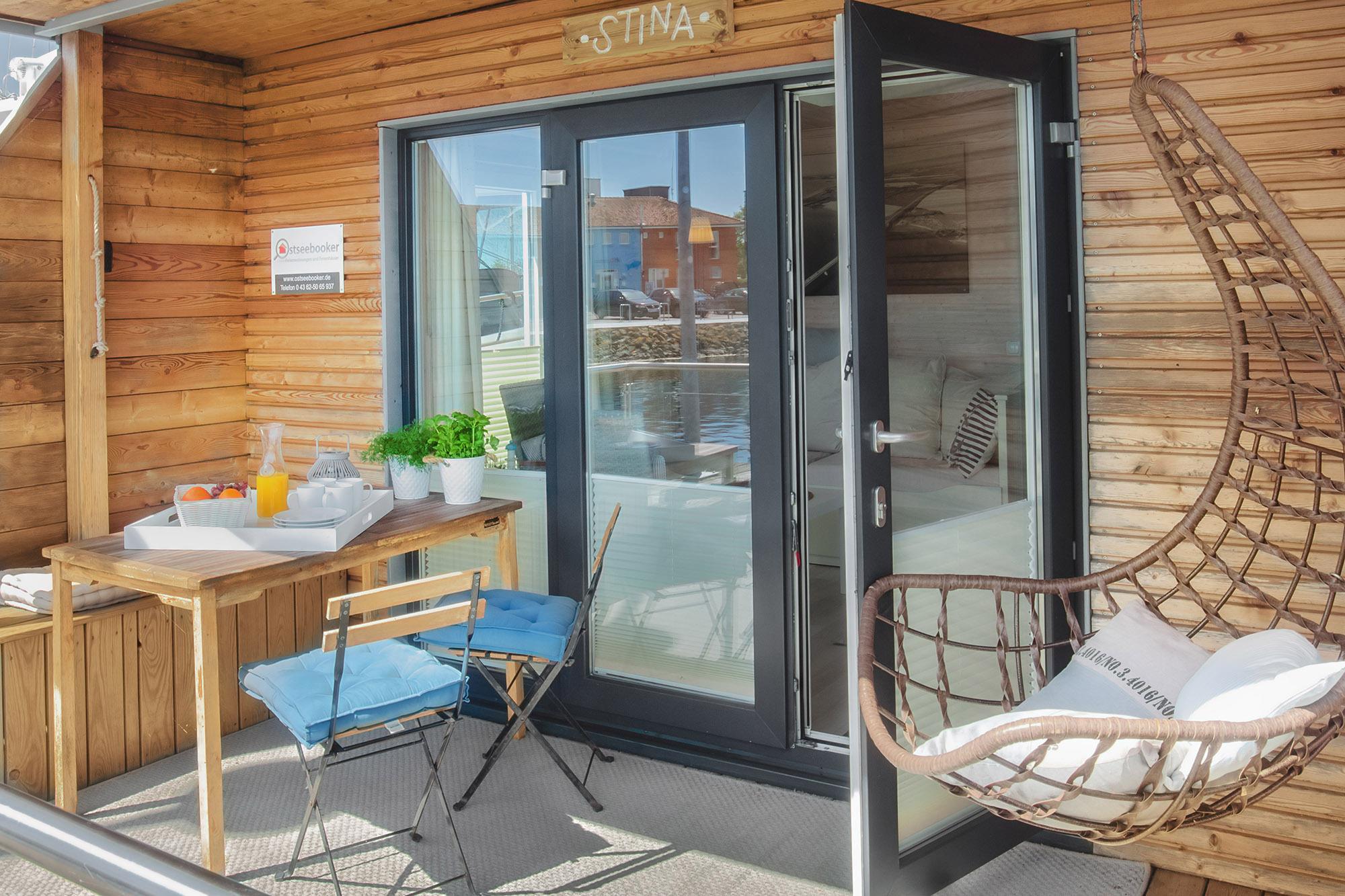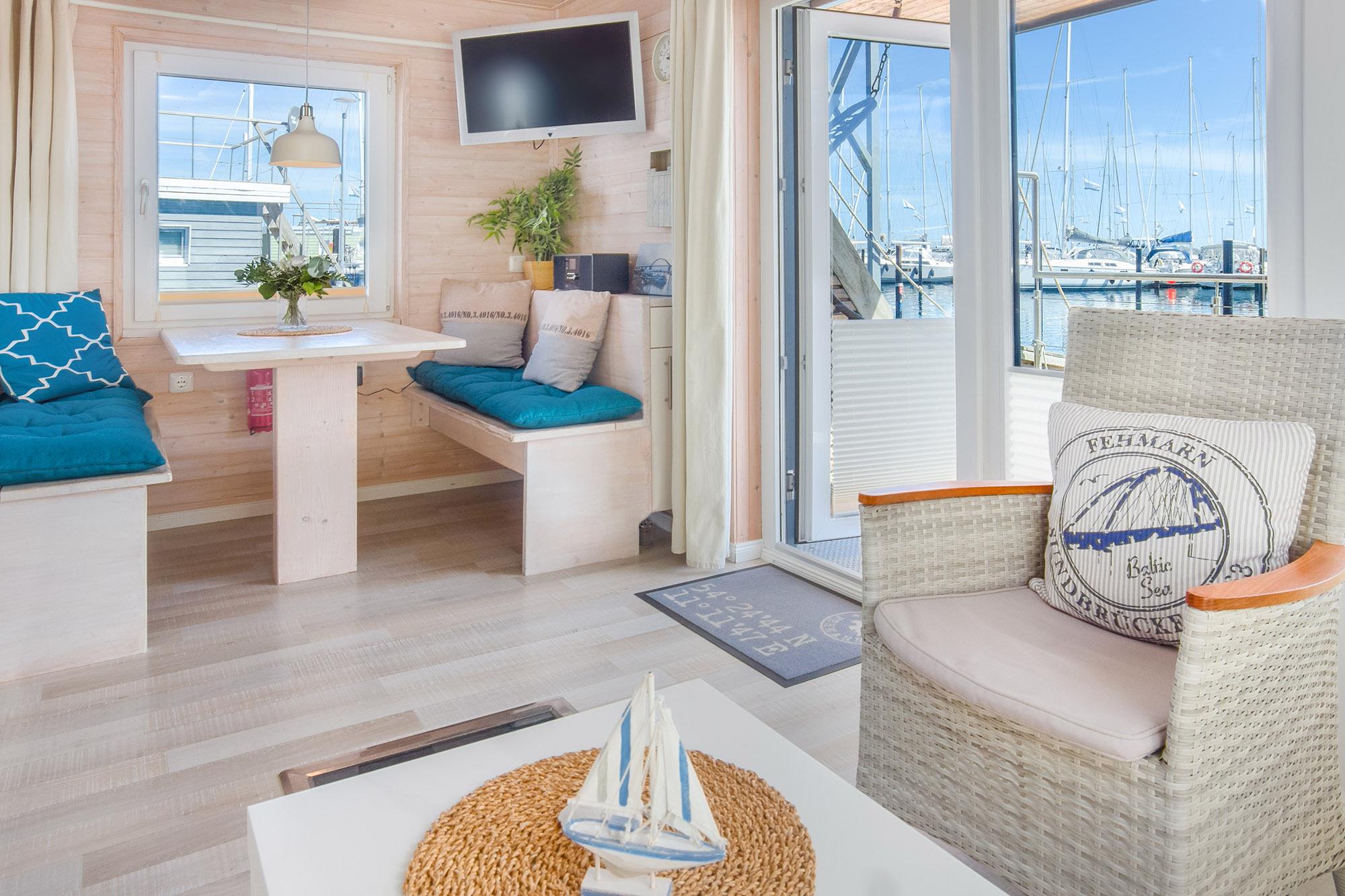 Erleben Sie exklusiven Urlaub auf dem Hausboot Stina mit Panoramablick auf den Jachthafen in Heiligenhafen.