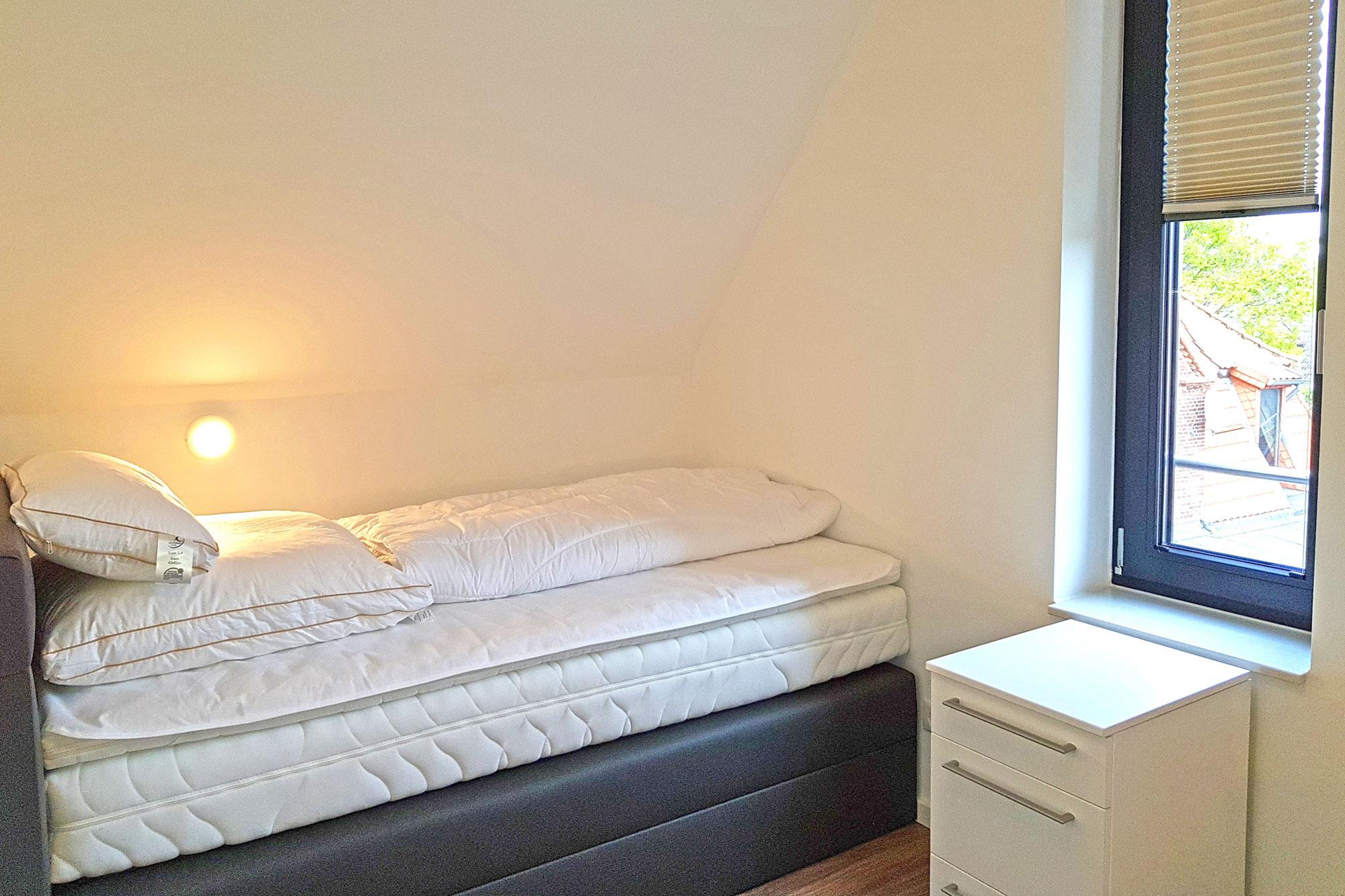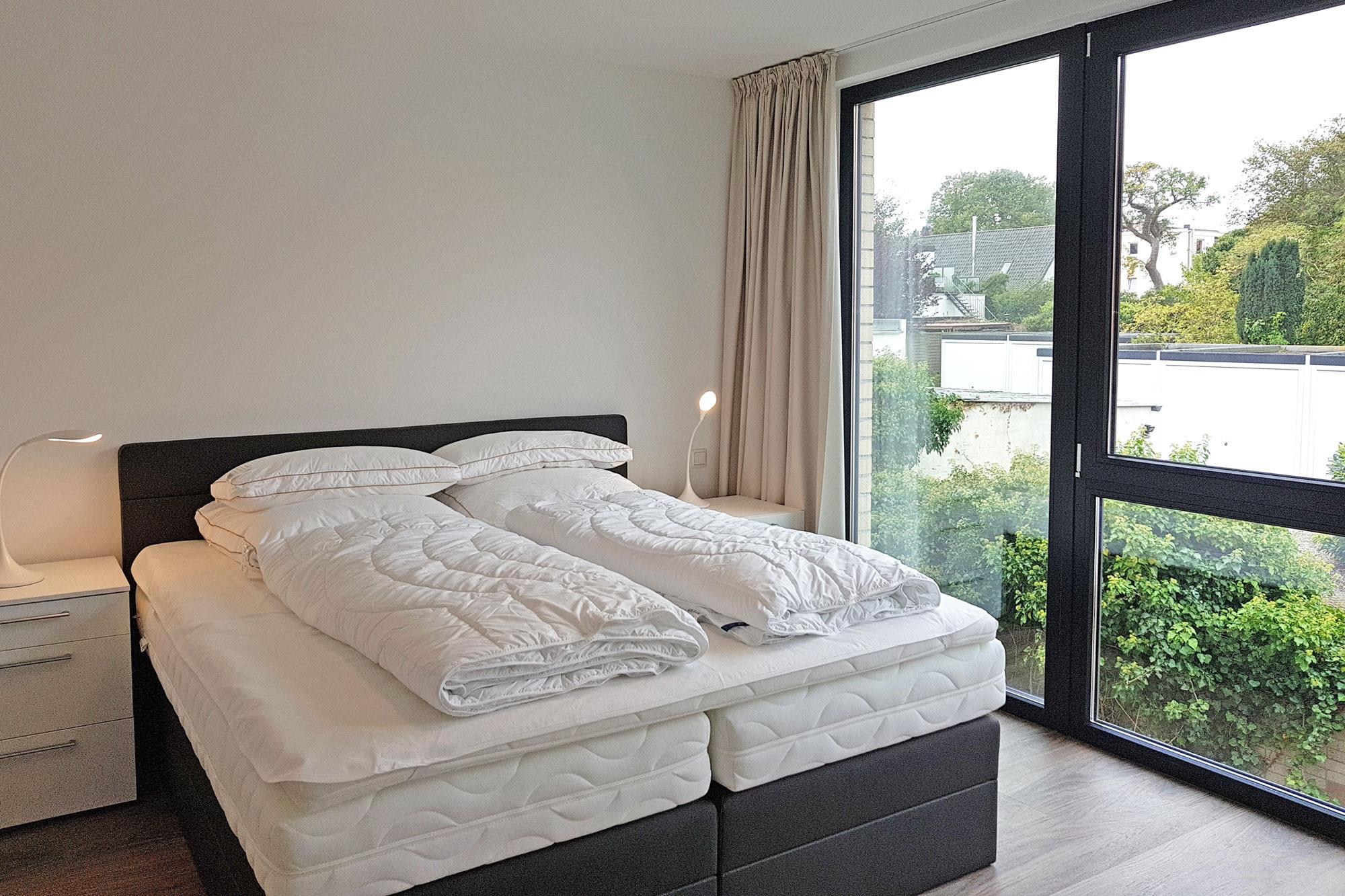 Drei komfortable Schlafzimmer bieten ausreichend Platz für Familien und kleine Gruppen. Im ersten Obergeschoss befindet sich ein Doppelboxspringbett mit eigenem TV, während das Dachgeschoss ein weiteres Doppelboxspringbett mit TV sowie zwei Einzelbetten beherbergt. Baby-Reisebett und Hochstuhl gehören zur Ausstattung, und gegen eine kleine Gebühr können Allergiker-geeignete Bettwäsche und Handtuchsets hinzugebucht werden. Vorhänge und Plissees sorgen für Verdunklung und eine erholsame Nachtruhe.