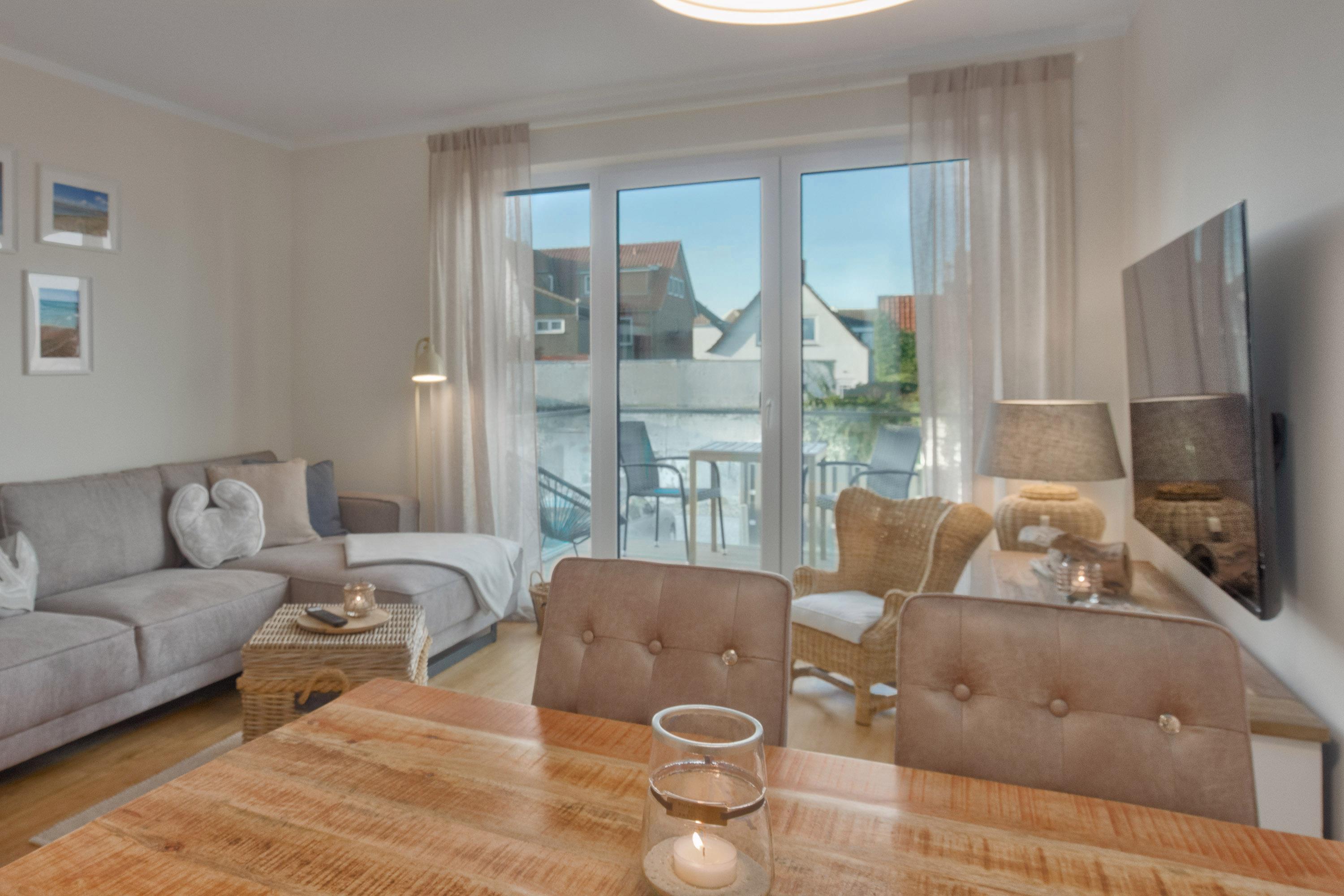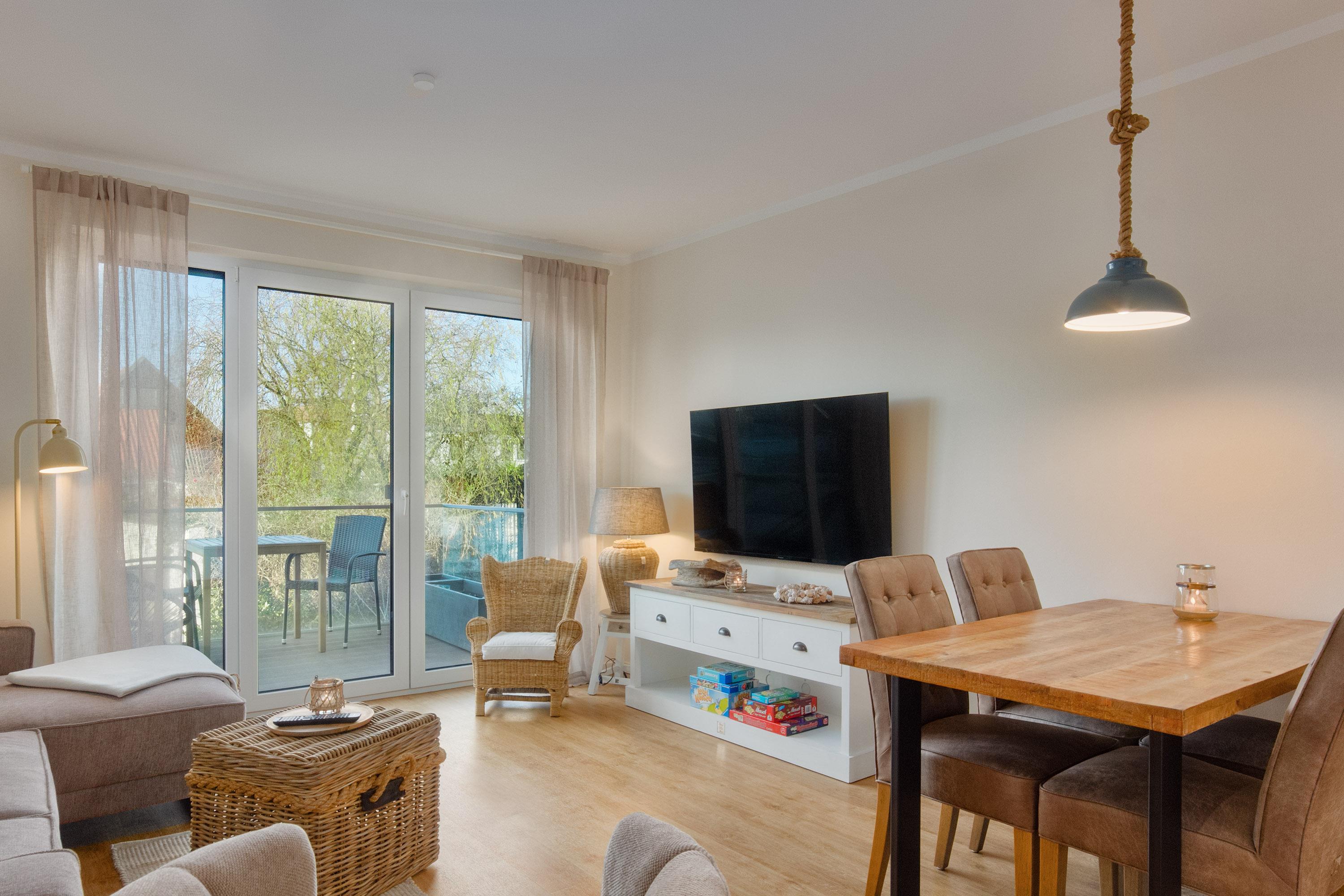 Zu den weiteren Ausstattungsmerkmalen gehören ein möblierte Balkon und ein gemeinschaftlich nutzbarer, offener Gartenbereich. Der Balkon der Wohnung schließt direkt an den Wohnbereich an. Dieser lädt dazu ein, den Tag mit einer Tasse Kaffee an der frischen Seeluft zu beginnen oder laue Sommerabende entspannt ausklingen zu lassen.