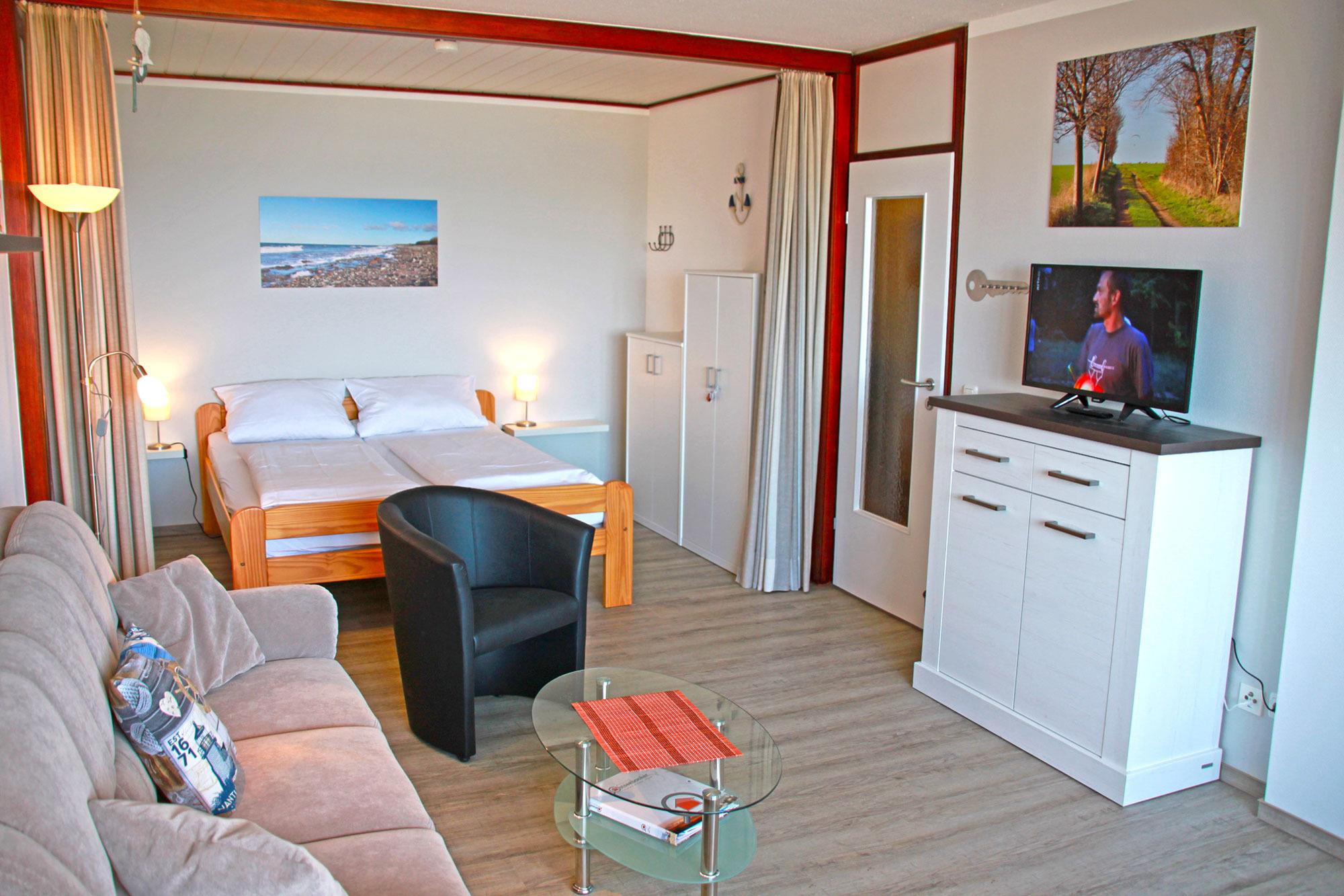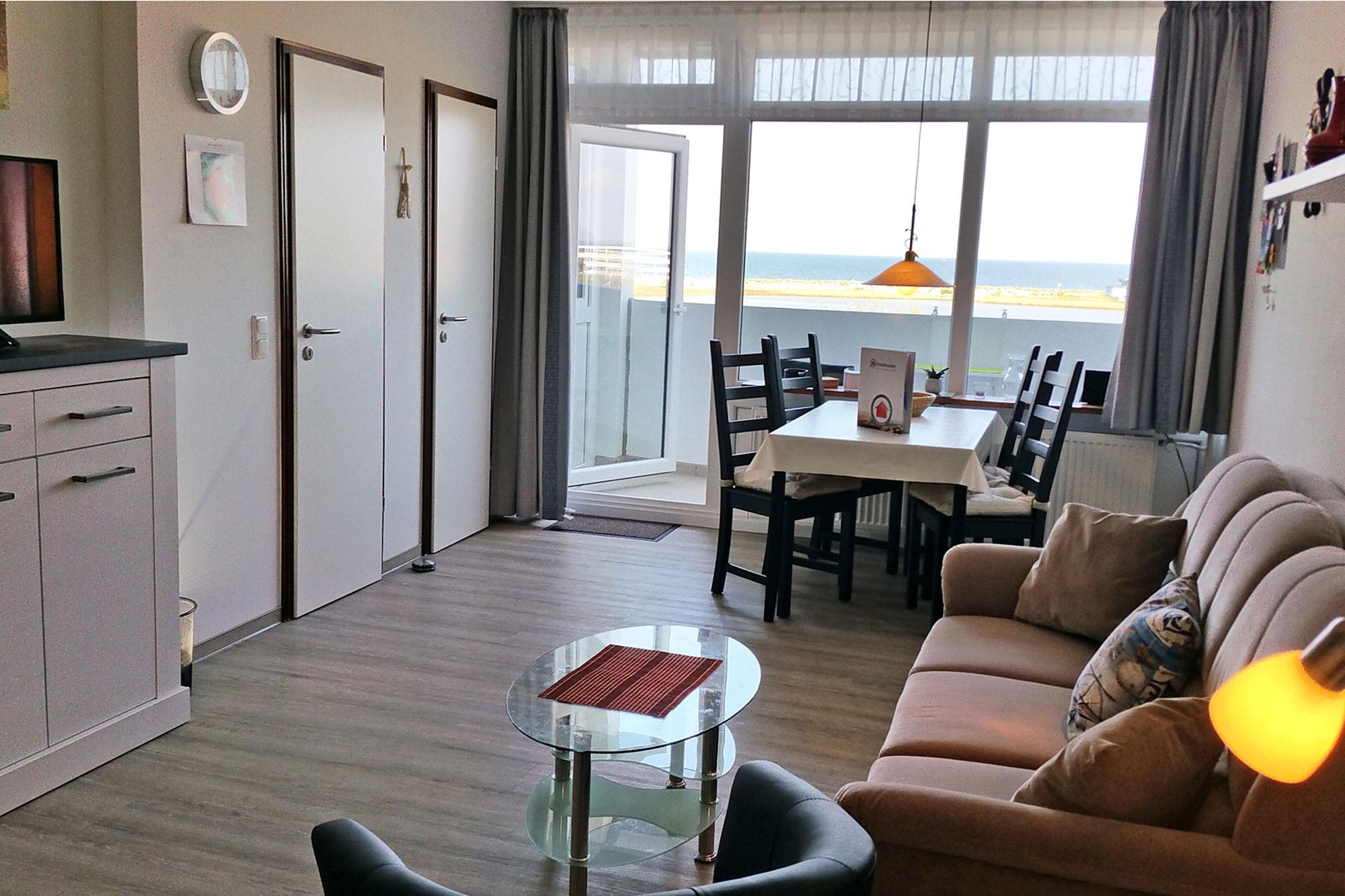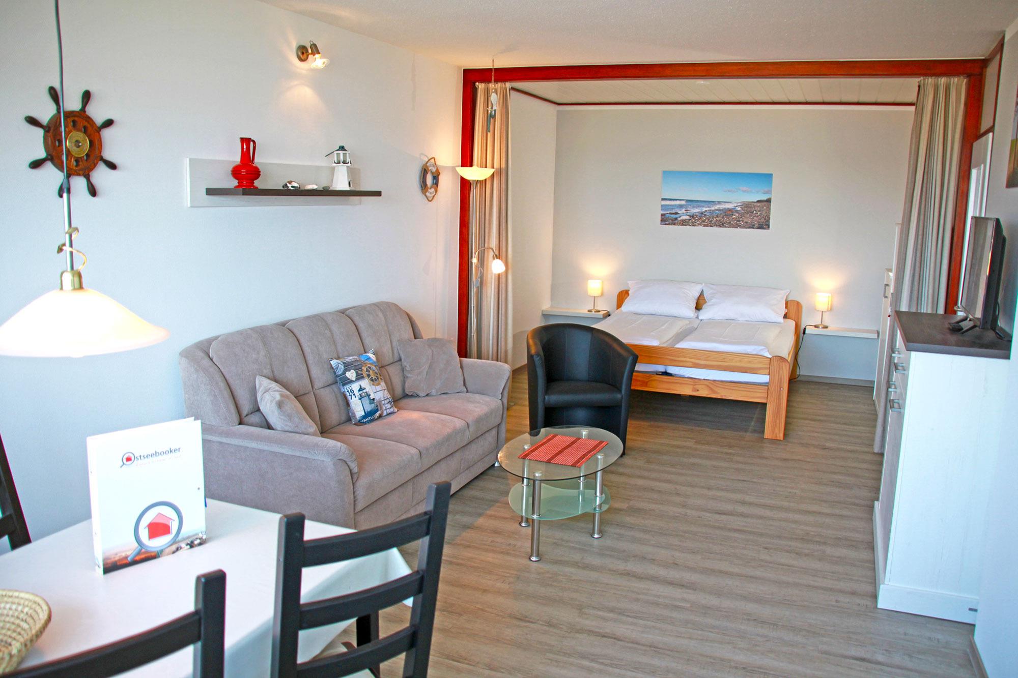 Die helle Wohnung ist ideal für einen erholsamen Urlaub und bietet Platz für bis zu 3 Personen. Der gemütliche Wohnbereich ist mit einer bequemen Couch, einem Sessel, einem Fernseher und kostenlosem WLAN ausgestattet, sodass Sie nach einem Tag am Strand wunderbar entspannen können. Der pflegeleichte PVC-Boden in Laminatoptik ist besonders praktisch, wenn Sie Sand von Ihrem Strandbesuch mit nach Hause bringen.