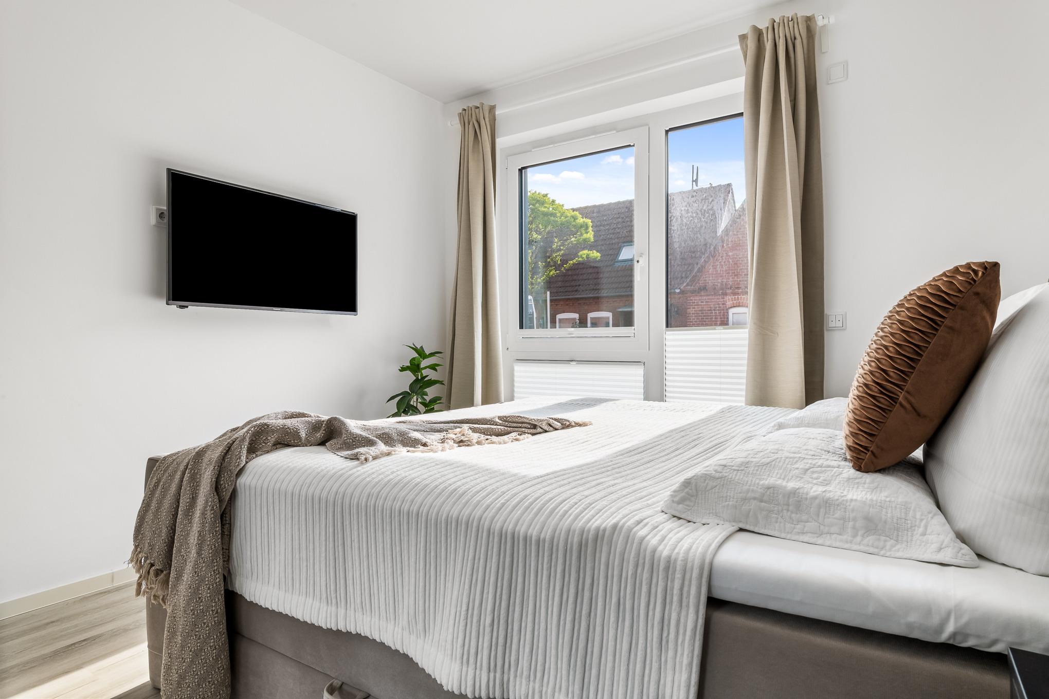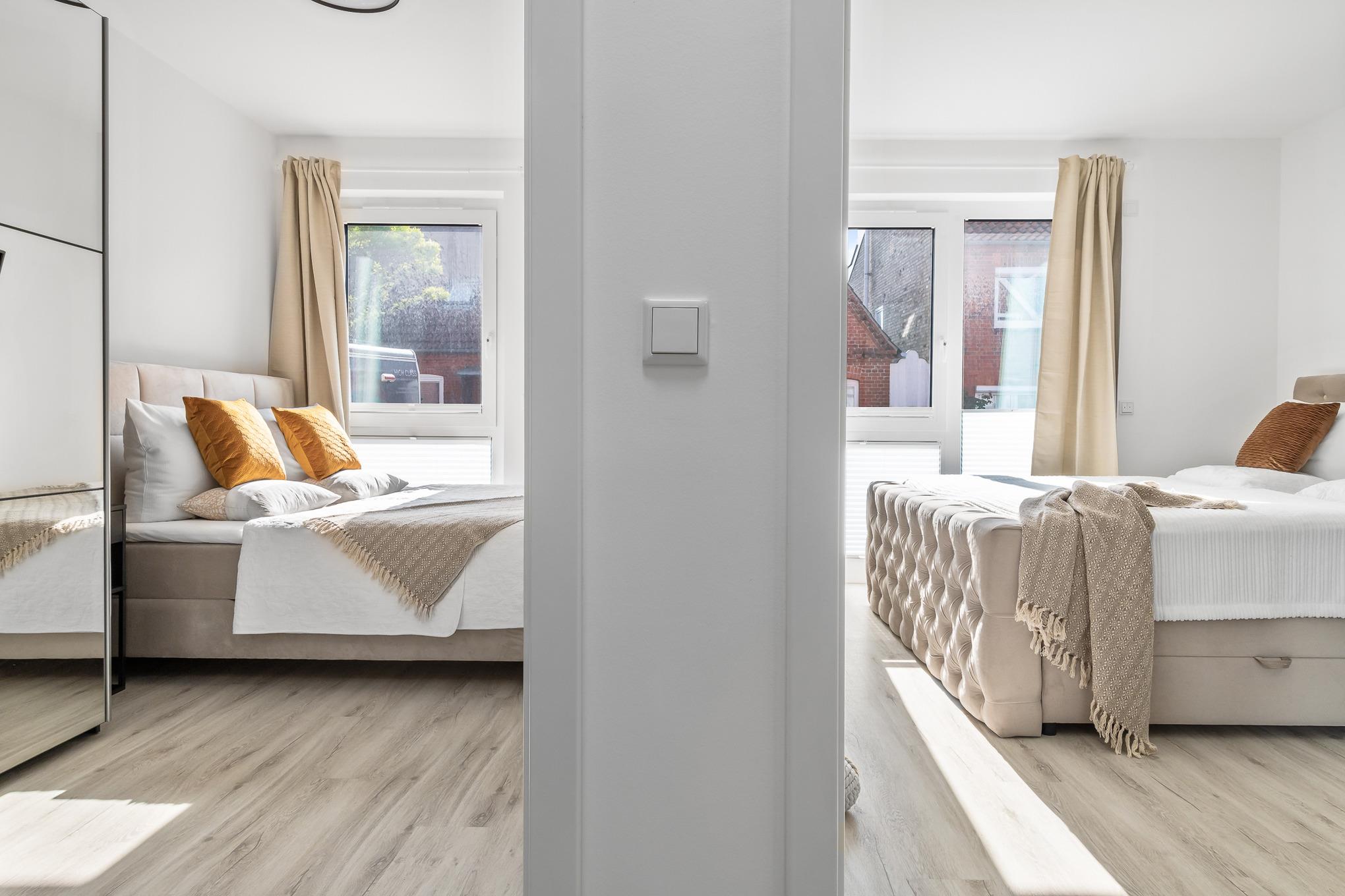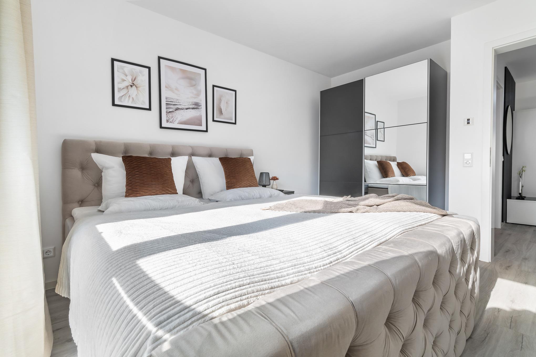 Ebenso komfortabel geht es in den zwei Schlafzimmern der Wohnung weiter. Hier warten einladende Doppelboxspringbetten (180x200 + 160x200), große Kleiderschränke und jeweils zusätzlich ein TV. Für Verdunklung sorgen Plissees und Vorhänge.