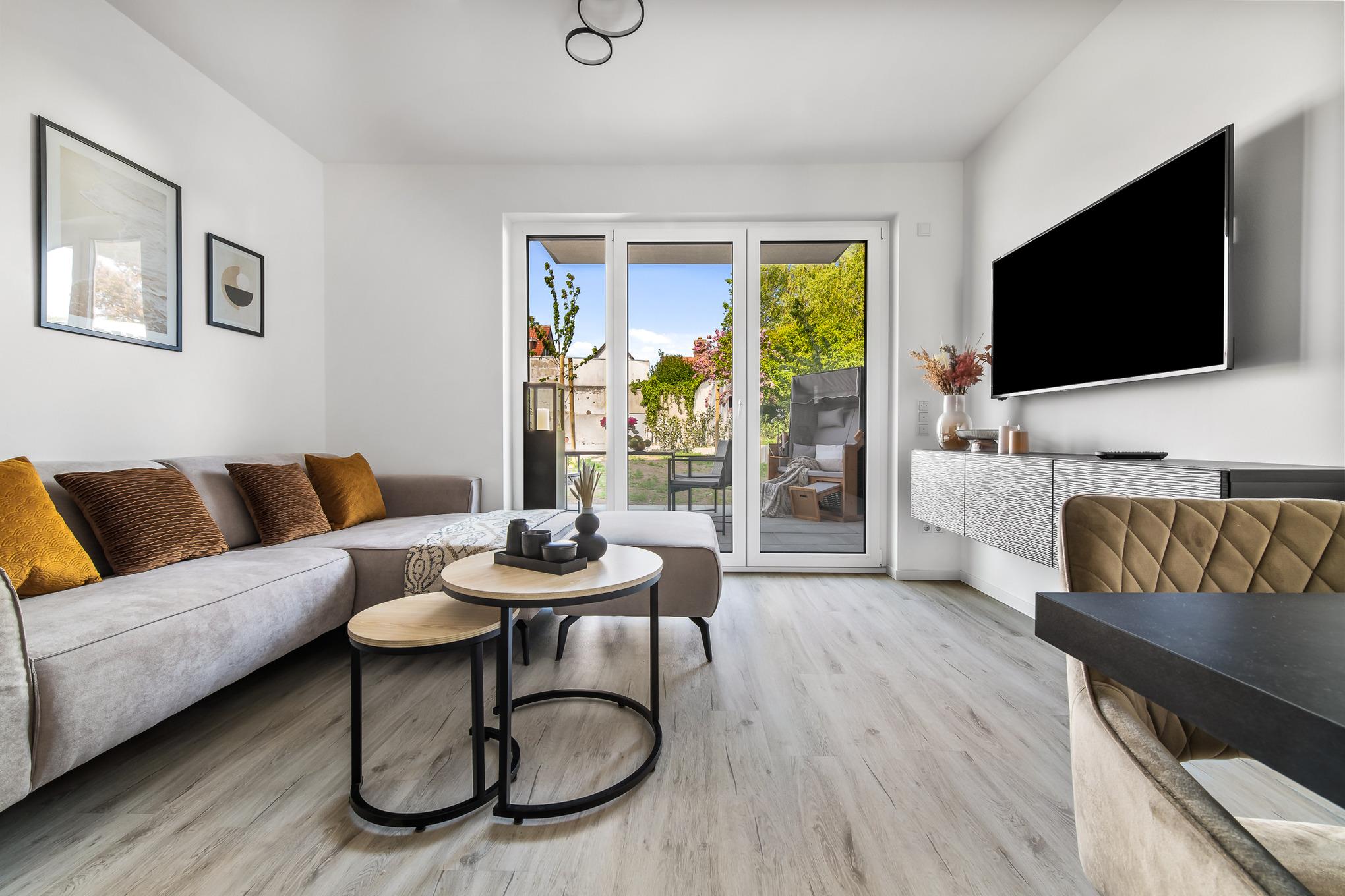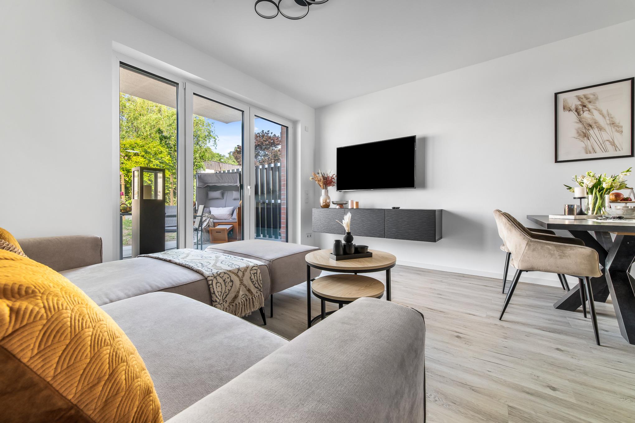 Moderne Ferienwohnung mit Terrasse, Gartenblick und Tiefgaragenstellplatz in Heiligenhafen.
