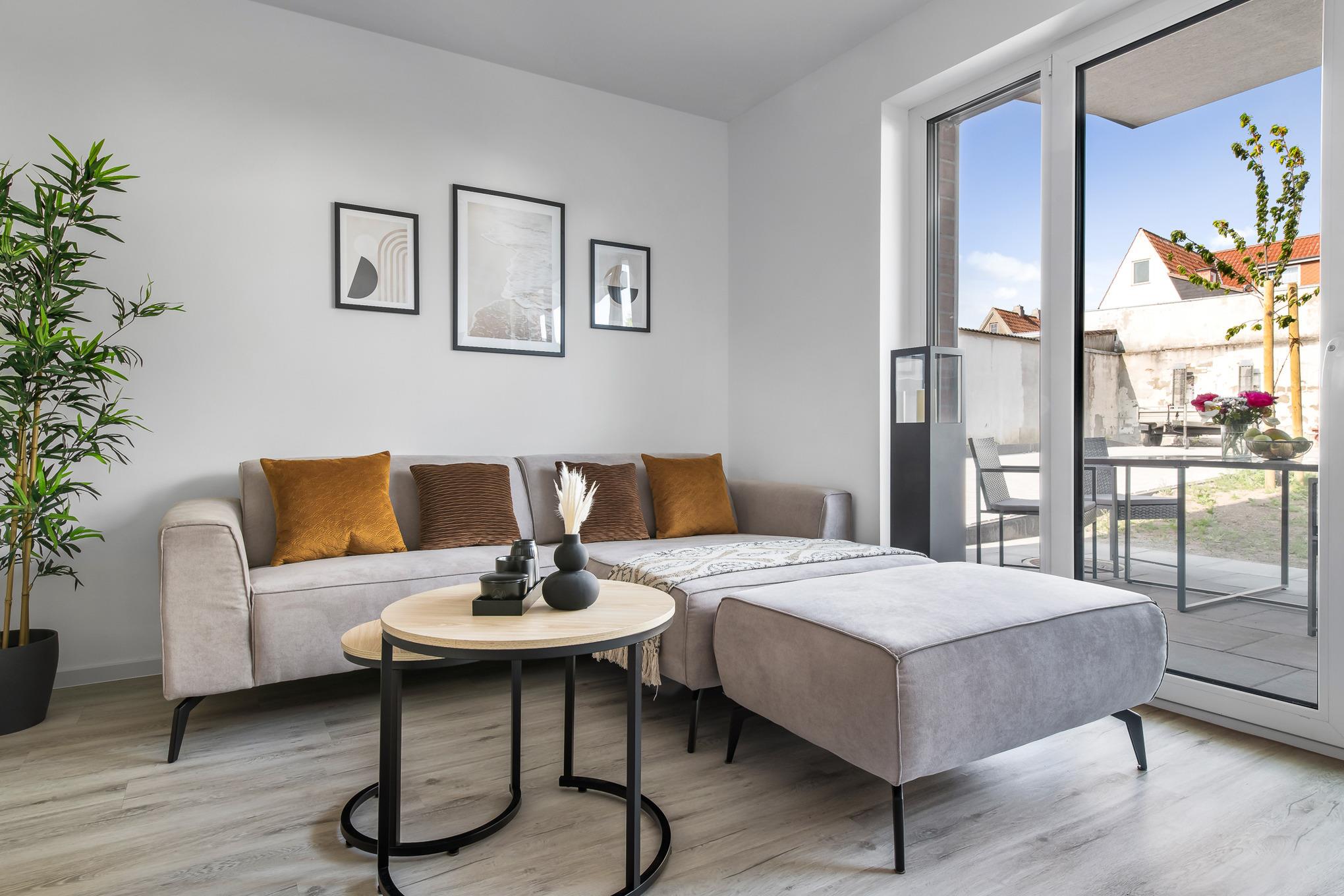 Zu den weiteren Ausstattungsmerkmalen gehören eine möblierte Terrasse und ein gemeinschaftlich nutzbarer, offener Gartenbereich. Die Terrasse der Wohnung schließt direkt an den Wohnbereich an. Diese lädt dazu ein, den Tag mit einer Tasse Kaffee an der frischen Seeluft zu beginnen oder laue Sommerabende entspannt ausklingen zu lassen.
