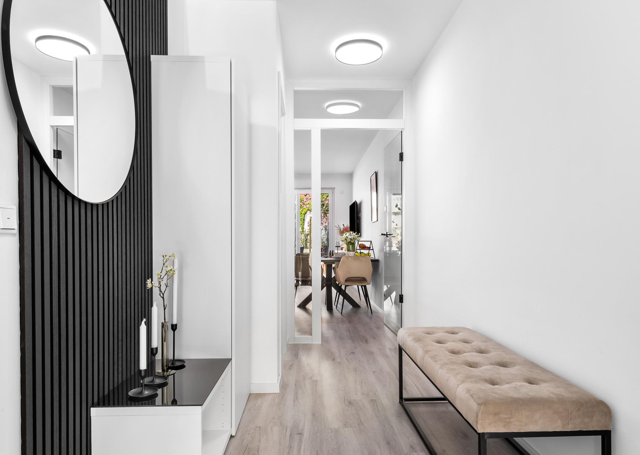 Das gut geschnittene, moderne Duschbad direkt neben dem Schlafzimmer sorgt für weitere Bequemlichkeit. Die ebenerdige Dusche, WC, Waschbecken, Spiegel und ein Handtuchwärmer runden den Raum ab.