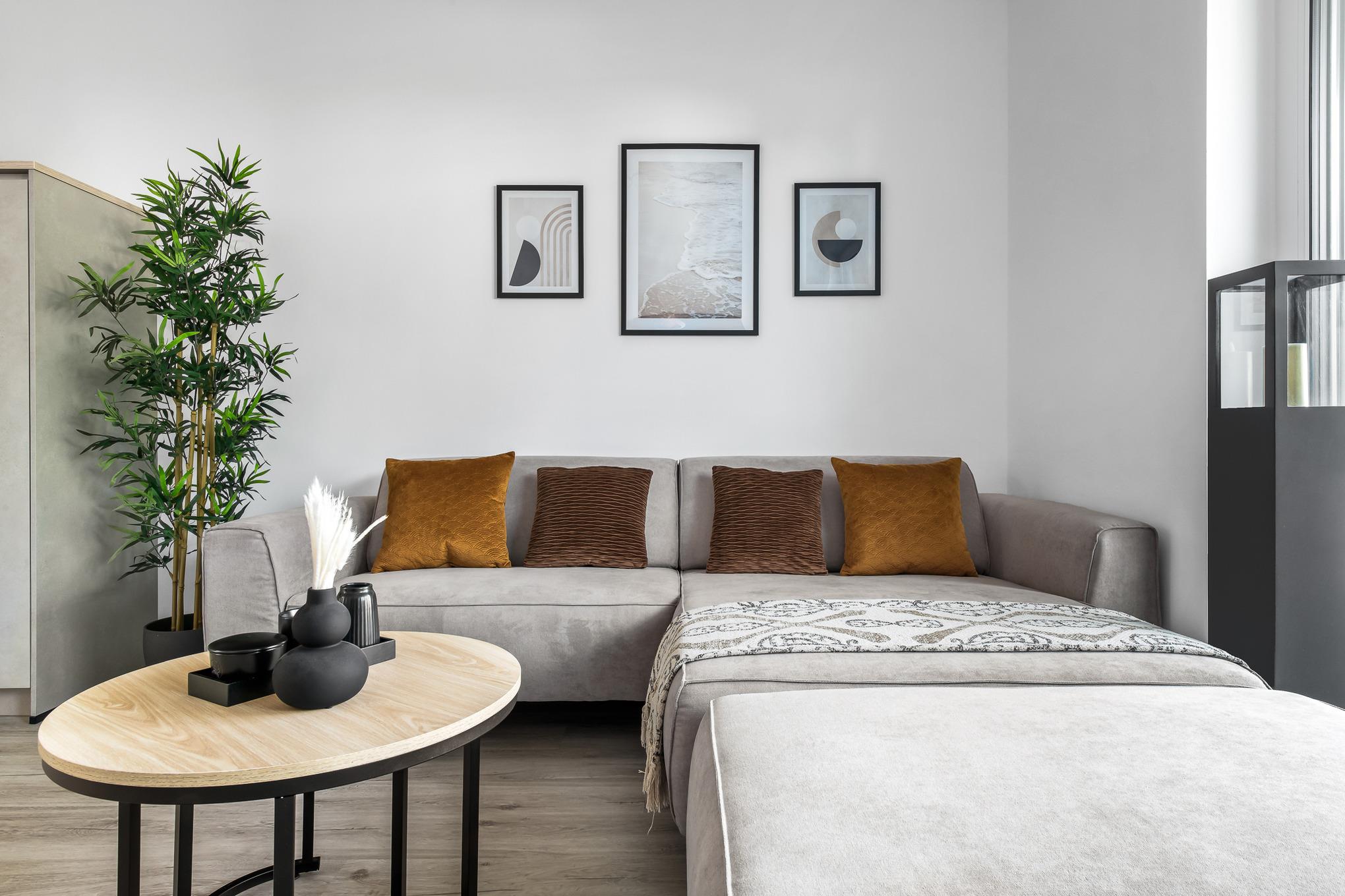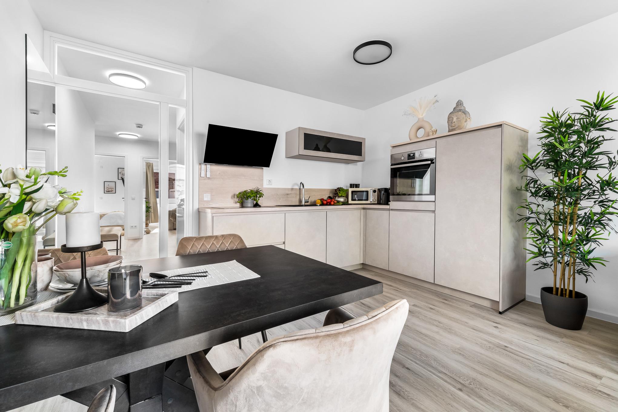Auch die Küchenzeile wurde in den Wohnbereich integriert. Modern und durchdacht gestaltet, bietet Ihnen die Einbauküche alle Annehmlichkeiten für eine sorgenfreie Selbstversorgung. Als Kaffeemaschine steht Ihnen eine Kapselmaschine zur Verfügung.