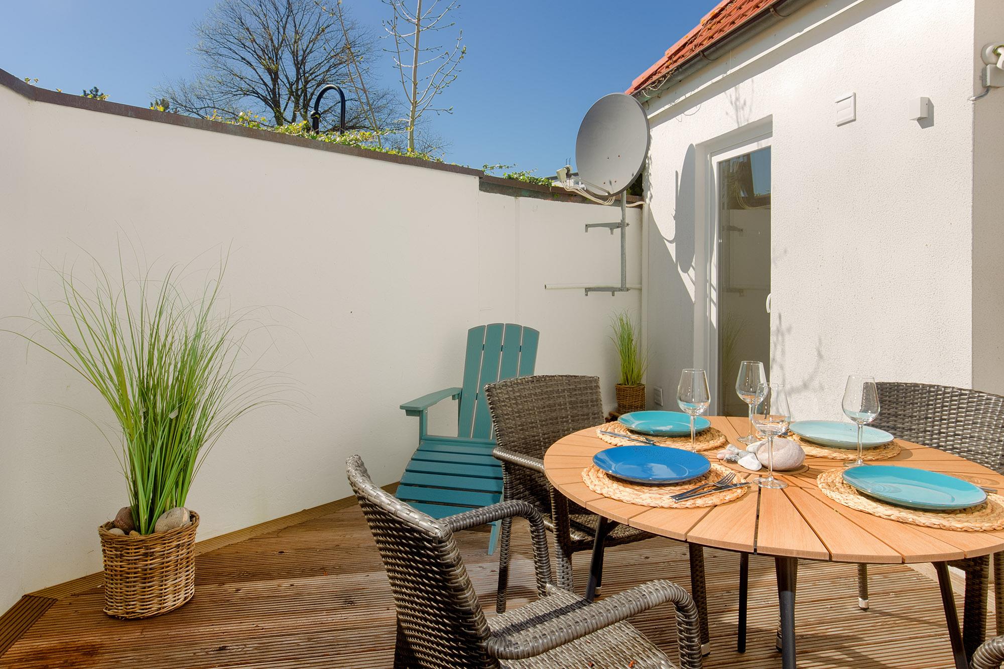 Die Terrasse verfügt über ein seitliches Schiebetor, über das Sie bequem Strandsachen oder auch Fahrräder sicher einstellen können.