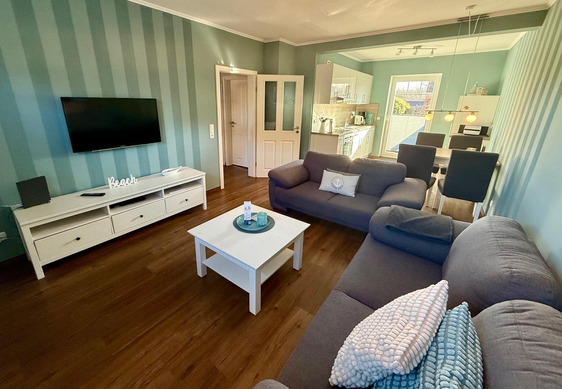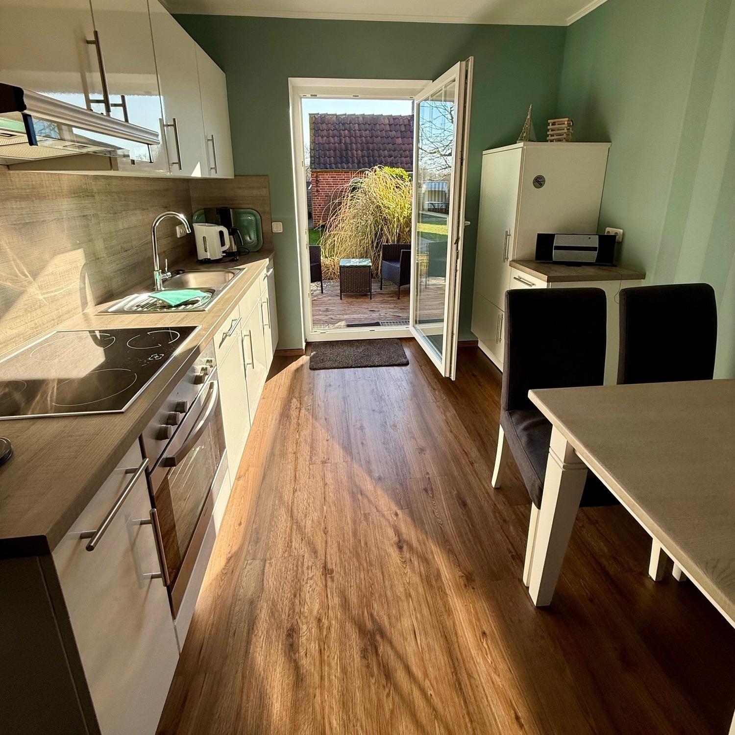 Herzstück des Ferienhauses ist der freundlich gestaltete Wohnbereich, der ausreichend Platz für gemeinsame Stunden bietet. Hier können Sie entspannen, den Tag Revue passieren lassen oder gemütliche Abende vor dem Fernseher verbringen. Die angrenzende Küchenzeile ist funktional ausgestattet und bietet alles, was Sie für die Selbstversorgung während Ihres Aufenthaltes benötigen. Ein Geschirrspüler sorgt für zusätzlichen Komfort, während die Kaffeemaschine den perfekten Start in den Urlaubstag ermöglicht.