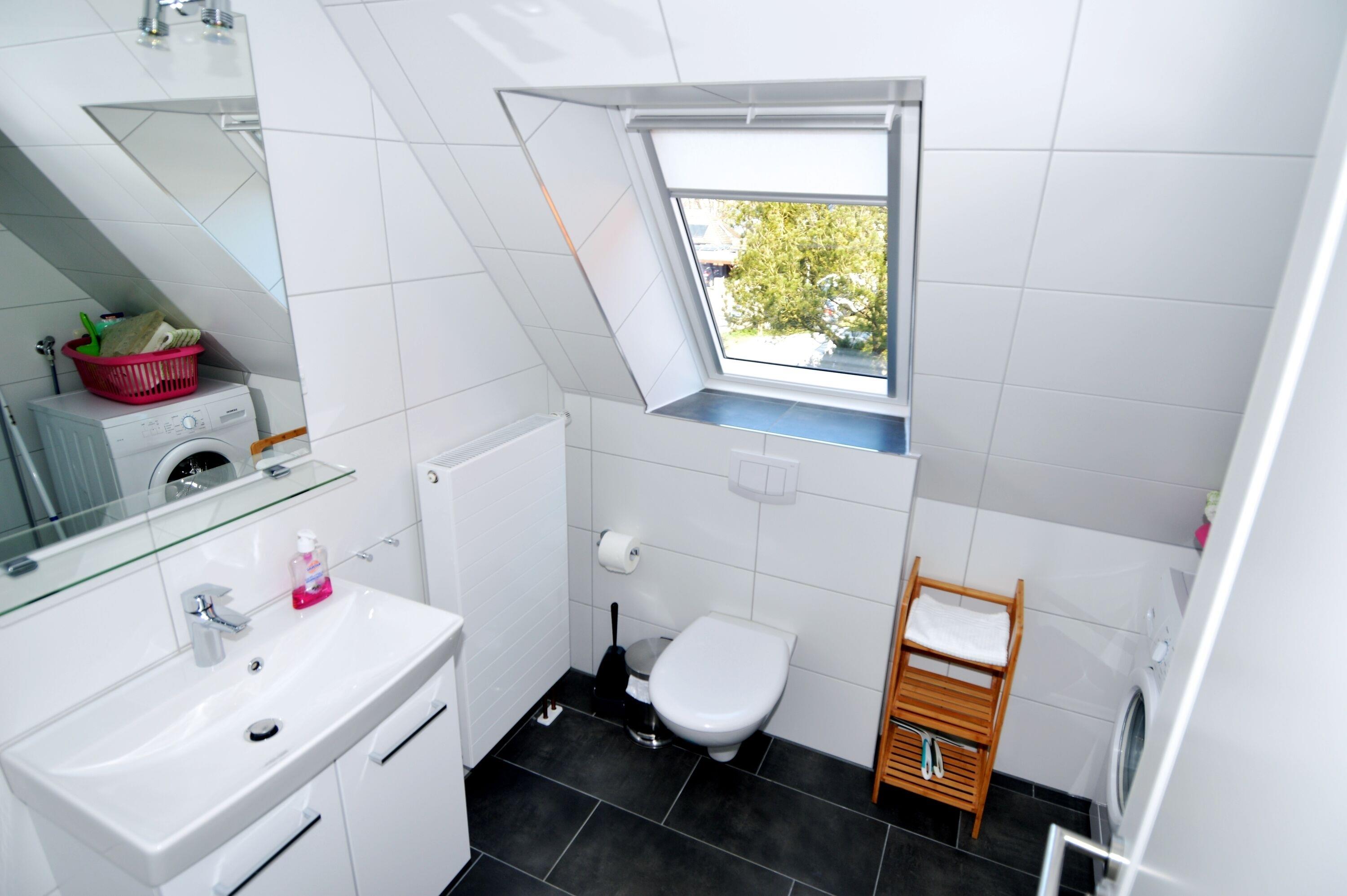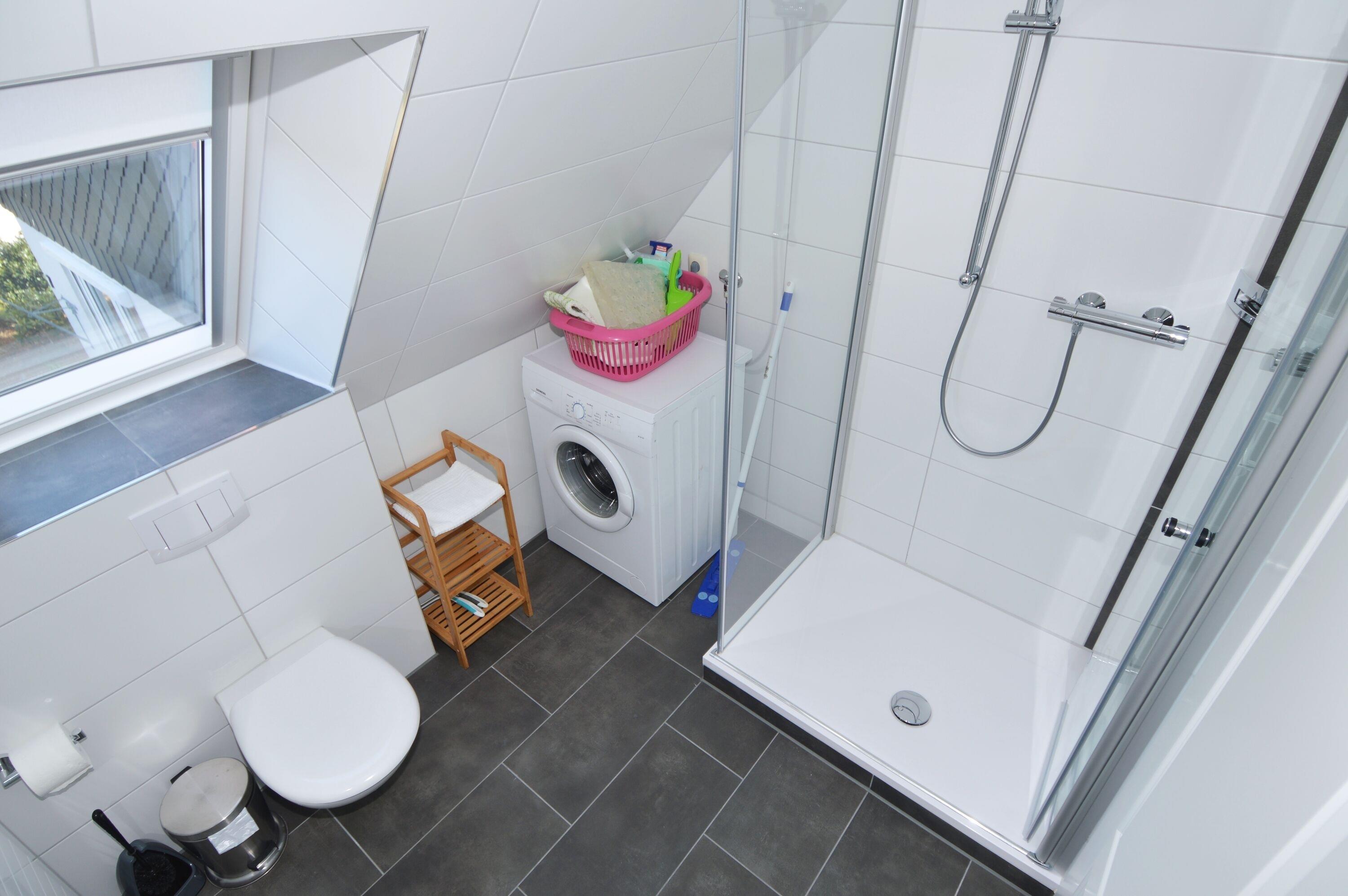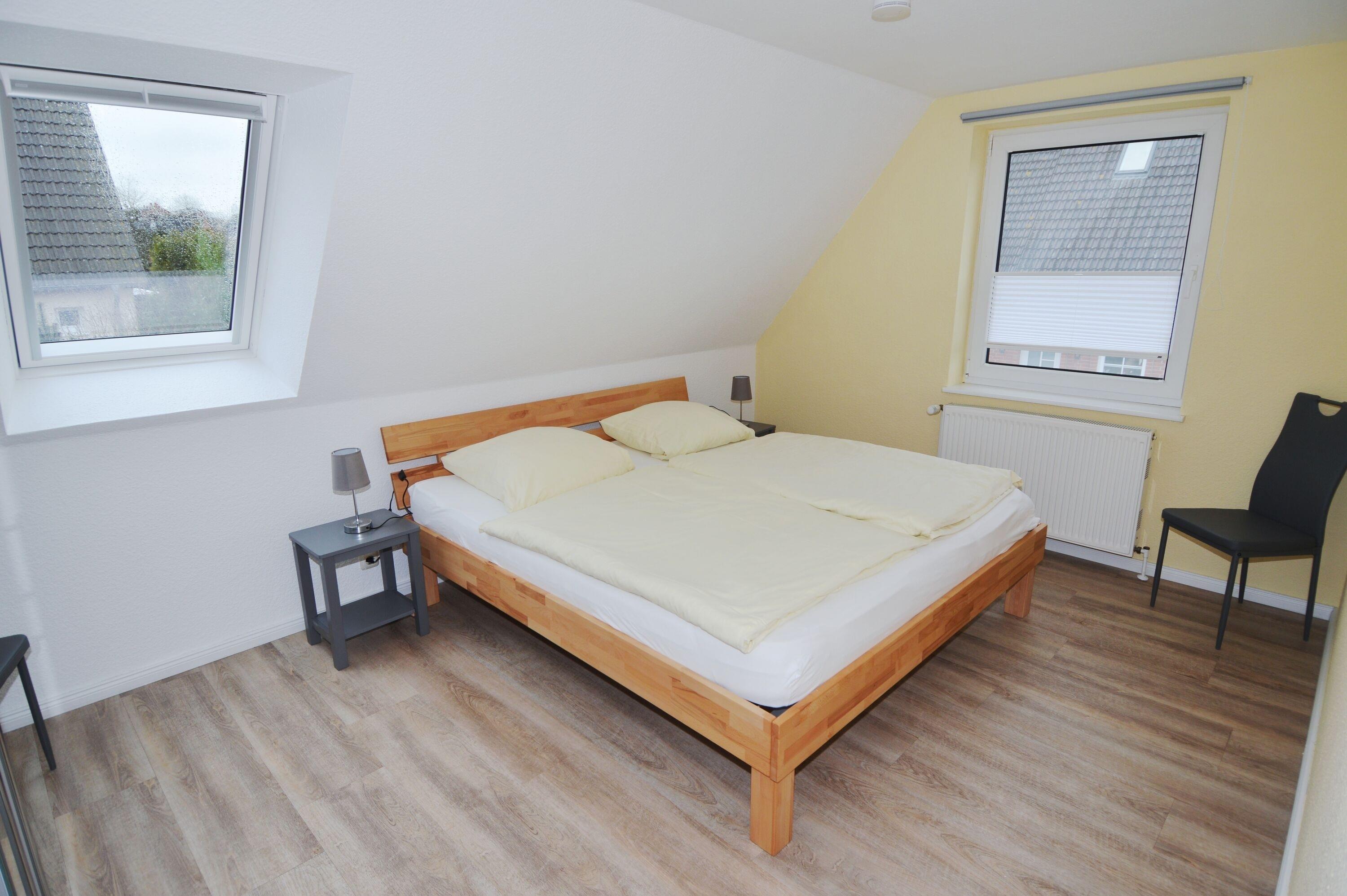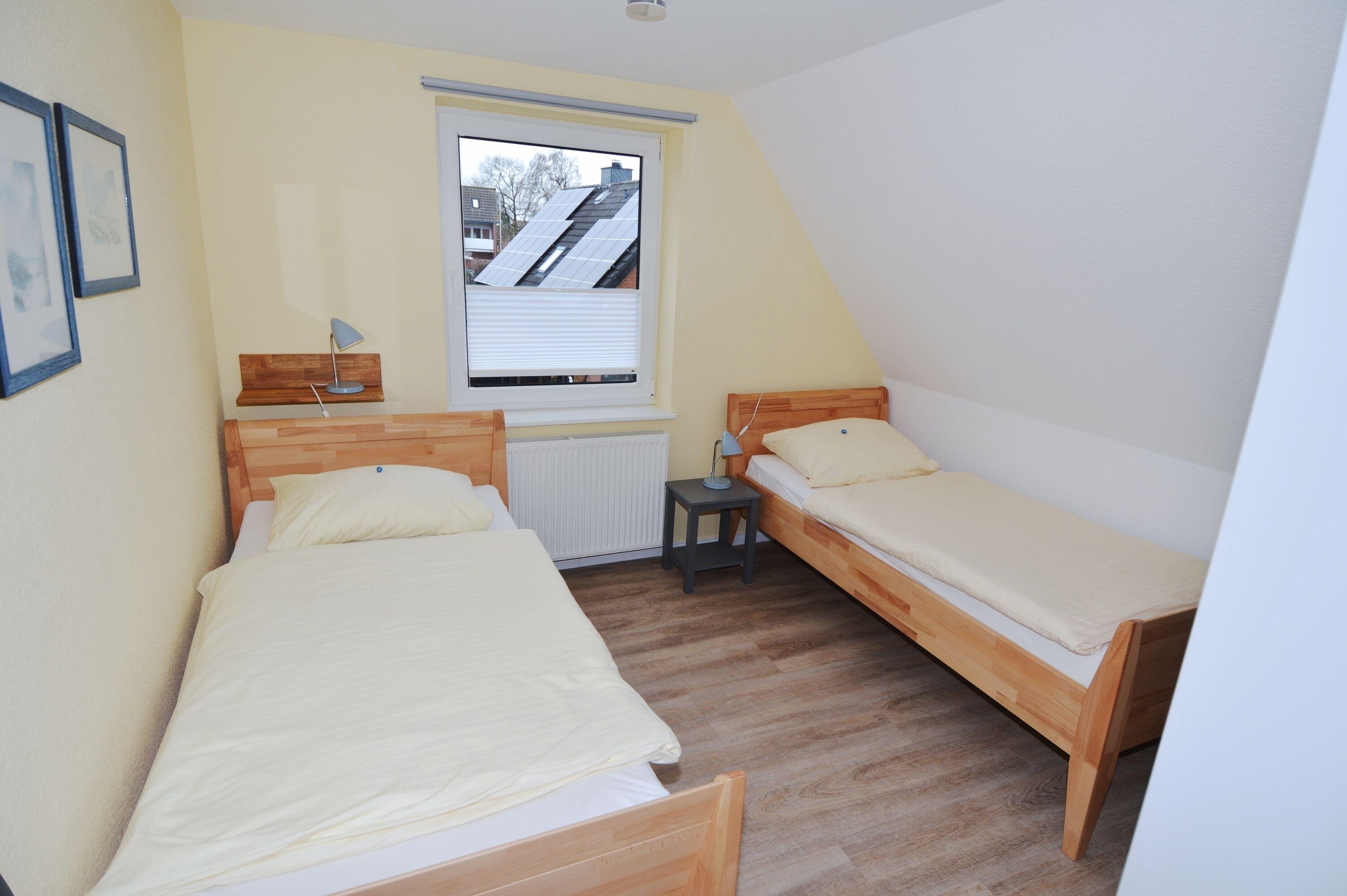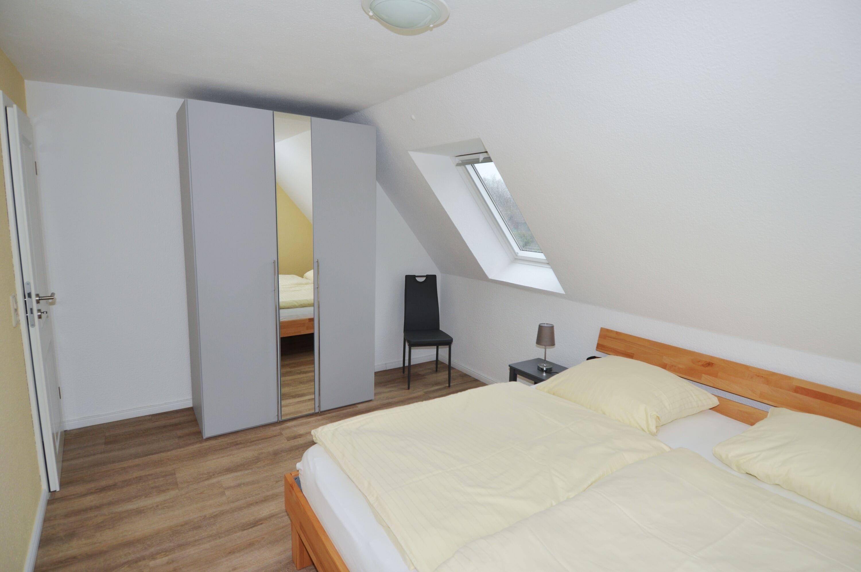 Diese komfortabel ausgestattete Ferienwohnung für 4 Personen befindet sich im Obergeschoss eines Ferienhauses mit 2 Wohneinheiten. Ein Schlafzimmer mit Doppelbett und Kleiderschrank, ein Babybett lässt sich ohne Probleme auch noch aufstellen. Das zweite Schlafzimmer befindet sich direkt nebenan und bietet zwei Einzelbetten und einen Kleiderschrank. Im modernen Duschbad befindet sich eine eigene Waschmaschine.