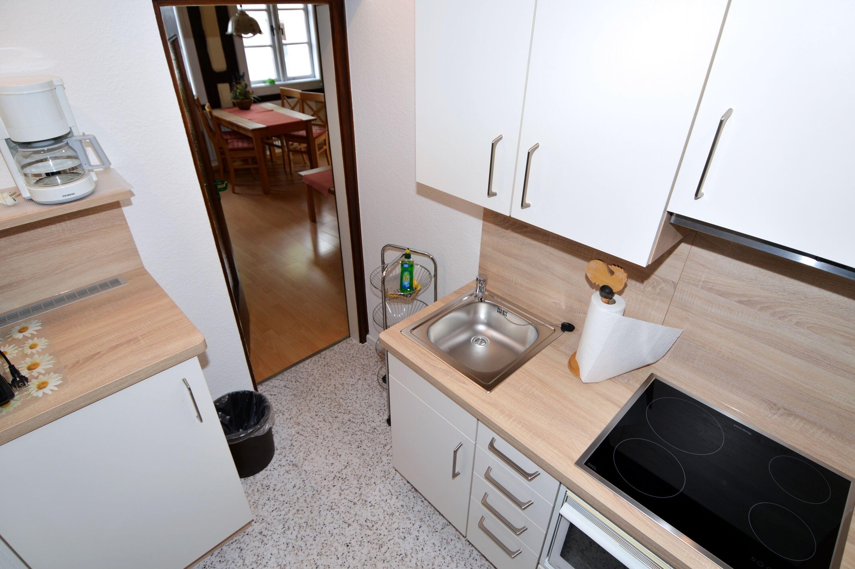 Die Küche ist funktional und gut ausgestattet und bietet alles, was Sie für die Selbstversorgung während Ihres Aufenthaltes benötigen. Ein Cerankochfeld, ein Backofen, ein Kühlschrank mit Gefrierfach, eine Kaffeemaschine, ein Toaster sowie ein Wasserkocher ermöglichen eine unkomplizierte Zubereitung Ihrer Mahlzeiten – vom Frühstück bis zum Abendessen.