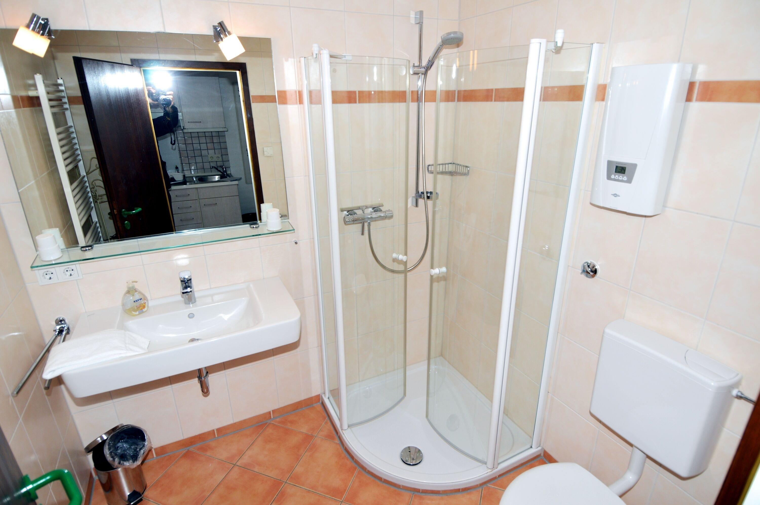 Das Badezimmer ist modern und gepflegt gestaltet und verfügt über eine Dusche, ein Waschbecken, ein WC sowie einen Handtuchwärmer, der besonders an kühleren Tagen für zusätzlichen Komfort sorgt.