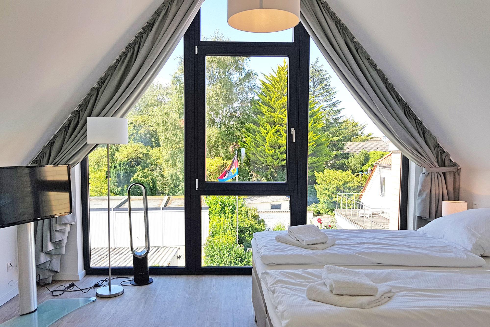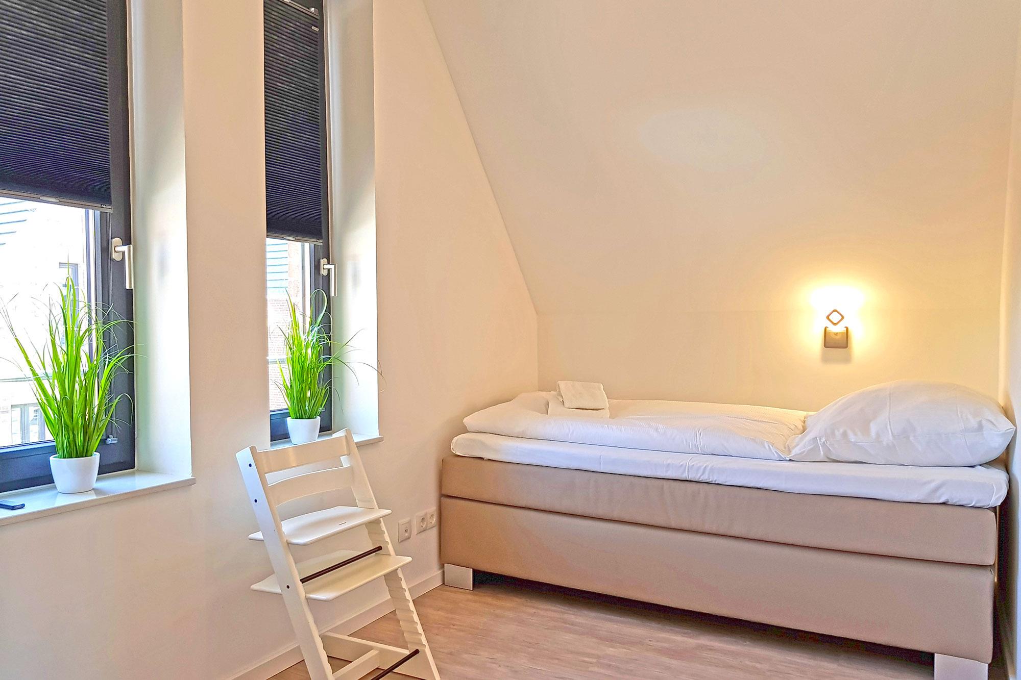 Die Ostsee Perle 35 eignet sich ideal für Familien und kleine Gruppen, denn das Haus verfügt über drei komfortable Schlafzimmer mit hochwertigen Boxspringbetten. Im ersten Obergeschoss befindet sich ein großzügiges Doppelboxspringbett mit eigenem TV, während das Dachgeschoss weitere Schlafmöglichkeiten bietet – ein Doppelboxspringbett mit TV sowie zwei Einzelbetten in getrennten Räumen. Für die Kleinsten stehen ein Baby-Reisebett und ein Hochstuhl bereit. Große Fensterfronten sorgen in allen Schlafzimmern für lichtdurchflutete Räume und eine angenehme Atmosphäre. Vorhänge und Plissees garantieren eine verdunkelte Umgebung für erholsame Nächte.