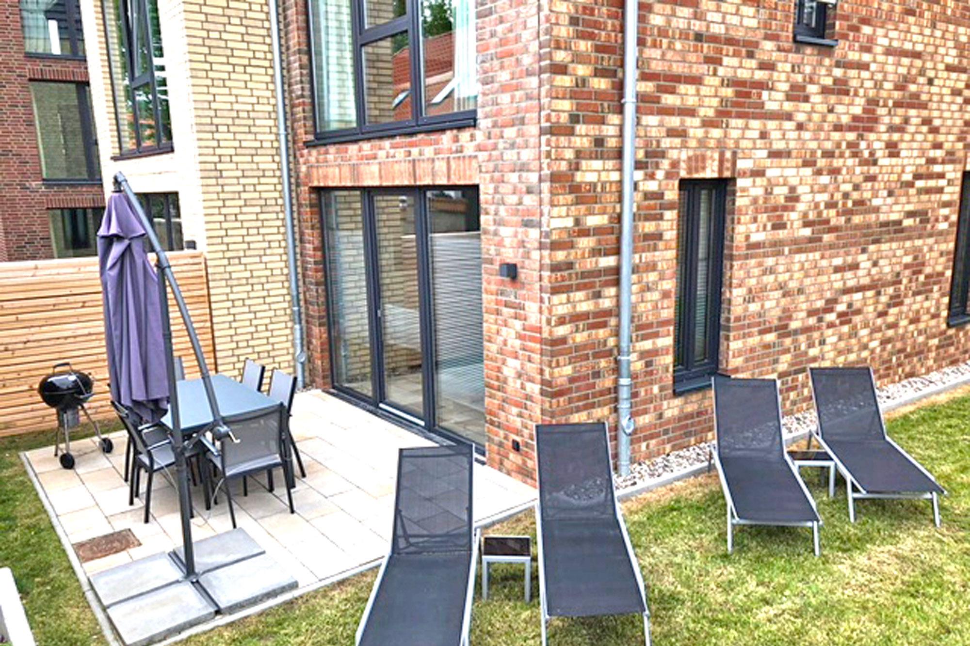 Auf der voll möblierten Terrasse in Süd-West-Ausrichtung genießen Sie sonnige Stunden und laue Abende. Sonnenliegen, ein Sonnenschirm und ein Gasgrill stehen bereit, sodass entspannten Grillabenden im Garten nichts im Wege steht.