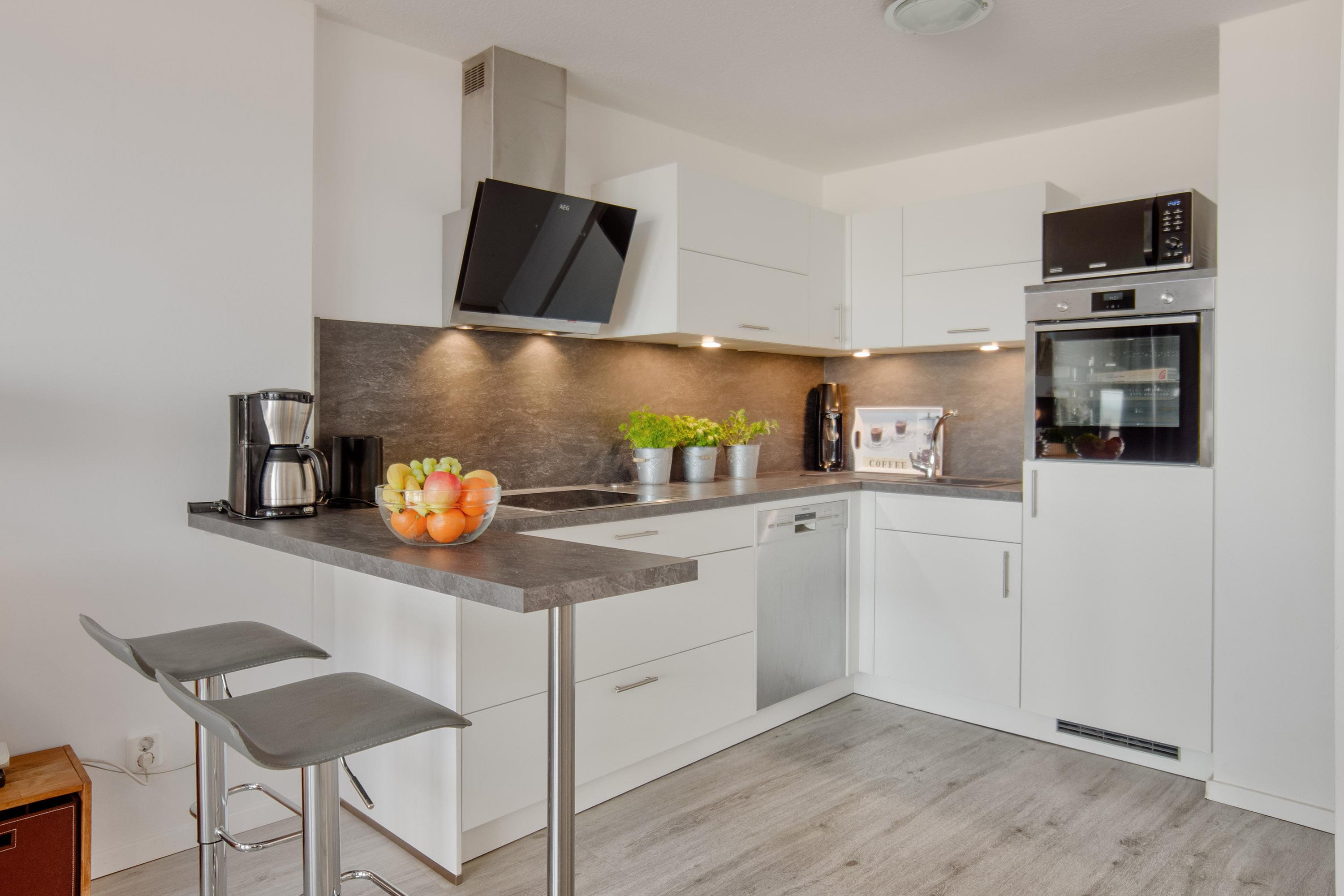 Die moderne und offene Küche mit Vollausstattung lässt keine Wünsche offen. Komfortabel steht dort zudem ein Bistrotisch mit Barhockern für den kleinen Snack zur Verfügung.