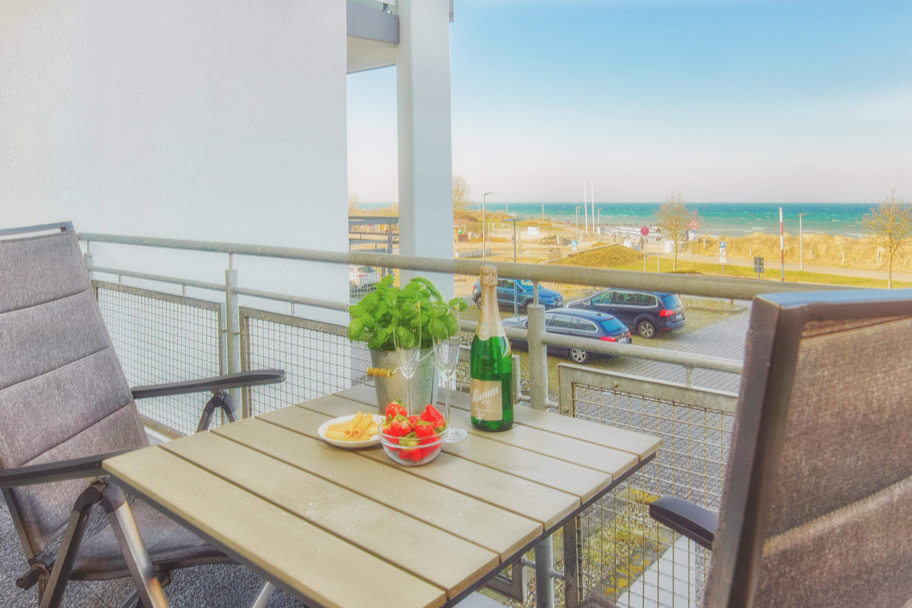 Ein besonderes Highlight dieser Wohnung ist der Balkon, der nicht nur einen beeindruckenden Blick auf das Meer bietet, sondern auch einen einzigartigen Rückzugsort für ungestörte Entspannung darstellt. Da er leicht zurückversetzt gebaut ist, genießen Sie hier mehr Privatsphäre als in anderen Apartments. Lassen Sie sich von der feuerroten Abendsonne verzaubern, die im Sommer direkt im Meer versinkt und den Himmel in ein spektakuläres Farbspiel taucht – ein unvergesslicher Anblick! Der Balkon ist mit einem Tisch und Stühlen ausgestattet und lädt zum Verweilen ein.