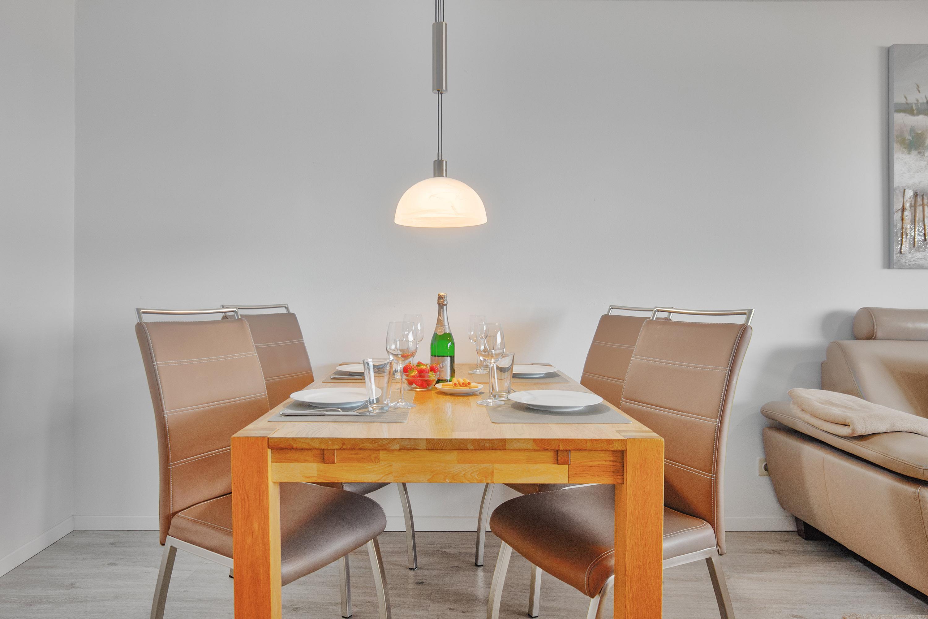 Der offene und großzügige (ca. 37 m²) Wohn- und Essbereich besticht durch eine lichtdurchflutete Panorama-Fensterfront, die einen herrlichen Blick auf die Ostsee und die angrenzenden Dünen bietet. Eine große Ledereckcouch mit Schlaffunktion lädt zum Entspannen ein, während der moderne 55-Zoll-LCD-TV mit Grundig-Soundsystem für beste Unterhaltung sorgt. Ein Esstisch für vier Personen rundet den Wohnbereich ab und bietet den perfekten Platz für gemeinsame Mahlzeiten oder einen gemütlichen Spieleabend – Gesellschaftsspiele und Bestseller-Bücher stehen zur Verfügung.