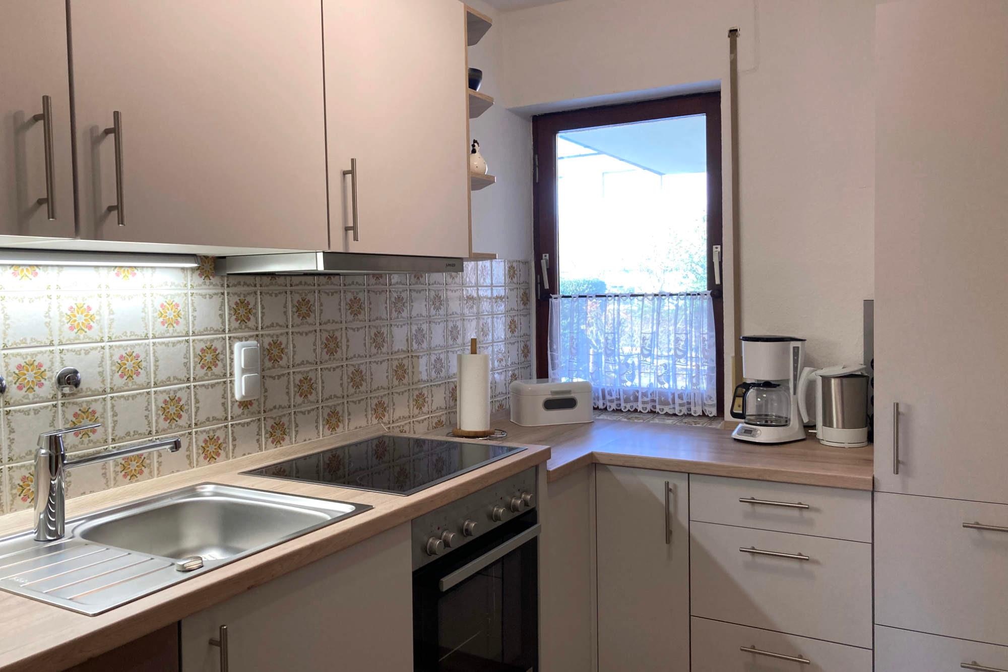 Die Küche ist funktional und gut ausgestattet und bietet alles, was Sie für die Selbstversorgung während Ihres Aufenthaltes benötigen. Zur Ausstattung gehören ein Herd mit vier Kochfeldern, ein Backofen mit Grillfunktion, ein Geschirrspüler, eine Kaffeemaschine, ein Wasserkocher sowie weitere nützliche Küchenutensilien. So lassen sich Mahlzeiten bequem und flexibel zubereiten.