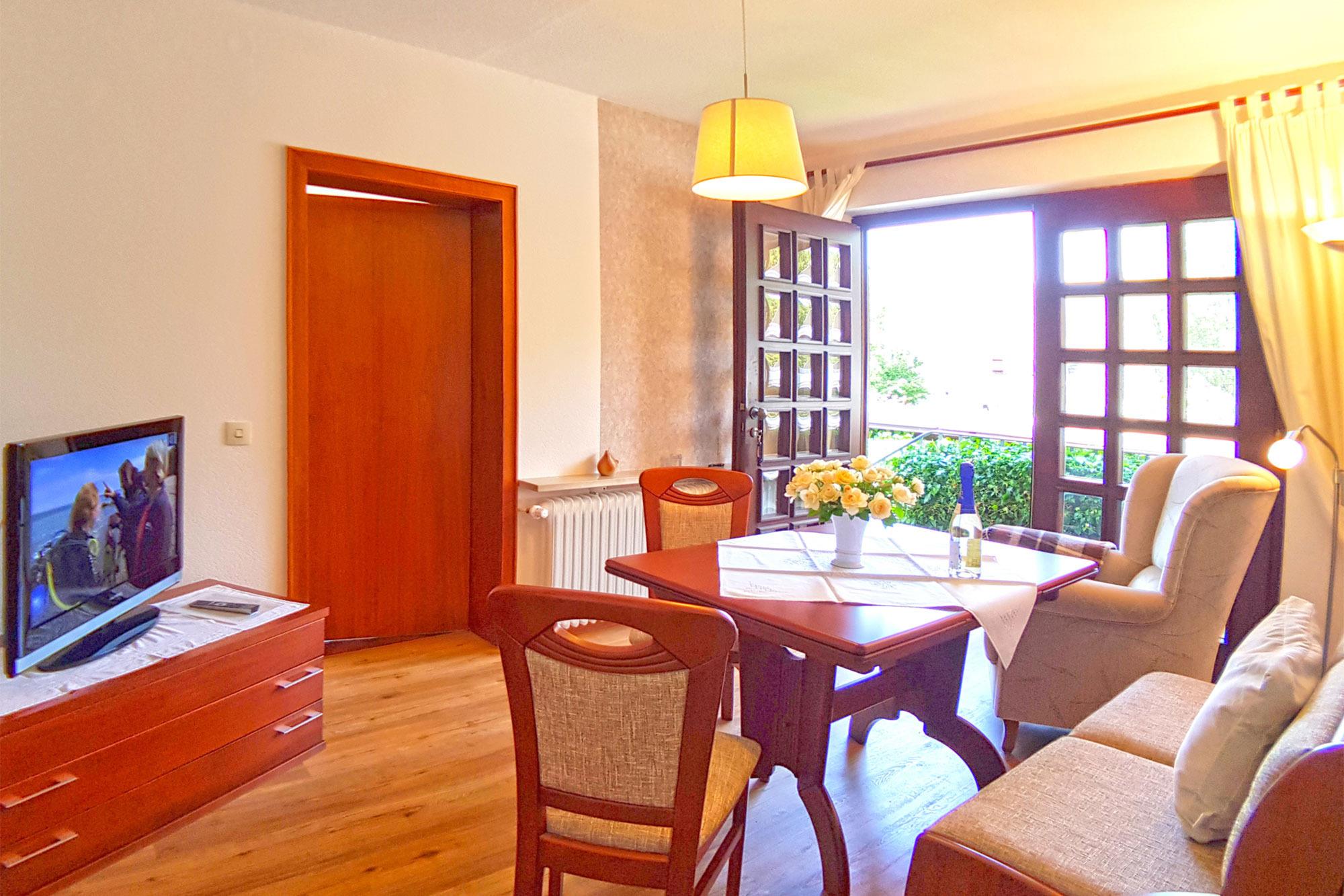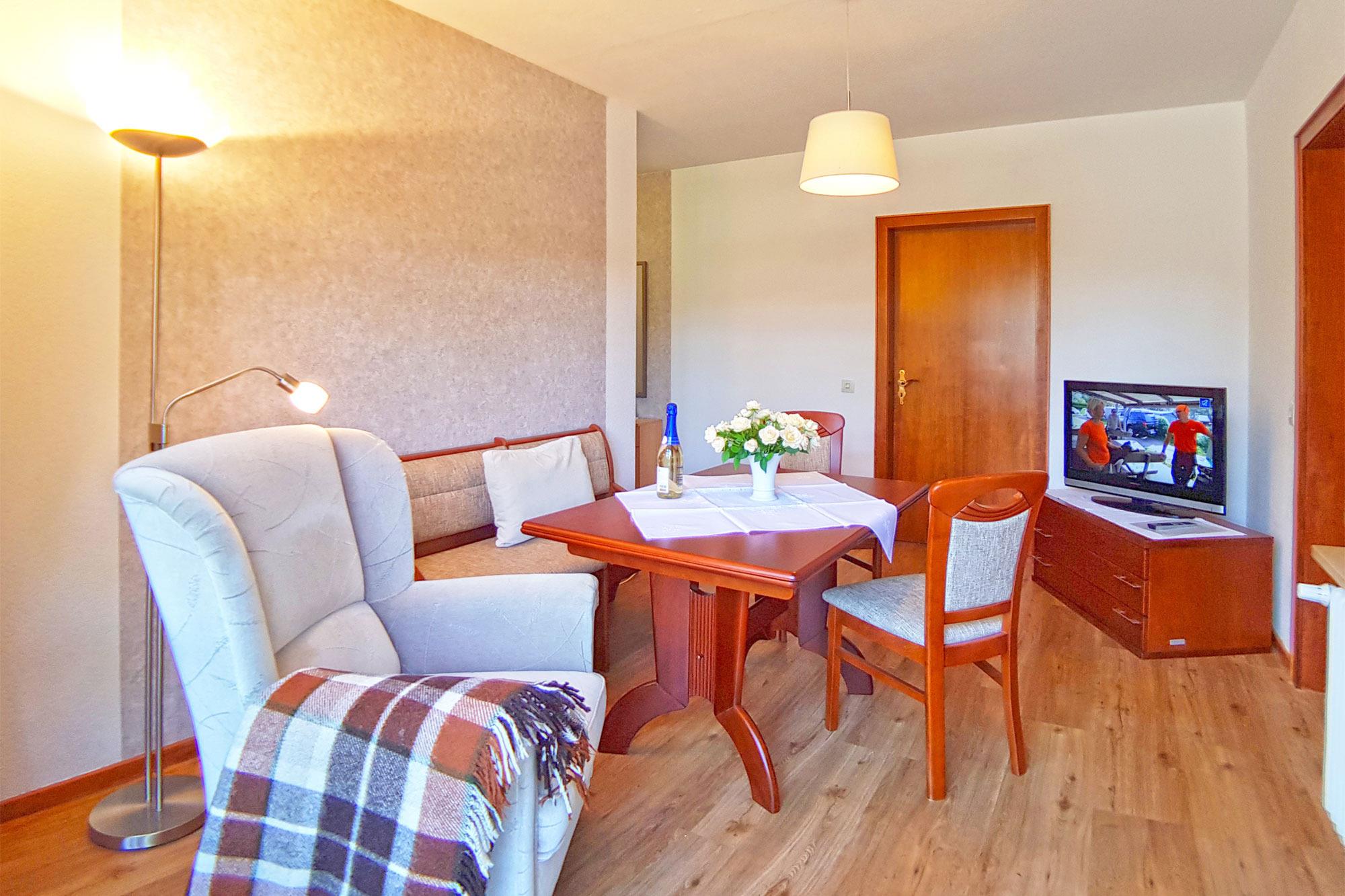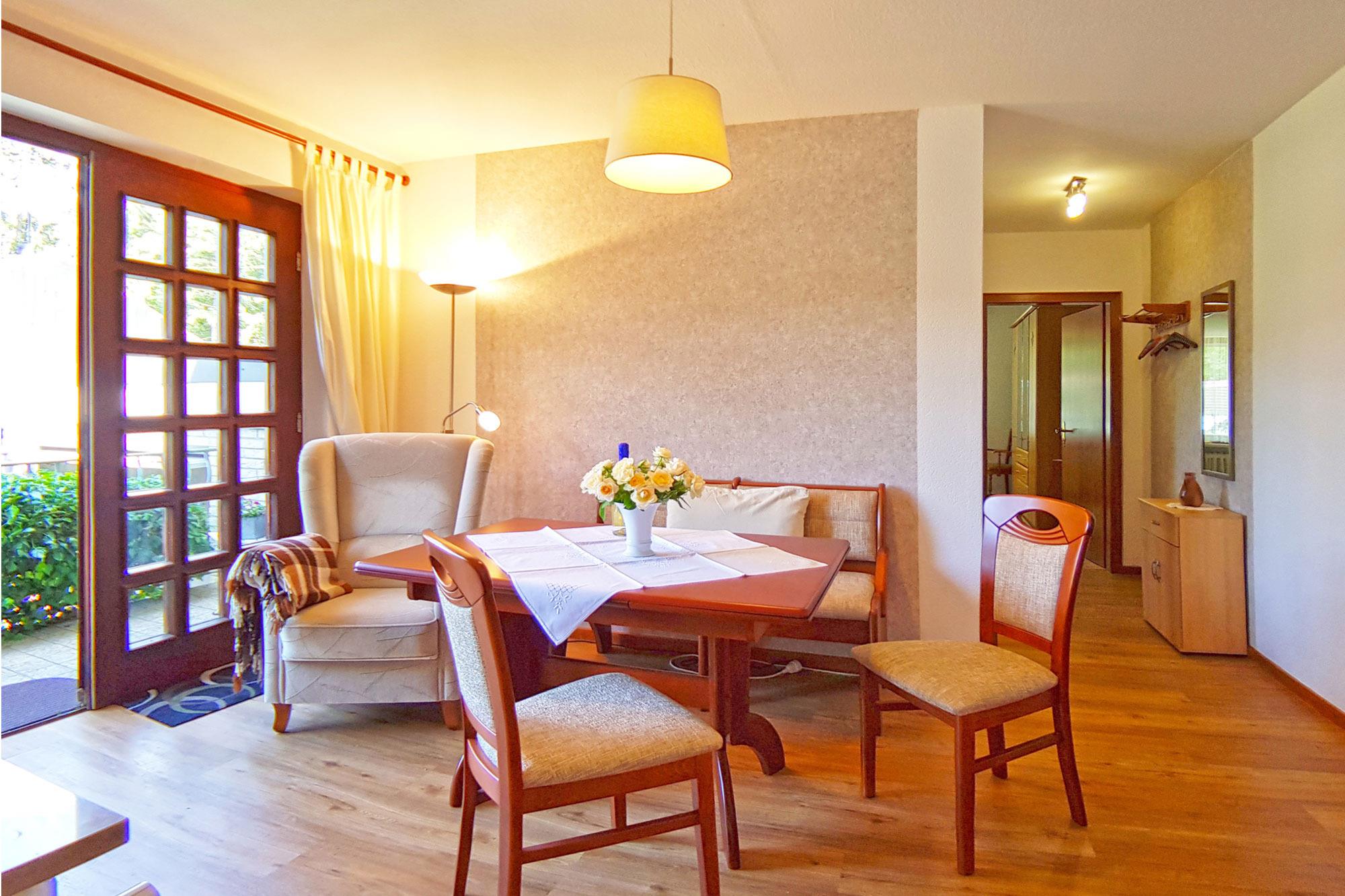Herzstück der Wohnung ist der helle Wohn- und Essbereich, der geschmackvoll eingerichtet ist und eine angenehme Atmosphäre für gemeinsame Stunden schafft. Hier können Sie entspannen, den Urlaubstag Revue passieren lassen oder gemütliche Abende verbringen. Zur Ausstattung gehören ein Flat-TV, WLAN sowie wohnungstypische, komfortable Möbel. Teilweise sorgt ein Teppichboden im Wohnbereich für zusätzliche Behaglichkeit.