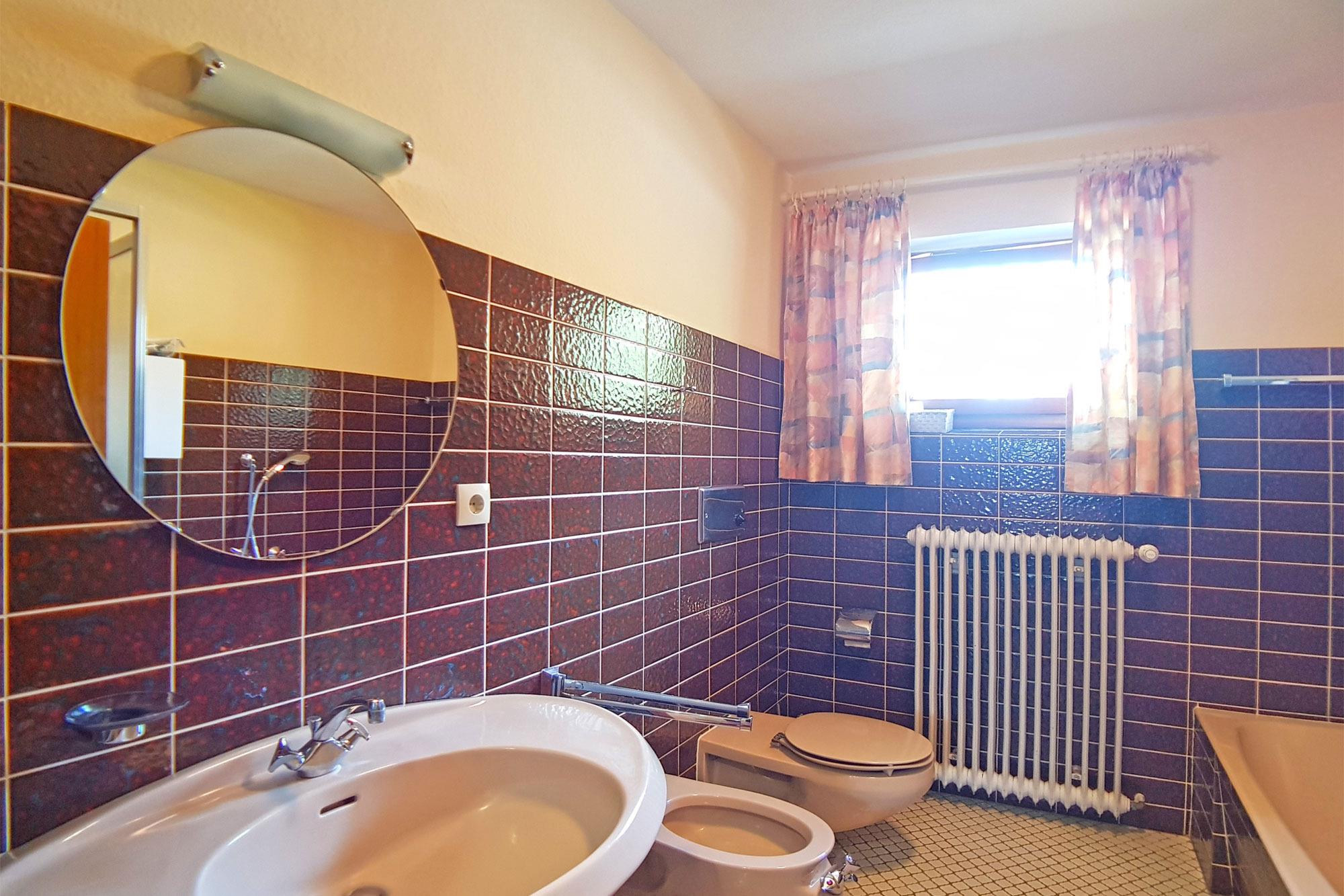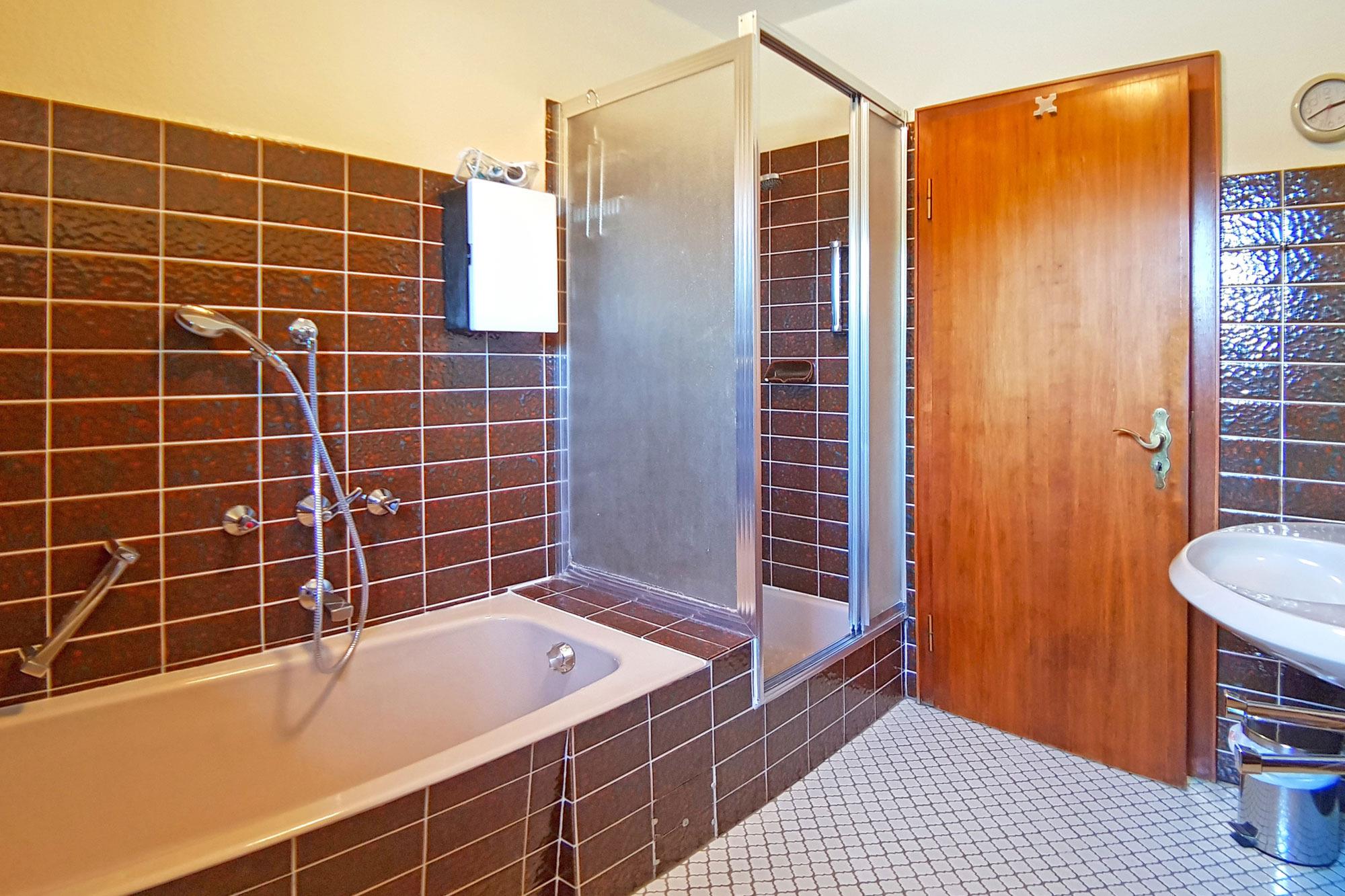 Das Badezimmer ist gefliest und gepflegt gestaltet und rundet den Wohnkomfort der Ferienwohnung harmonisch ab. Eine Waschmaschine kann beim Vermieter auf Anfrage genutzt werden – besonders praktisch bei längeren Aufenthalten oder mit Kindern.