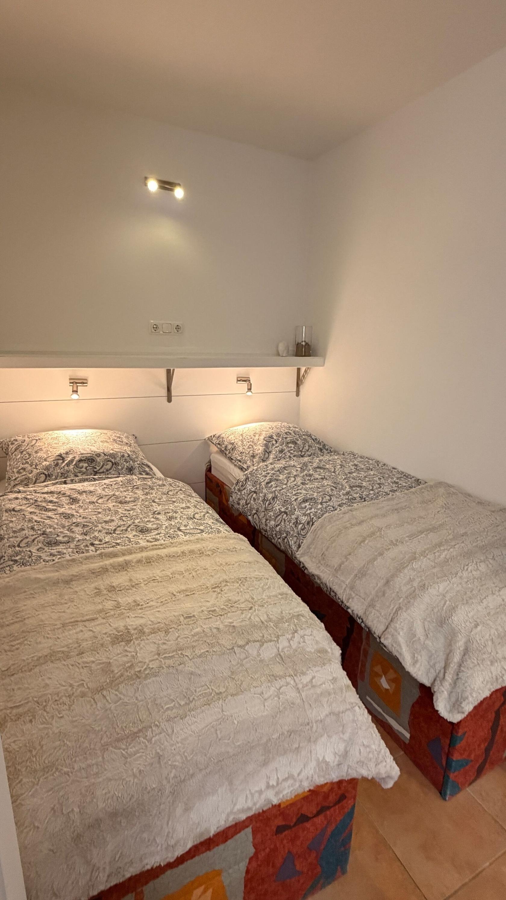 Die Schlafmöglichkeiten sind durchdacht gestaltet: Ein separates Schlafzimmer ist mit einem komfortablen Doppelbett ausgestattet und bietet einen ruhigen Rückzugsort. Zusätzlich befindet sich im Wohnbereich ein offener Schlafbereich mit zwei Einzelbetten, der durch einen Vorhang optisch abgetrennt ist – ideal für Kinder oder weitere Mitreisende.