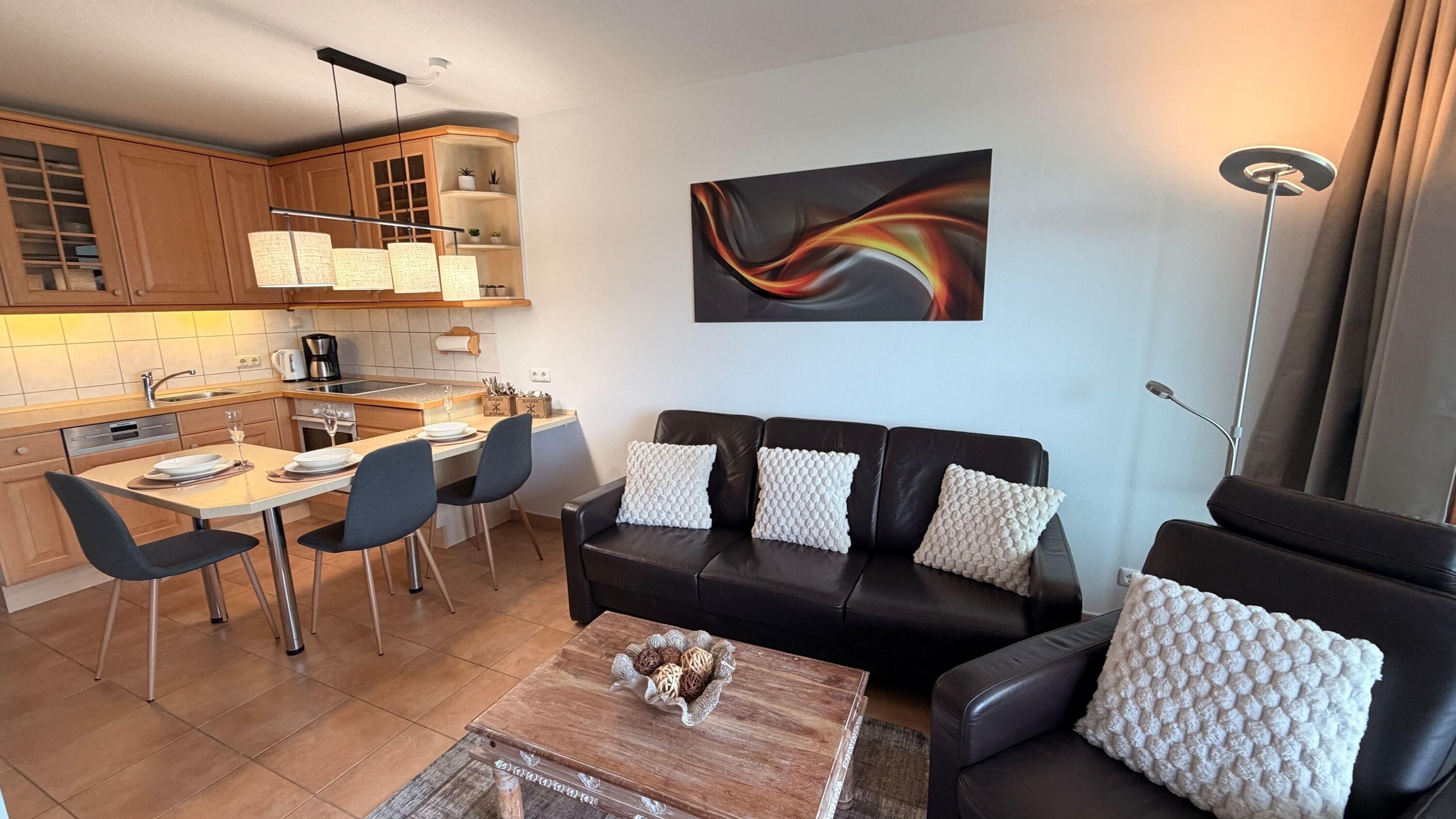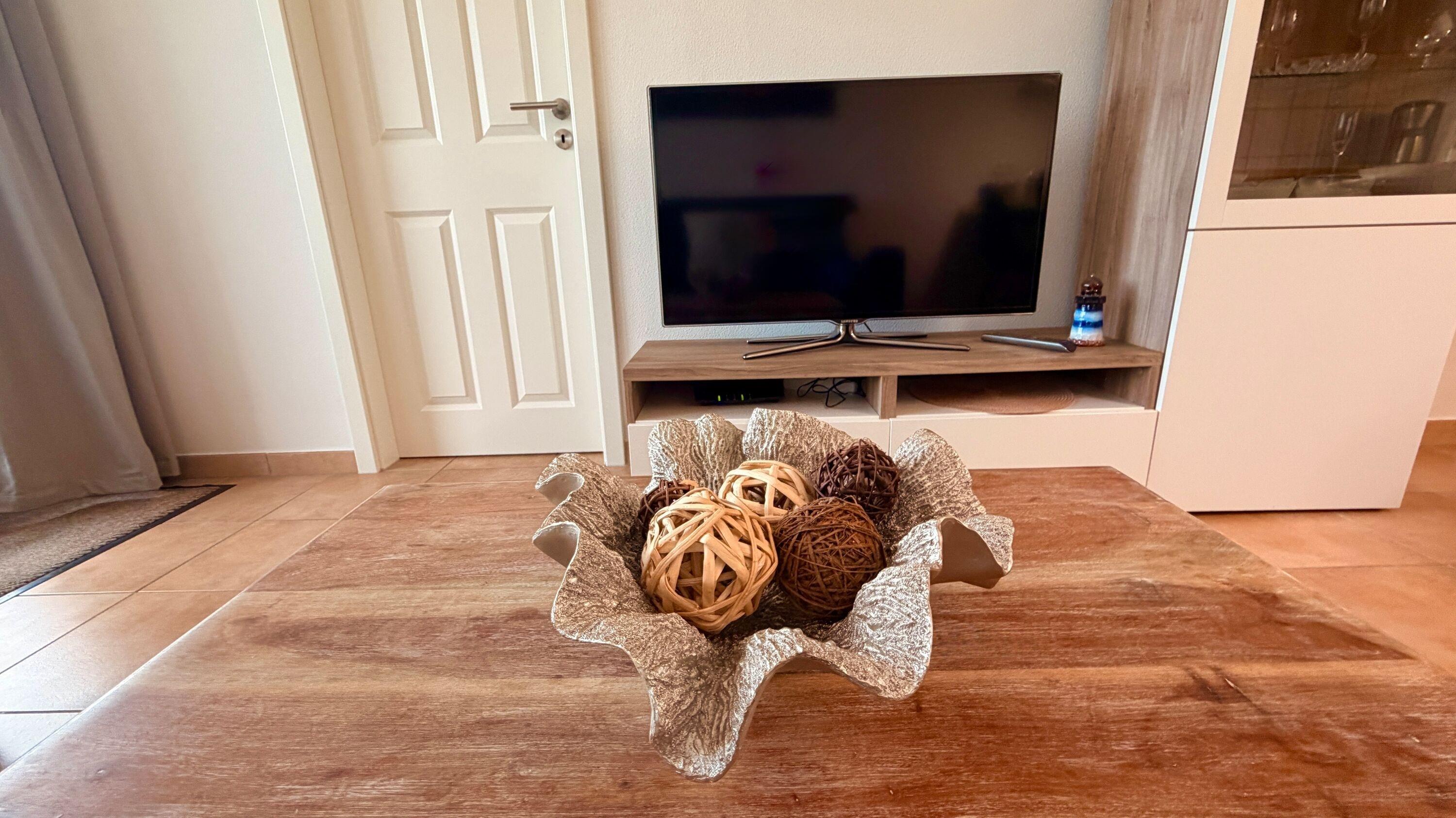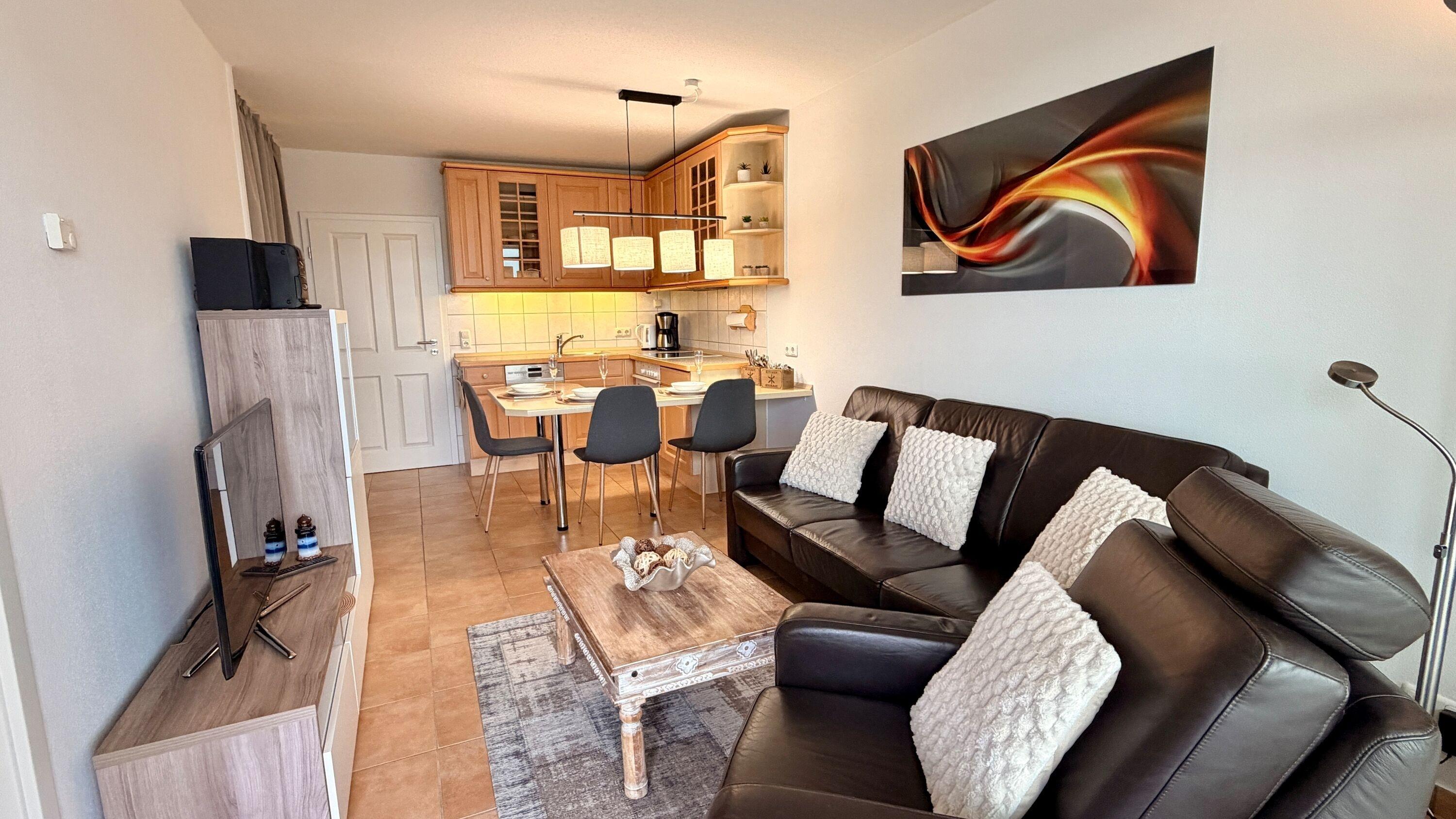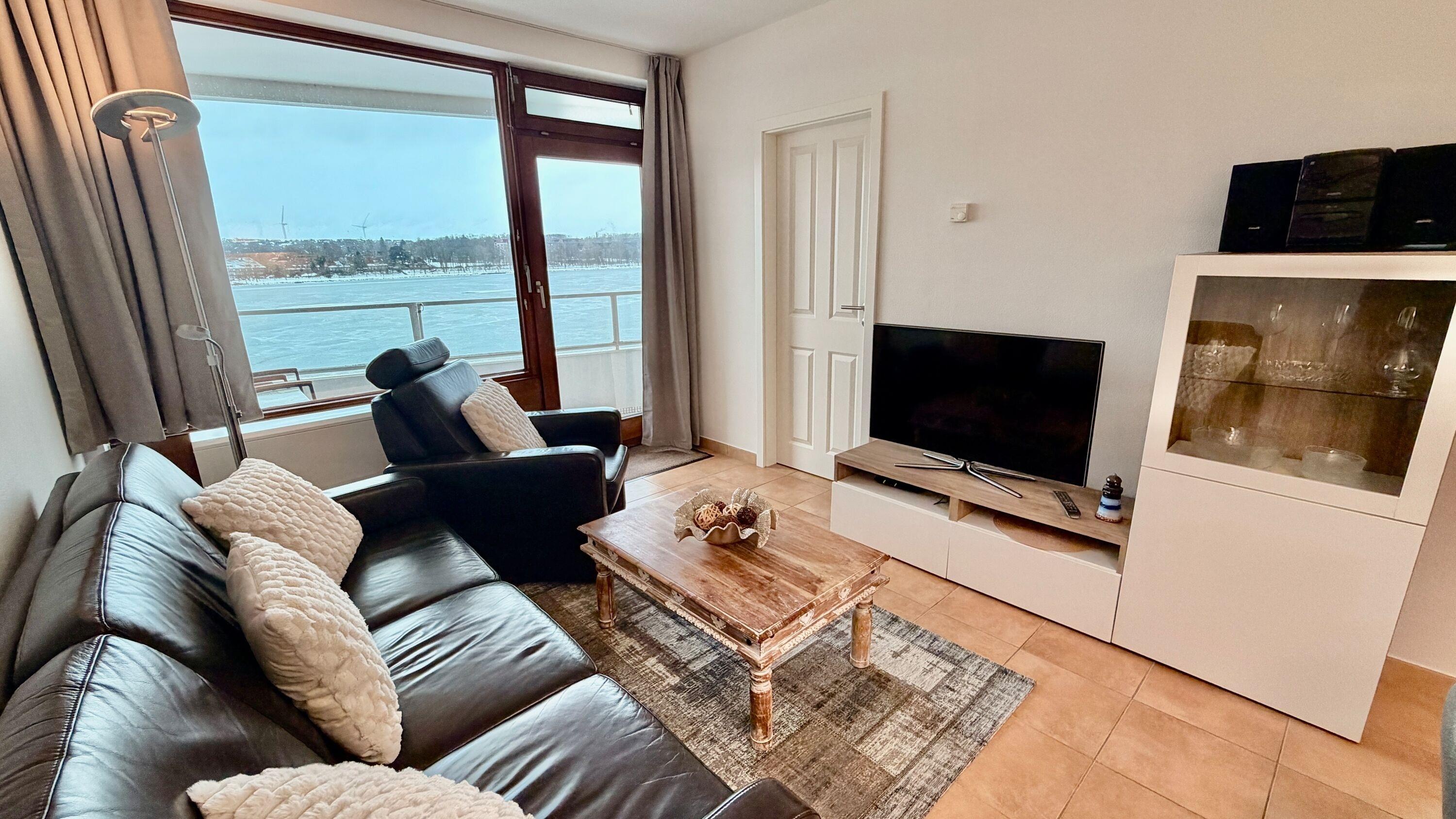 Herzstück der Wohnung ist der freundliche Wohnbereich, der zum Entspannen und Verweilen einlädt. Hier können Sie nach einem erlebnisreichen Urlaubstag zur Ruhe kommen, gemeinsam essen oder einen gemütlichen Fernsehabend verbringen. Vom Wohnbereich aus gelangen Sie direkt auf den Balkon, der Ihnen einen herrlichen Blick über den Binnensee bietet. Dieser Ausblick sorgt zu jeder Tageszeit für echtes Urlaubsgefühl – ob beim Frühstück an der frischen Luft oder beim entspannten Ausklang des Abends.