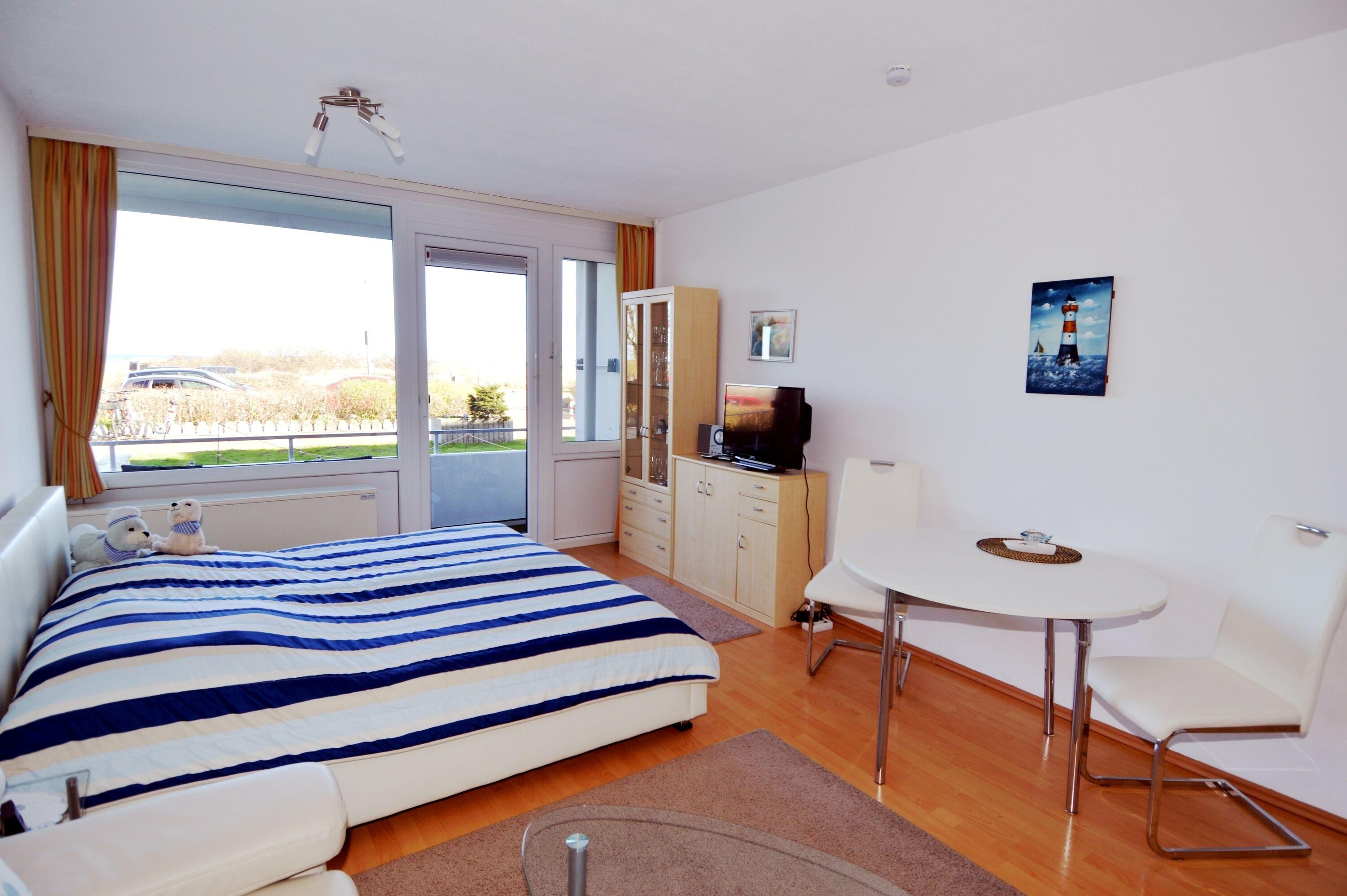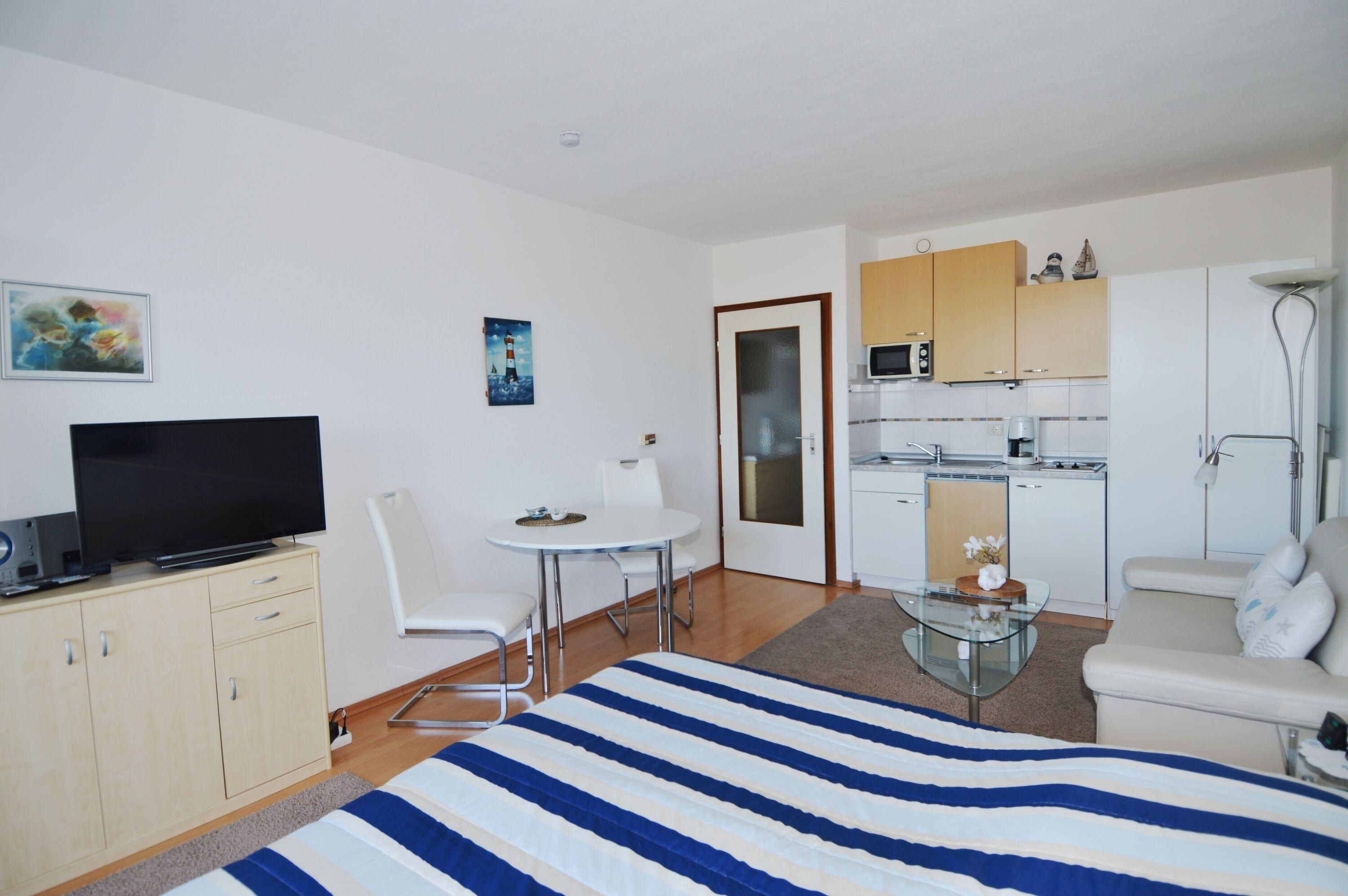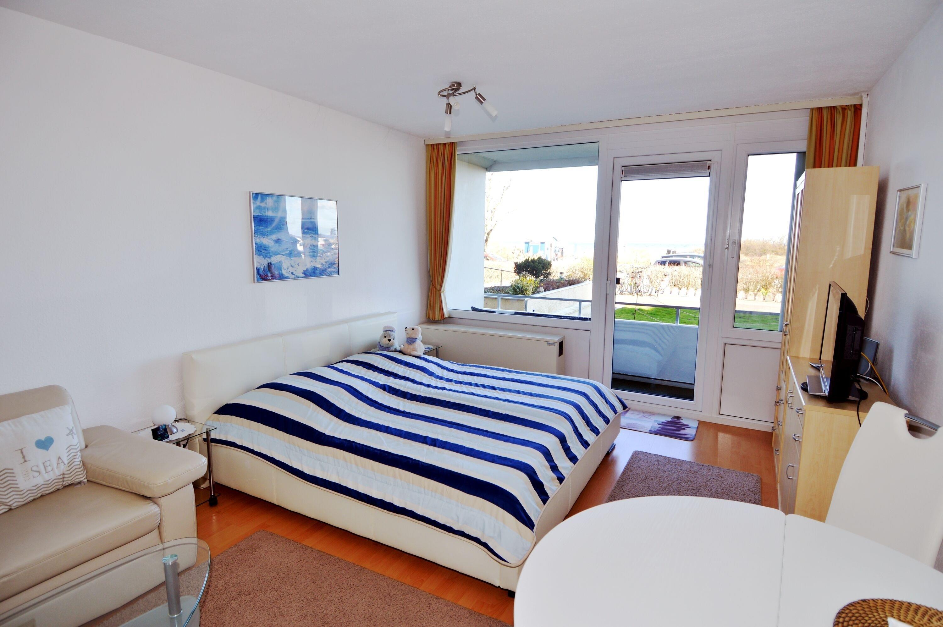 Herzstück der Wohnung ist der helle Wohn- und Schlafbereich, der freundlich gestaltet ist und eine angenehme Wohlfühlatmosphäre schafft. Hier können Sie nach einem erlebnisreichen Strandtag entspannen, den Blick nach draußen genießen oder den Abend ruhig ausklingen lassen.