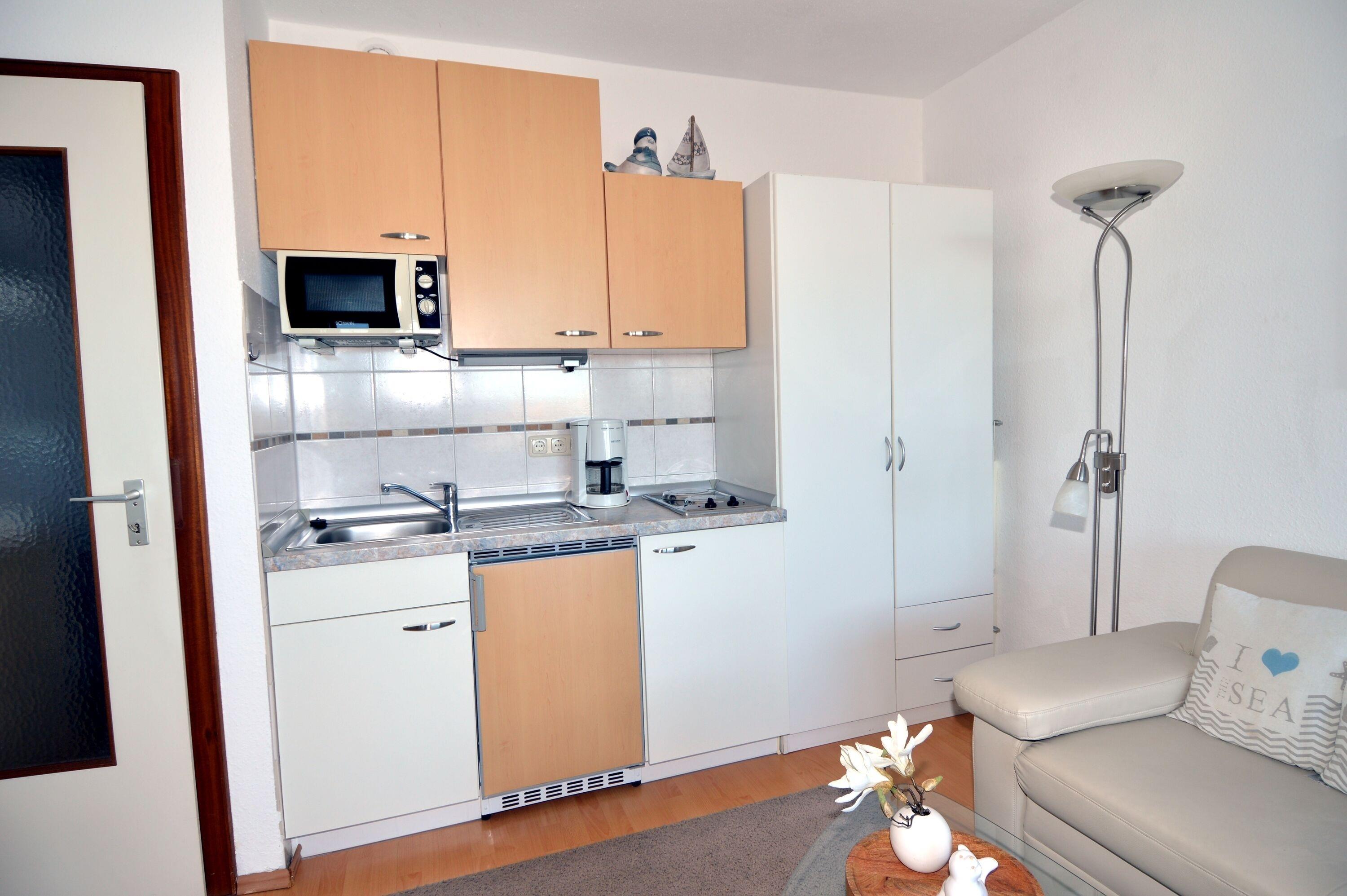 Die kleine, funktionale Küche ist praktisch in die Wohnung integriert und bietet alles, was Sie für die Selbstversorgung während Ihres Aufenthaltes benötigen. Ein Kühlschrank sowie eine Mikrowelle stehen Ihnen zur Verfügung, sodass Sie sich bequem ein Frühstück oder kleine Mahlzeiten zubereiten können.