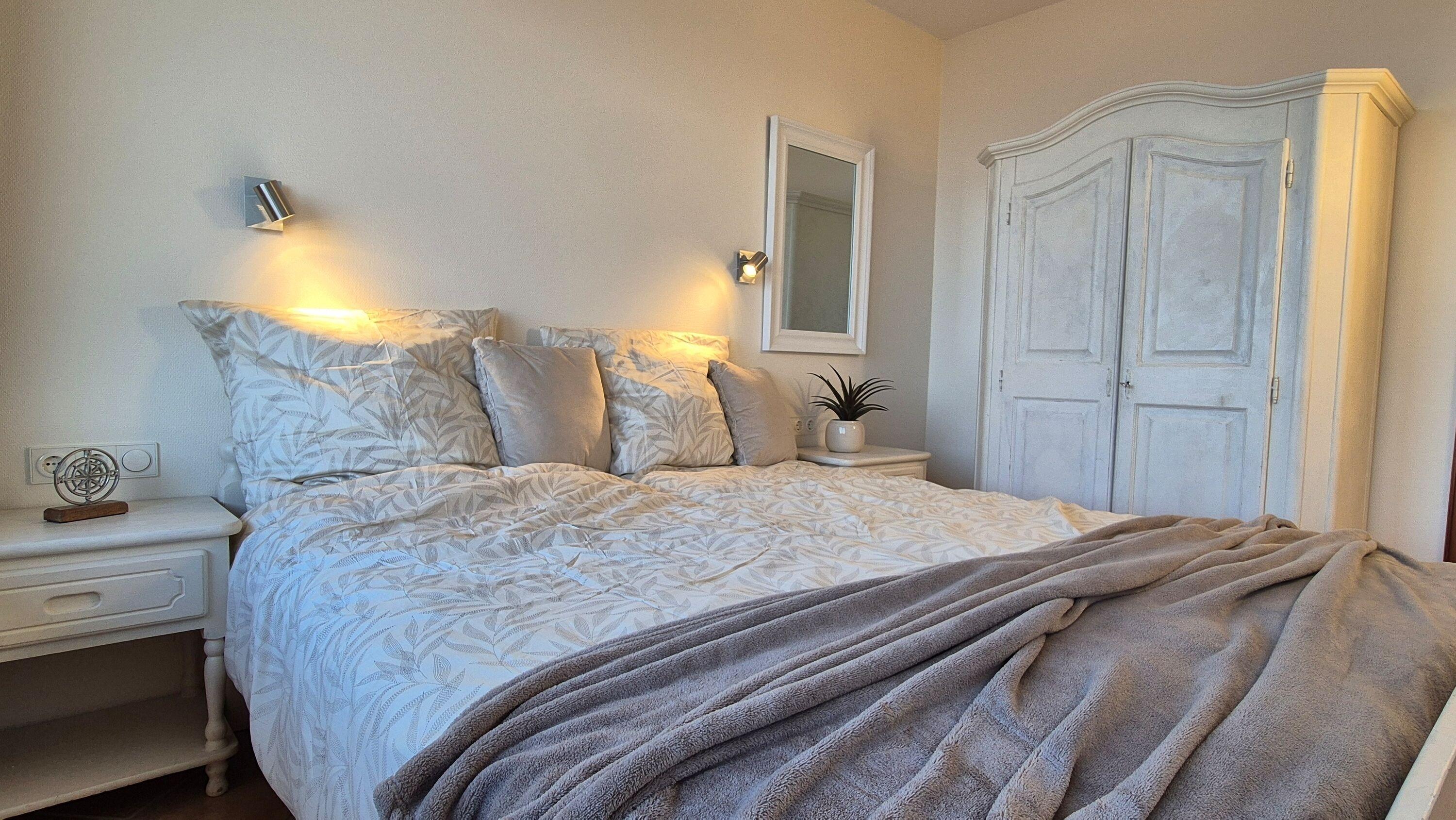 Die Ferienwohnung verfügt über zwei separate Schlafzimmer, die angenehme Rückzugsmöglichkeiten bieten. Das Elternschlafzimmer ist mit einem Doppelbett (180 x 200 cm) ausgestattet und bietet ebenfalls Meerblick, sodass Sie schon beim Aufwachen die Ostsee sehen können. Das Kinderzimmer ist mit einem Etagenbett eingerichtet und eignet sich ideal für jüngere Gäste.