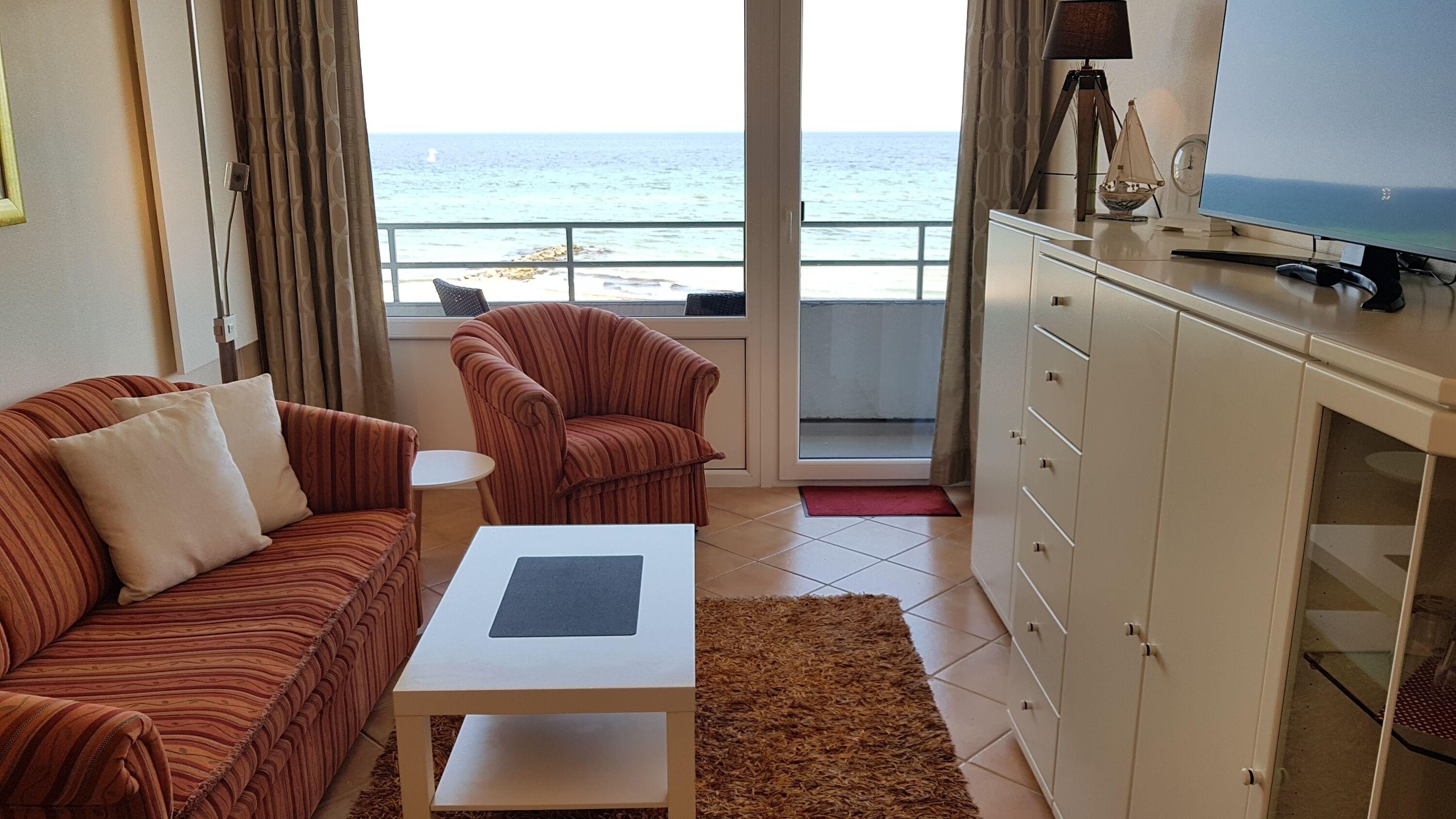 Herzstück der Ferienwohnung ist der helle Wohn- und Essbereich mit direktem Meerblick. Hier laden ein gemütliches Sofa und ein Sessel zum Entspannen ein, während der Esstisch mit vier Stühlen ausreichend Platz für gemeinsame Mahlzeiten bietet. Auf dem Sideboard stehen ein 43-Zoll-Smart-TV sowie ein WLAN-Radio zur Verfügung, sodass auch Unterhaltung und digitale Annehmlichkeiten nicht zu kurz kommen.