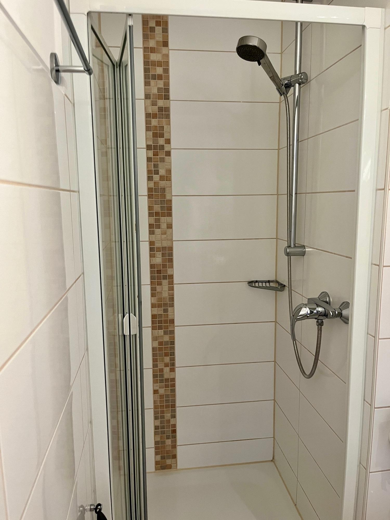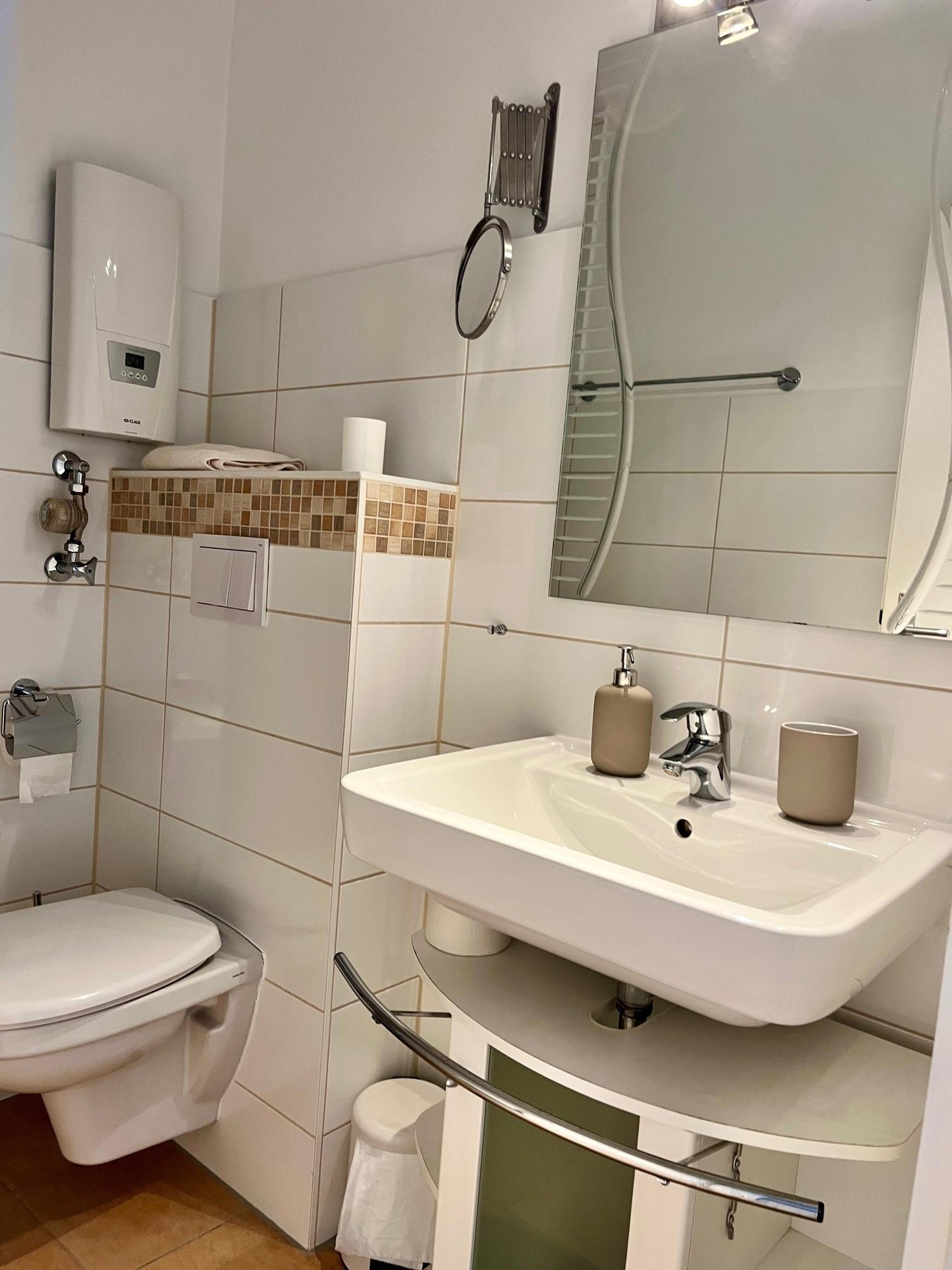 Das Badezimmer ist funktional gestaltet und verfügt über Dusche, Waschbecken und WC. Es bietet ausreichend Platz für die tägliche Nutzung und rundet den Wohnkomfort der Ferienwohnung ab.