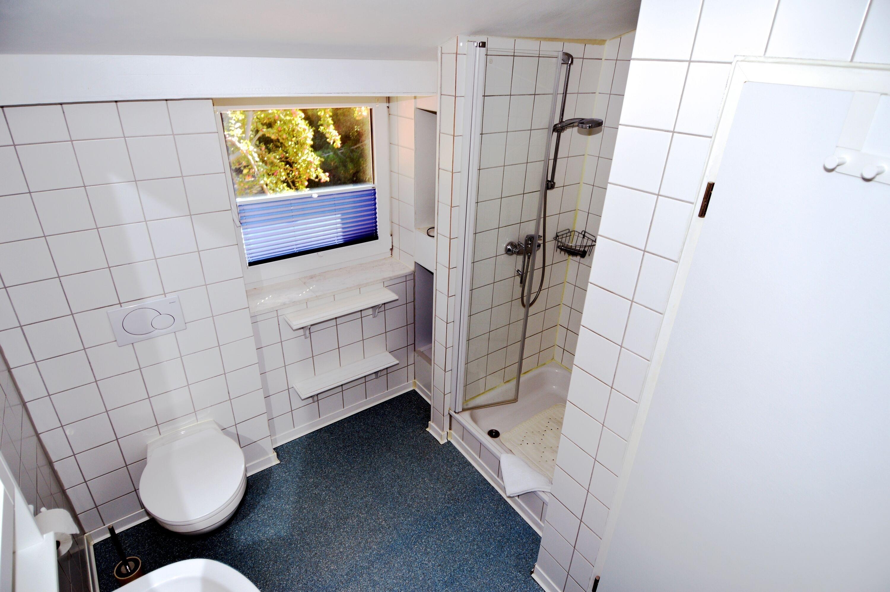 Das Badezimmer ist gepflegt und praktisch eingerichtet und verfügt über eine Dusche, ein Waschbecken sowie ein WC.
