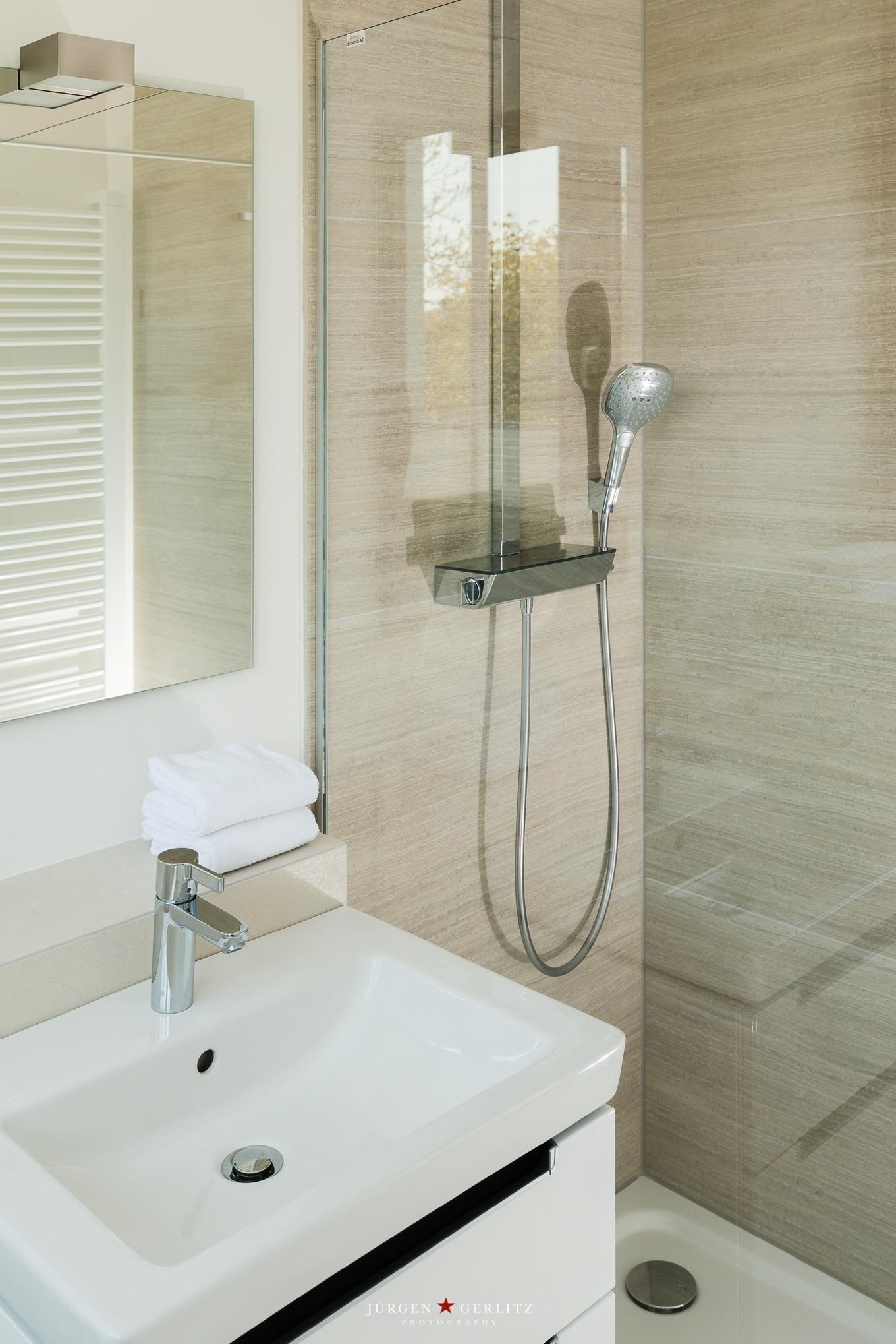 Das Badezimmer ist modern gestaltet und mit einer großzügigen Dusche ausgestattet. Es bietet ausreichend Platz, um sich nach einem erlebnisreichen Urlaubstag zu erfrischen und zu entspannen.