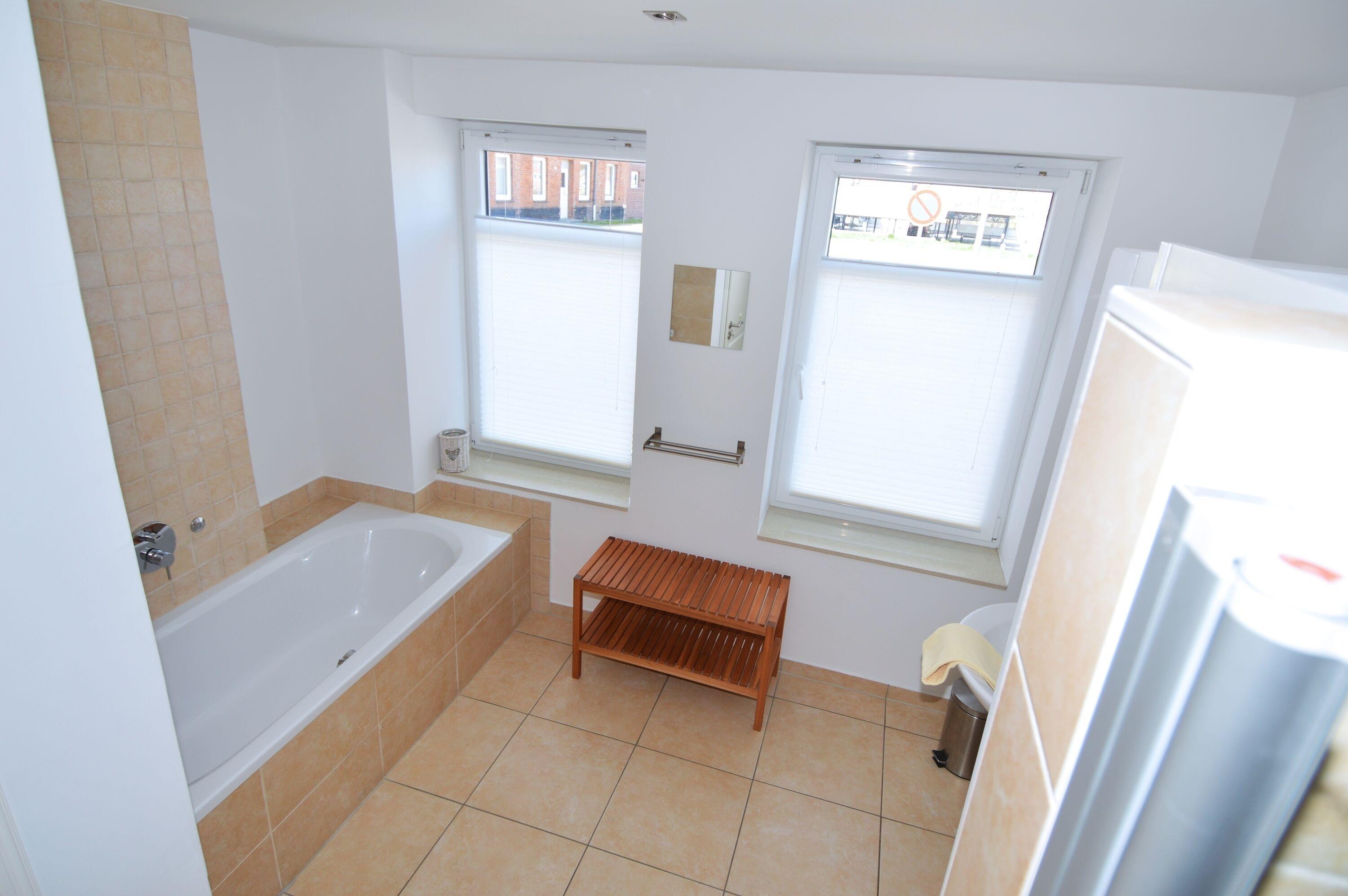 Das moderne Badezimmer verfügt über Badewanne und Dusche und bietet angenehmen Komfort. Zusätzlich steht Ihnen ein separates WC zur Verfügung, was den Aufenthalt besonders praktisch gestaltet.