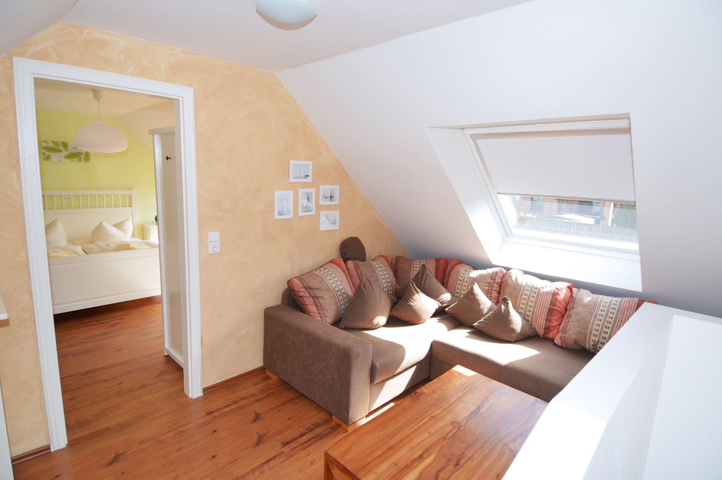 Im Obergeschoss befindet sich das lichtdurchflutete Schlafzimmer mit Doppelbett, Kleiderschrank und einer kleinen Couch – ein ruhiger Rückzugsort für erholsame Nächte. Stauraum ist ausreichend vorhanden, sodass Sie sich auch bei längeren Aufenthalten bequem einrichten können.